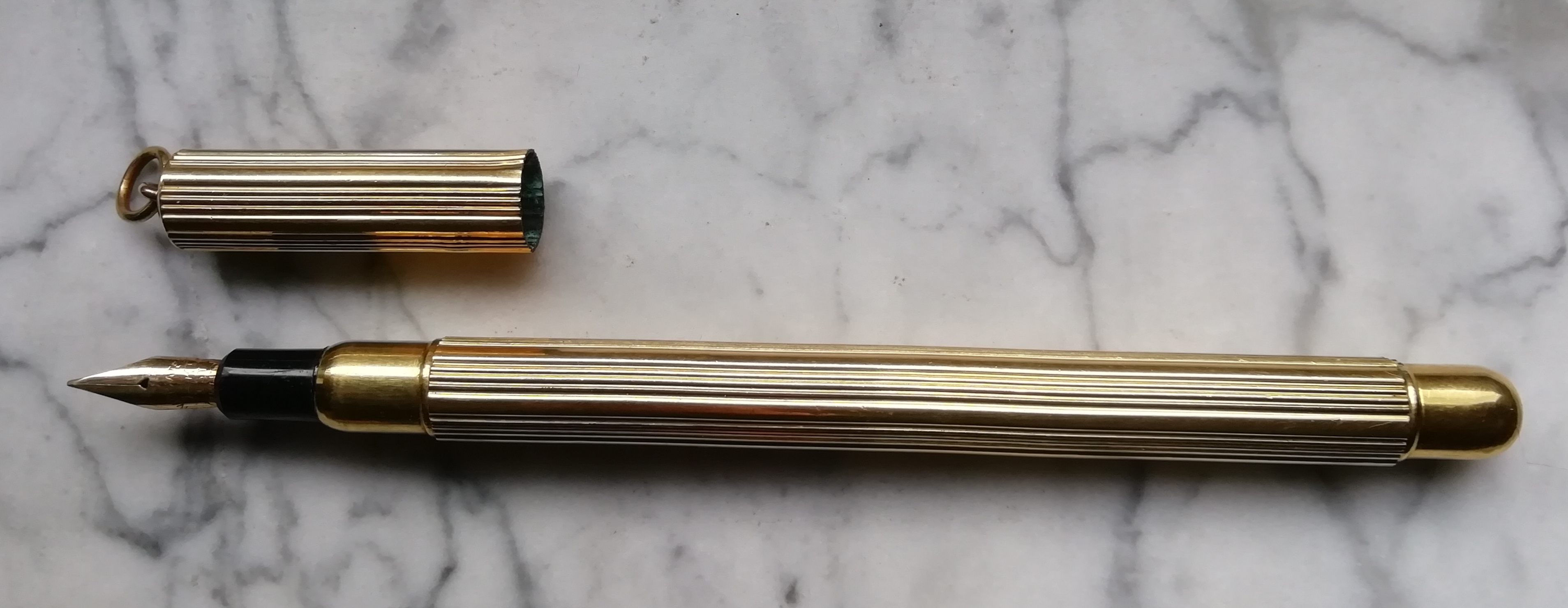 È un contagocce in combo con un portamine telescopico, laminato, probabilmente placcato oro, senza alcuna traccia di sorta di marchi o punzoni.