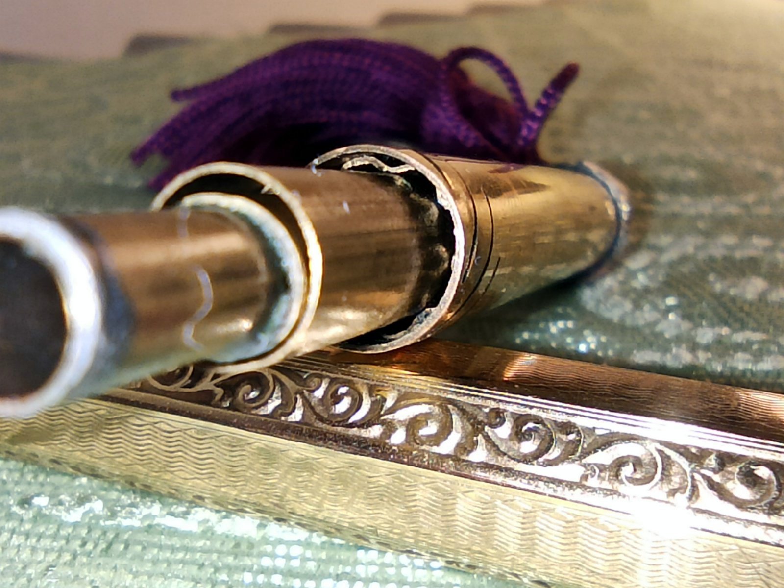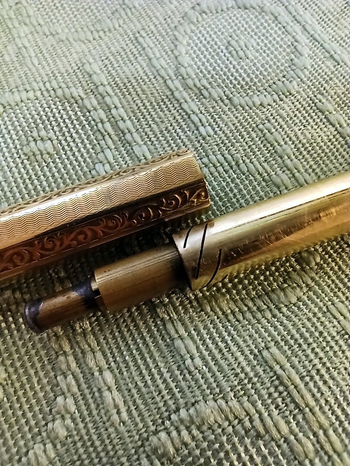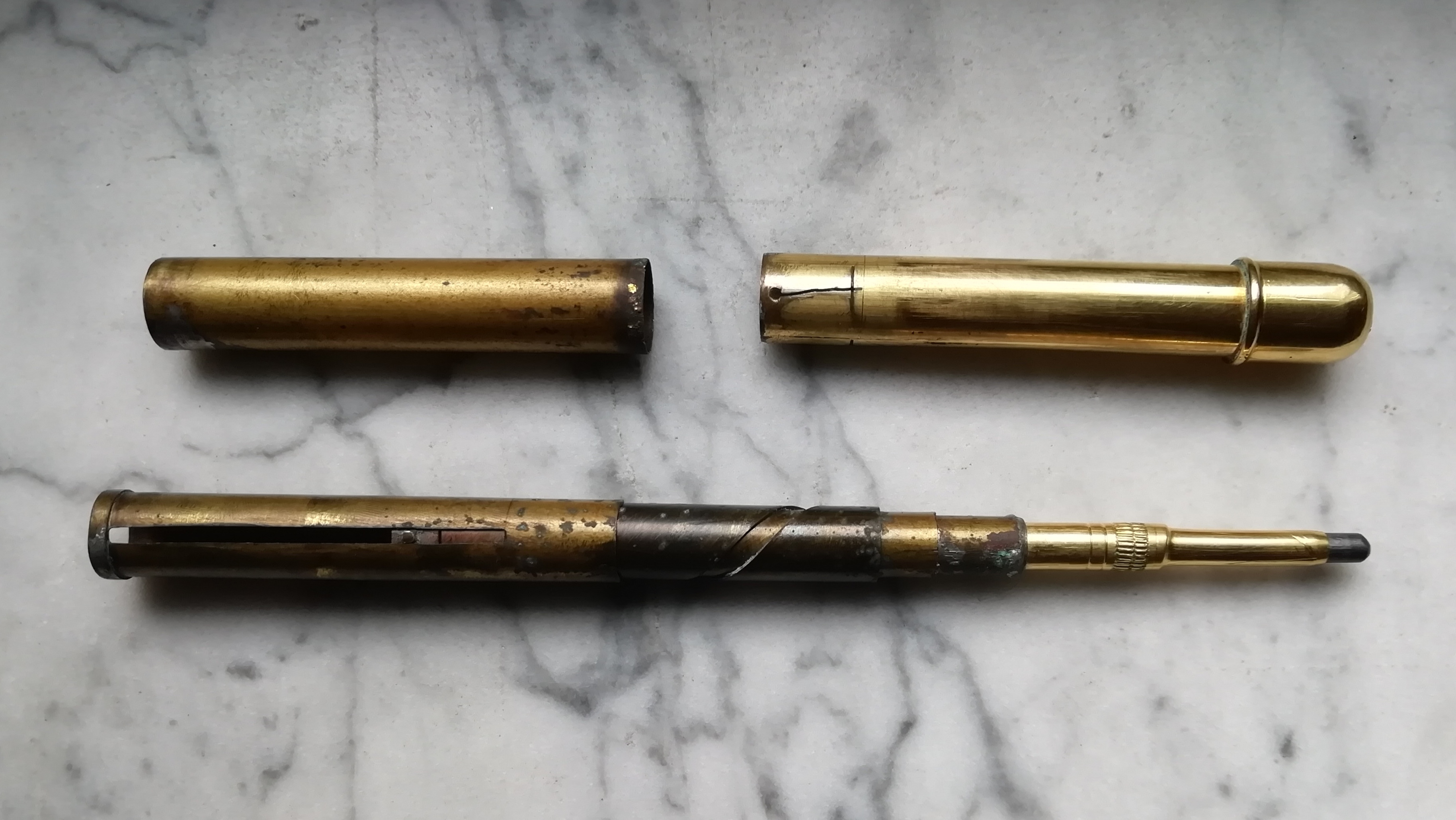 Quello che non sono riuscita a capire è come comporre tra di loro le tre parti, cioè il meccanismo telescopico, il tubo di ottone e il bussolotto forato (quello che funge da fondello alla penna).