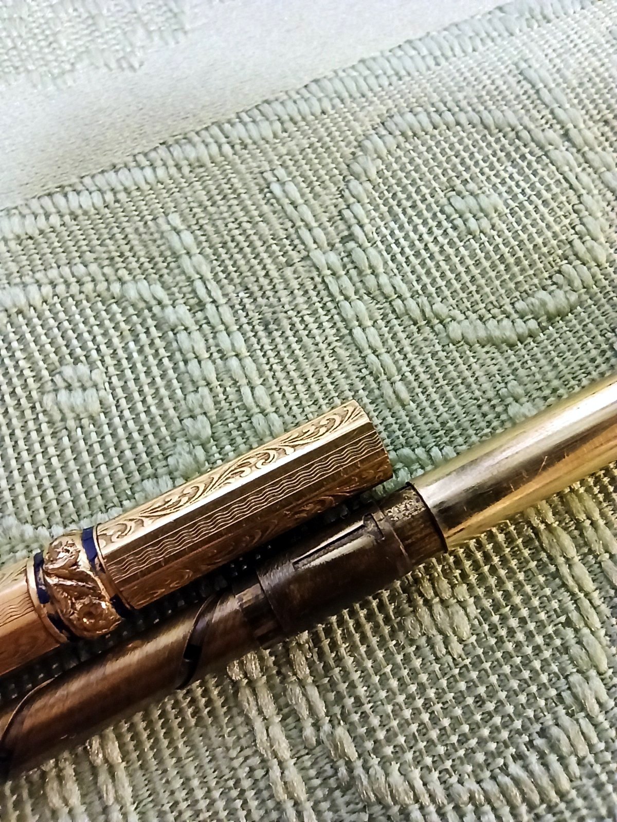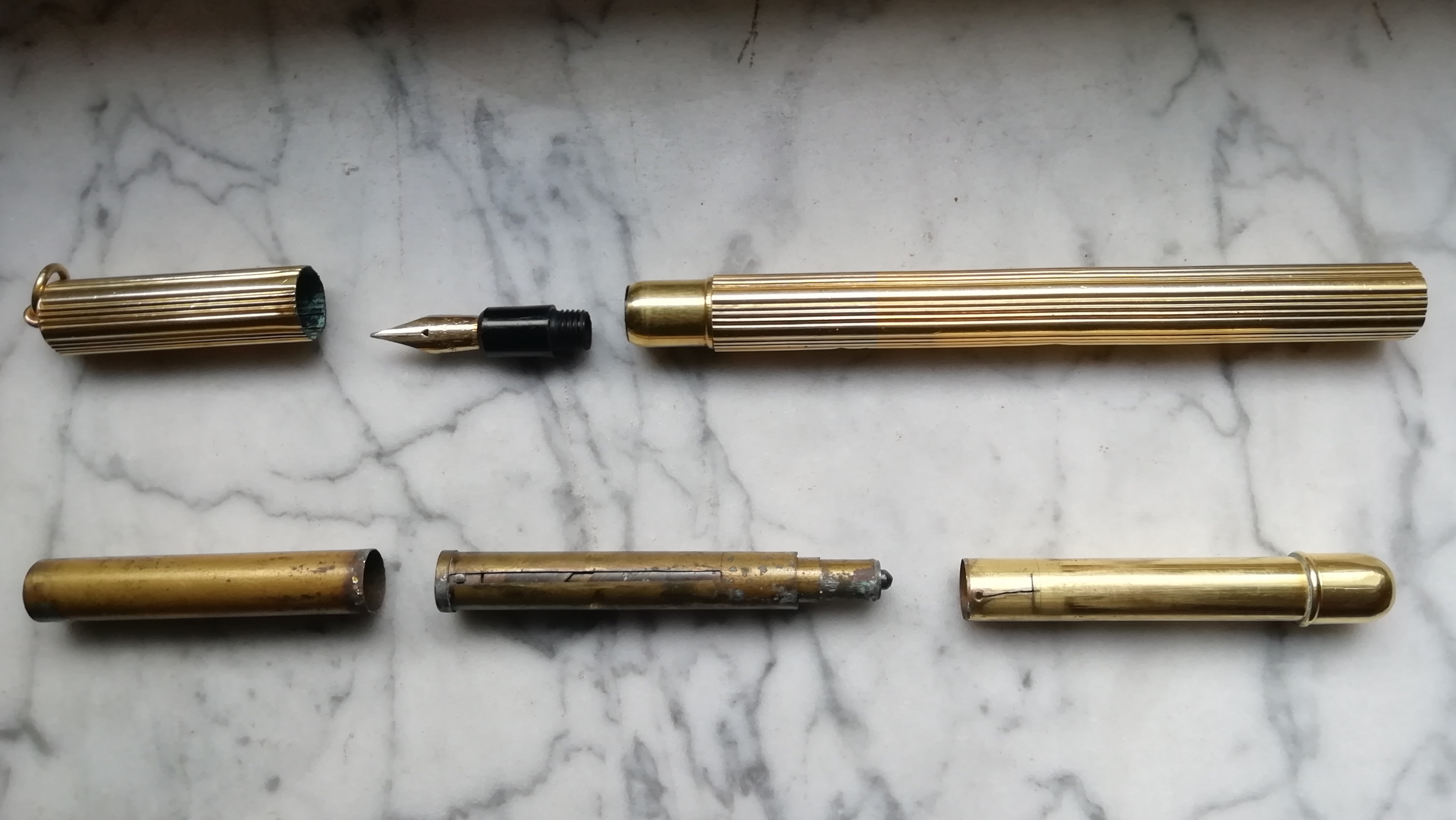 Per quanto riguarda il tuo, credo che abbia che ci sia da rivedere qualcosa: in primo luogo credo vada ripristinata la saldatura che rende solidale parte del meccanismo interno con il cilindretto dorato. Mi ha sorpreso molto che tu sia riuscita a separare il tutto: generalmente una delle estremita è fissata molto tenacemente al corpo della penna/matita. :think: