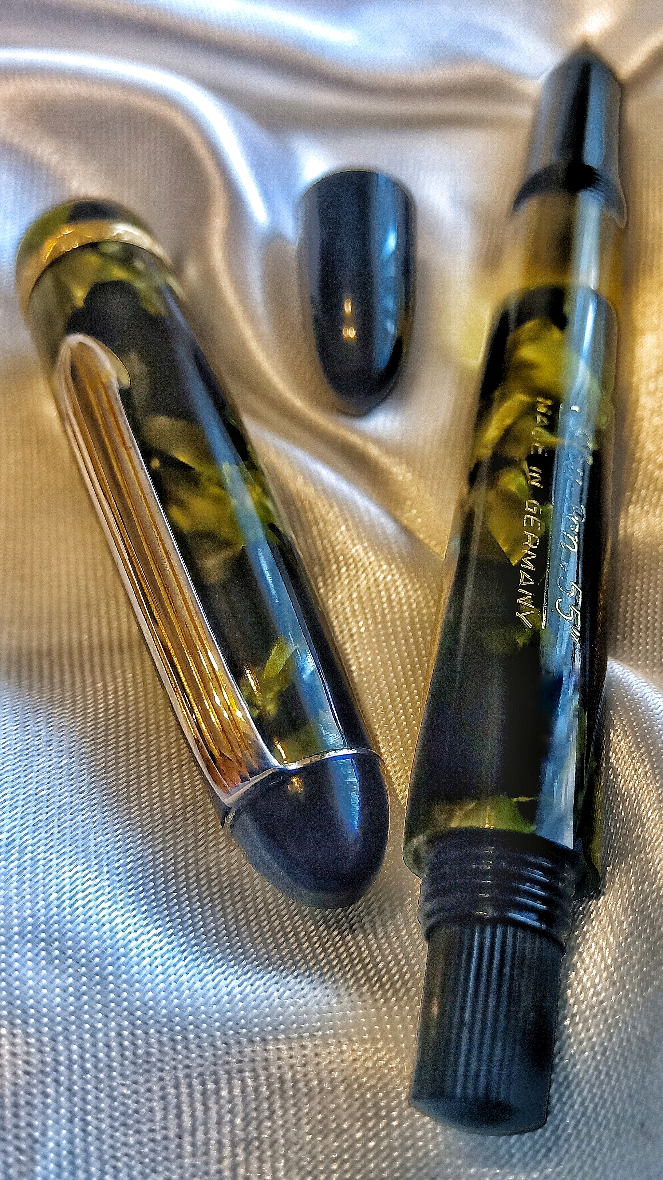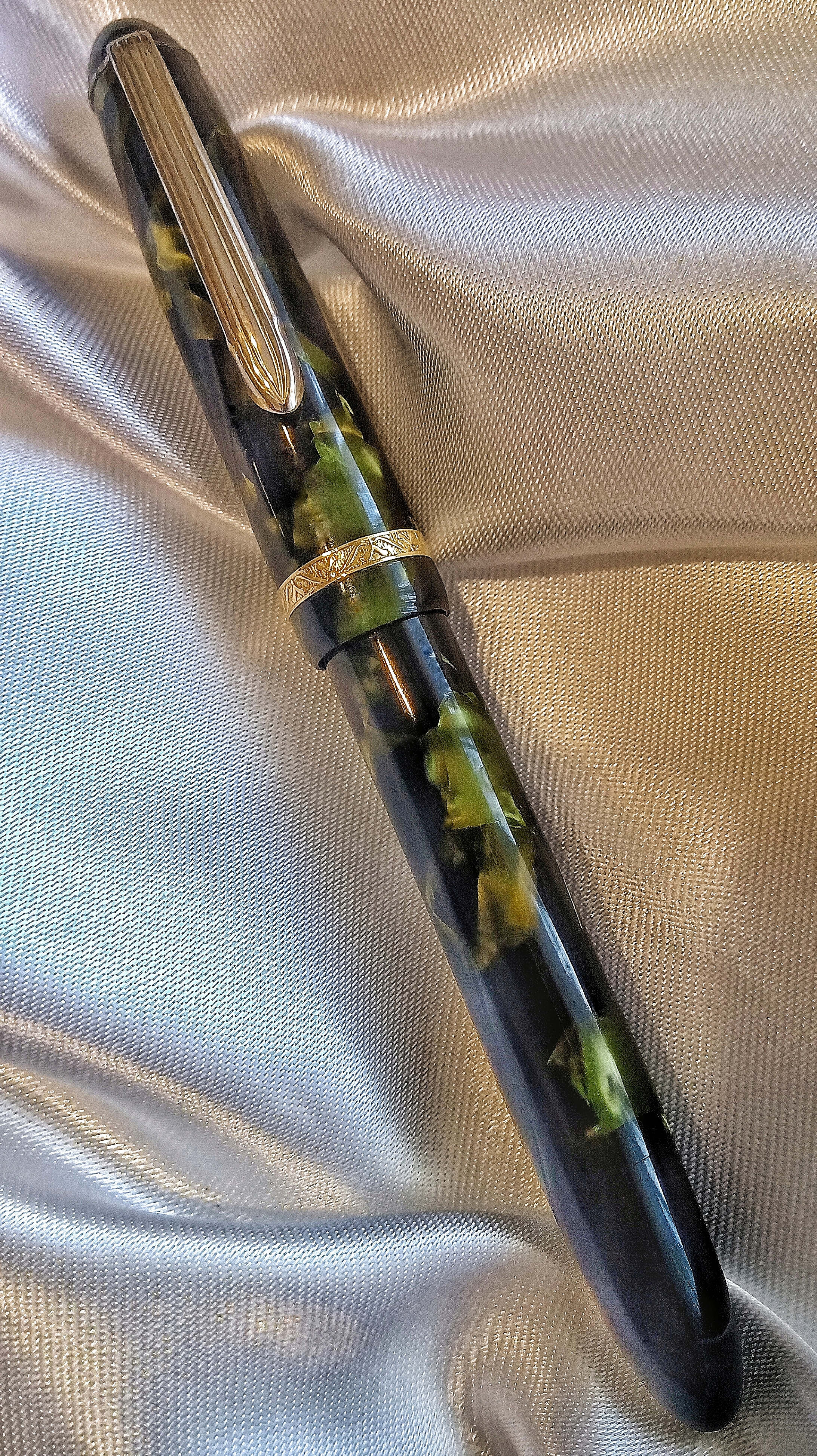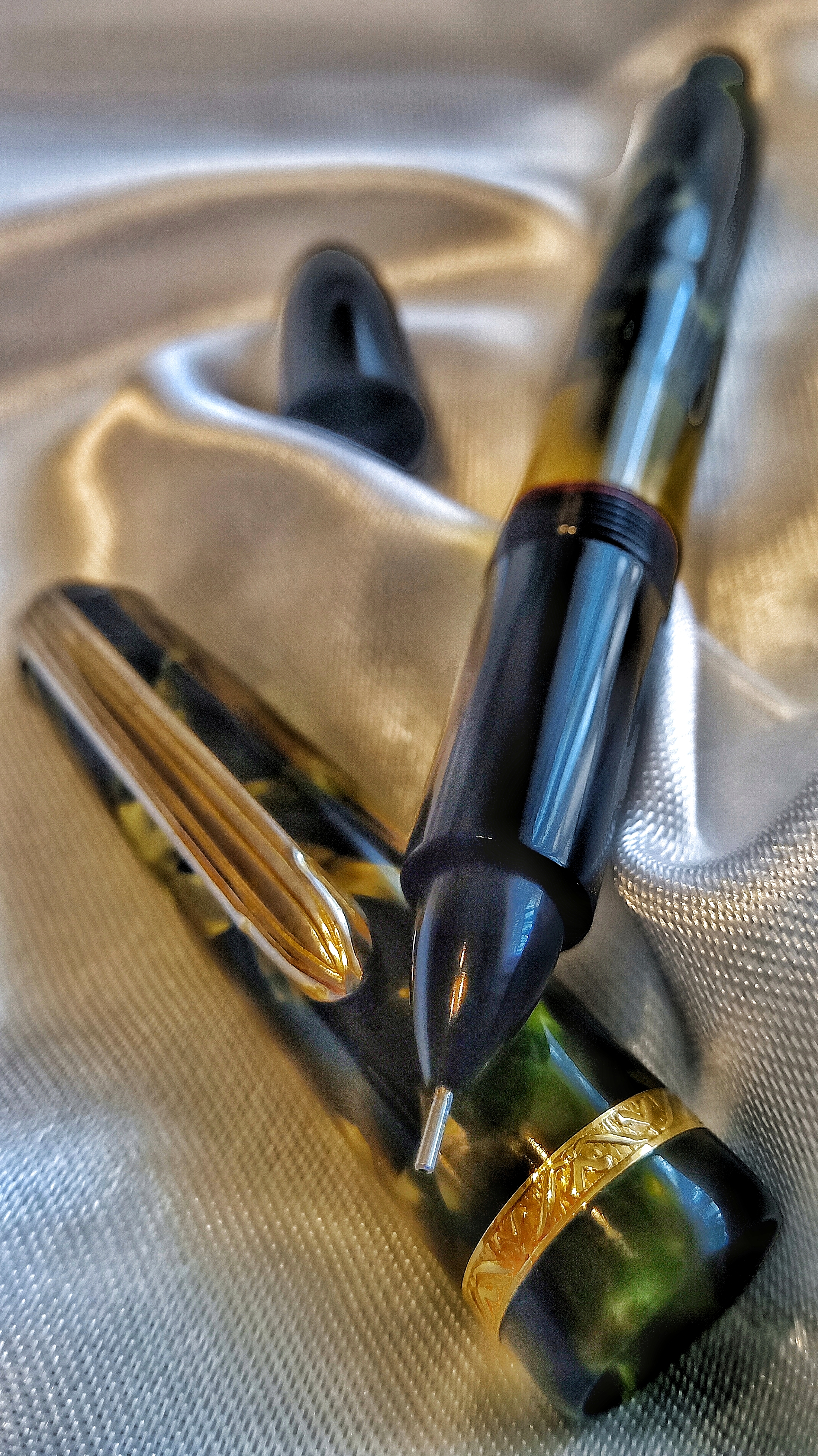 Vorrei concludere la settimana presentando quest'ultima penna capilografiche in un bel verde perla, forse per i suoi materiali, risalente alla fine degli anni '40 (pistone in sughero e corpo in celluloide).