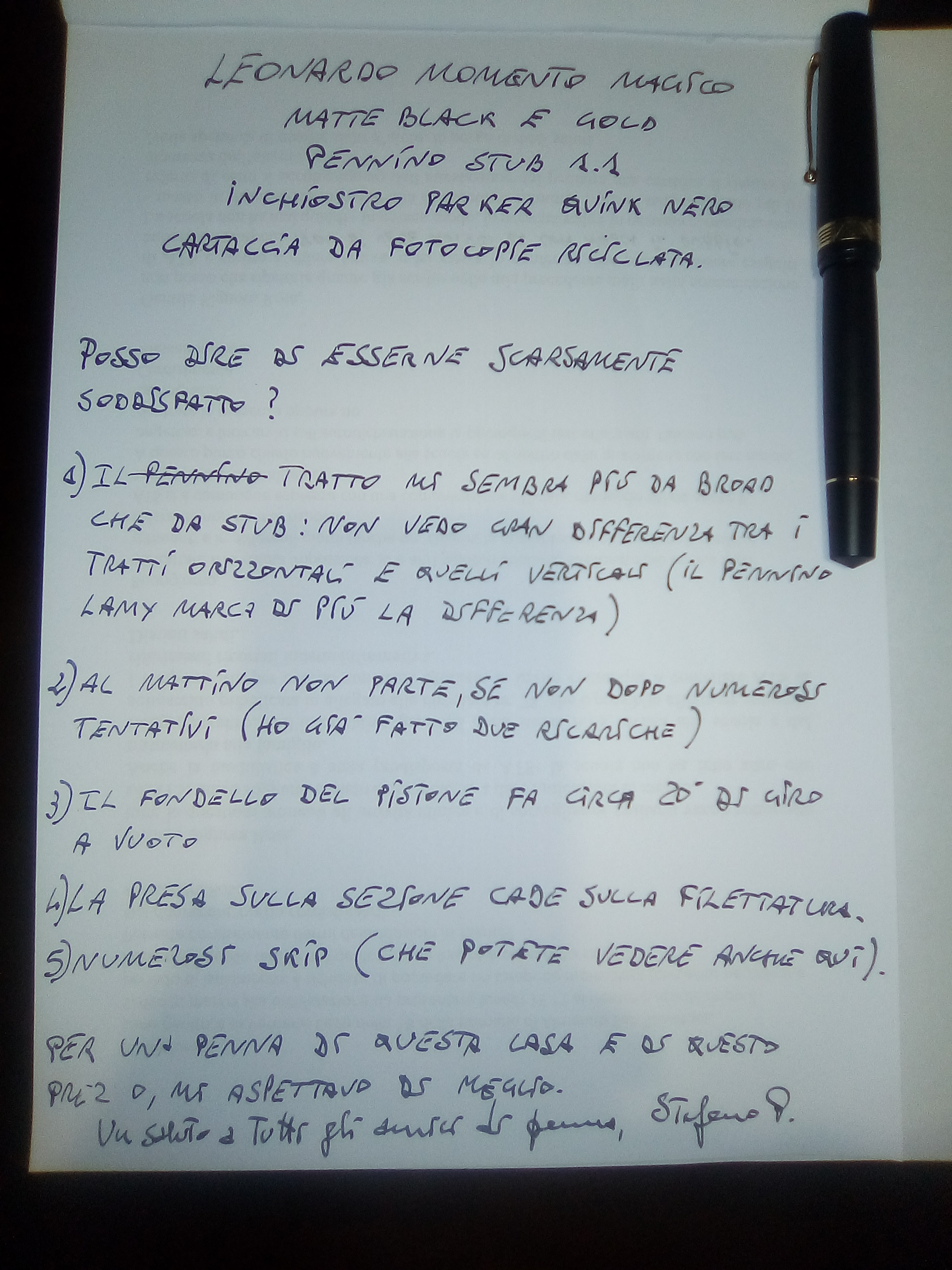 Quindi sia il fondello che il cappuccio non sono ben assemblati. Capisco perchè il servizio di assistenza deve essere necessariamente eccellente...francoiacc ha scritto: ↑martedì 16 novembre 2021, 8:26 Le false partenze al mattino sono dovute ad una chiusura non perfetta del cappuccio, non puoi risolvere se non inviando la penna in assistenza. Capisco la delusione nel ritrovarsi una penna pagata una bella cifretta che non va bene, ma si sa che può capitare il pezzo fallato, niente e' perfetto. Lamentarsi non aiuta nessuno soprattutto quando non si ha intenzione di ricorrere al servizio di assistenza a dir poco eccellente che Leonardo mette a disposizione dei clienti.![]()