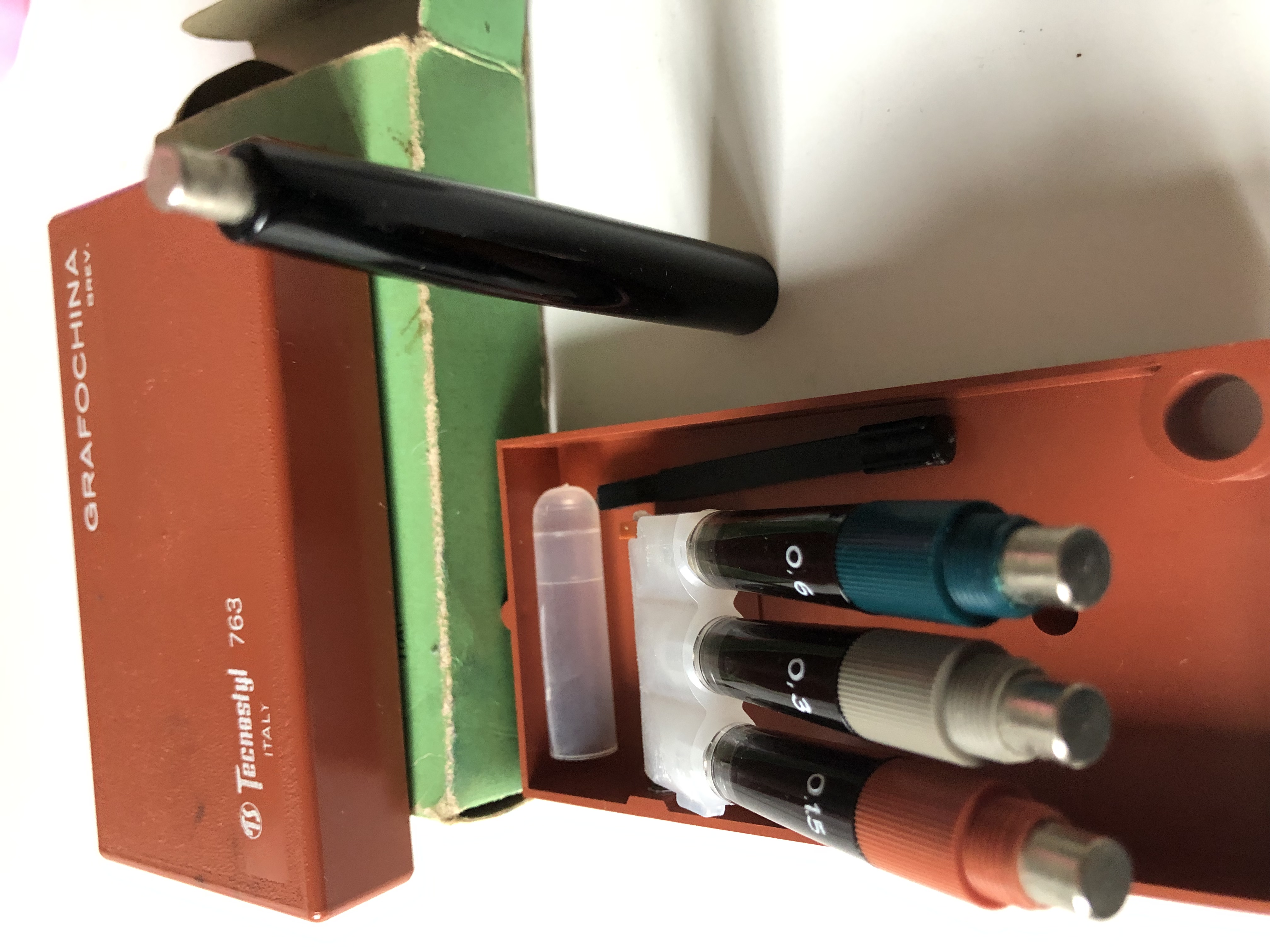 Ispirato dal precedente tread, sono andato a cercare i miei vecchi rotring senza peraltro trovarli, ho però recuperato questo set tascabile Grafochina di mio padre, credo mai utilizzato.