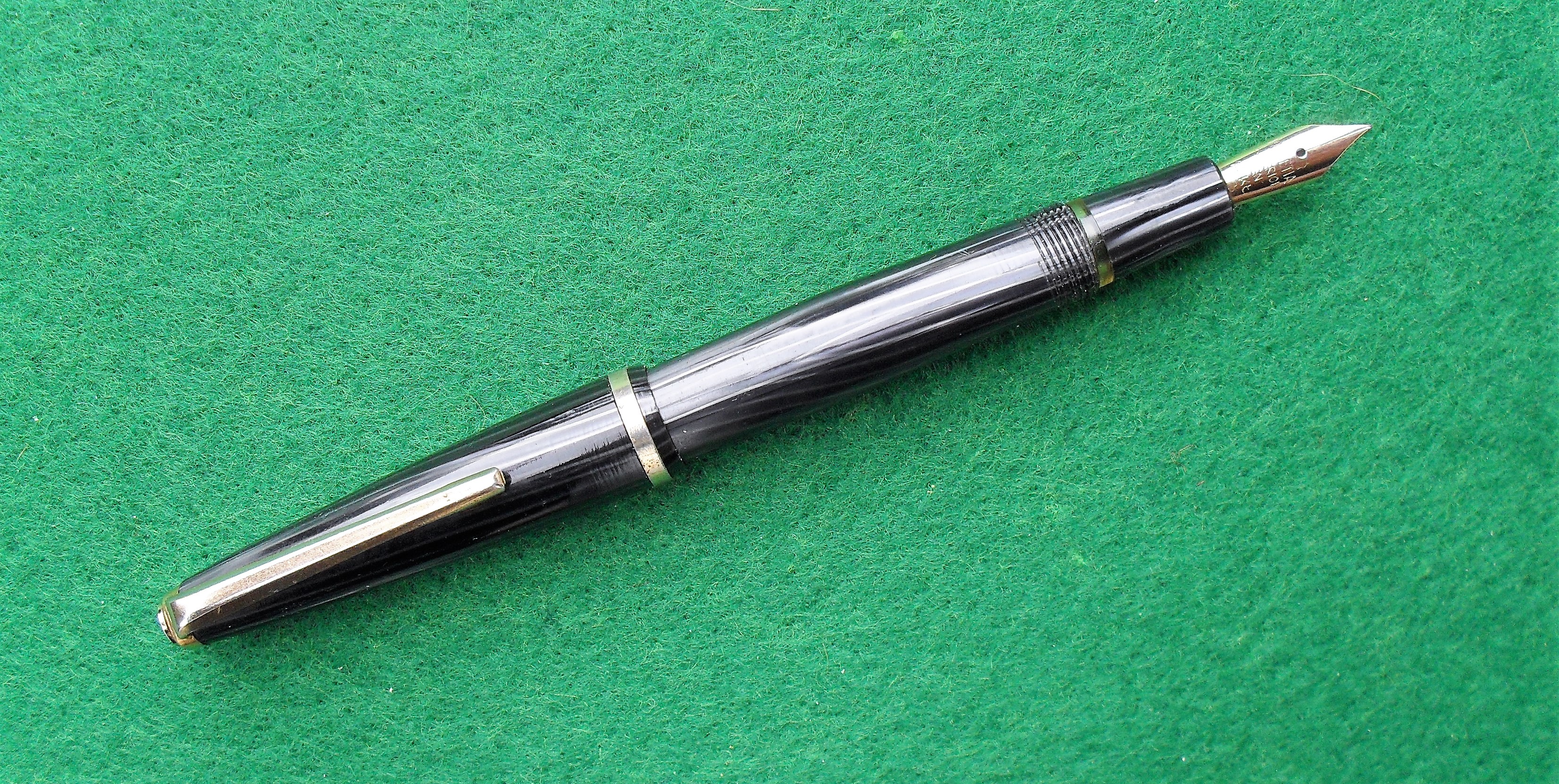 Caricamento a siringa, pennino wingflow, grossi problemi di ossidazione delle parti metalliche, ma con una celluloide zebrata molto particolare e molto bella, oltre a una linea equilibrata e elegante.