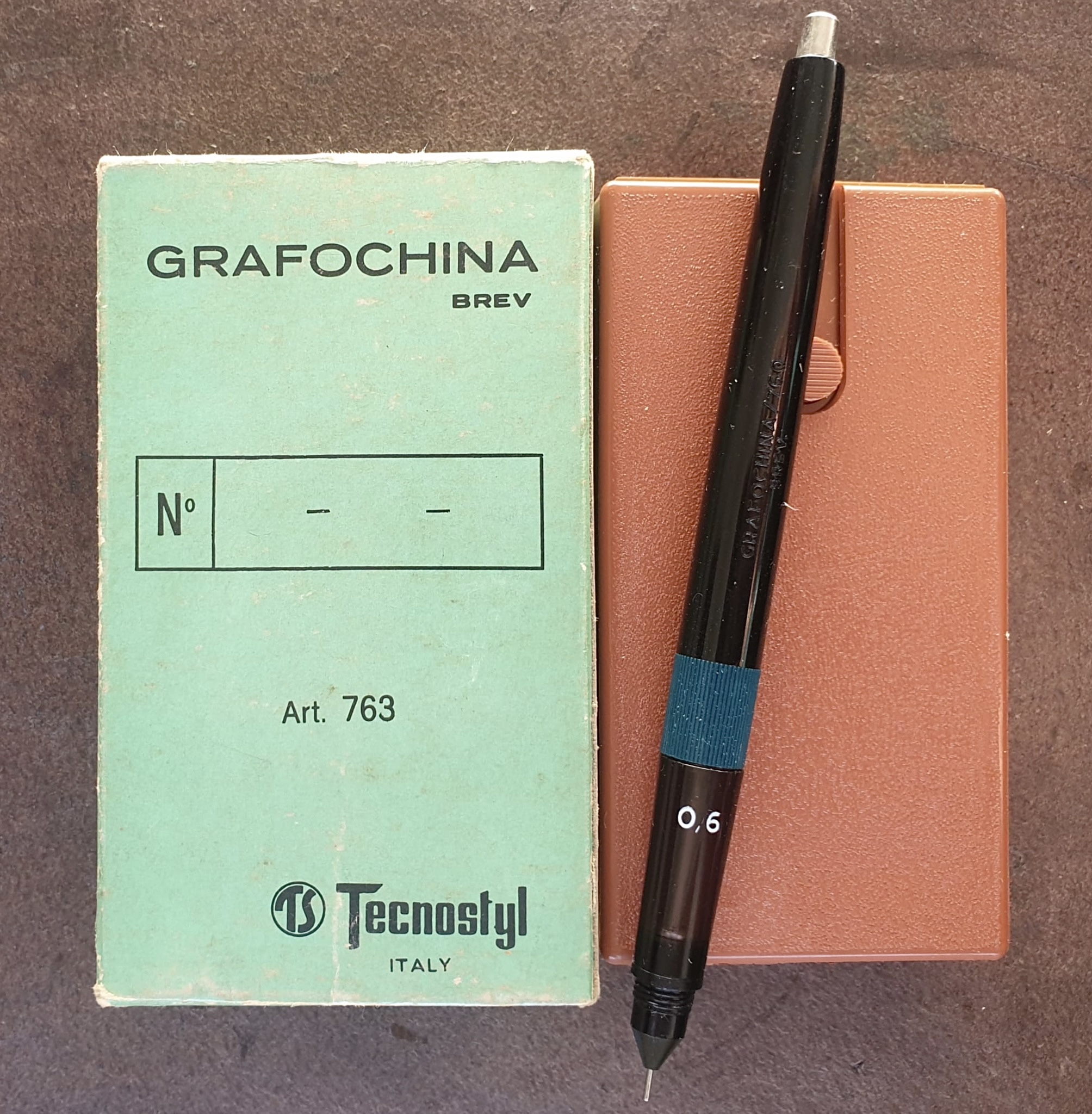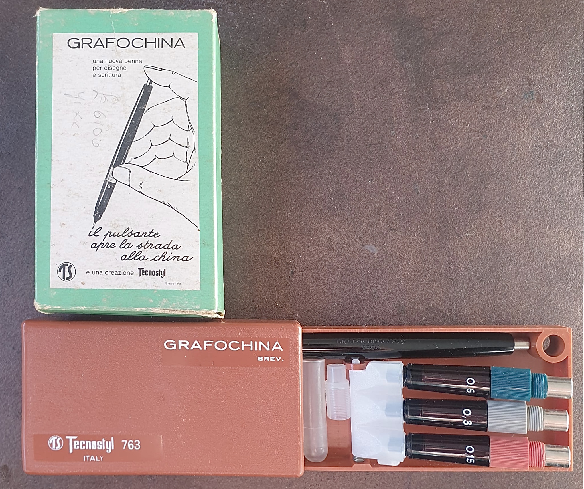 Interessante rara penna tecnica italiana GRAFOCHINA della Tecnostyl, molto simile alle diffusissime Tintenkuli/Rapidograph. Queste ultime avevano lo spillino zavorrato che sali/scendeva a gravità mentre la "nostra" faceva lo stesso con bottone di fondo e molla.
