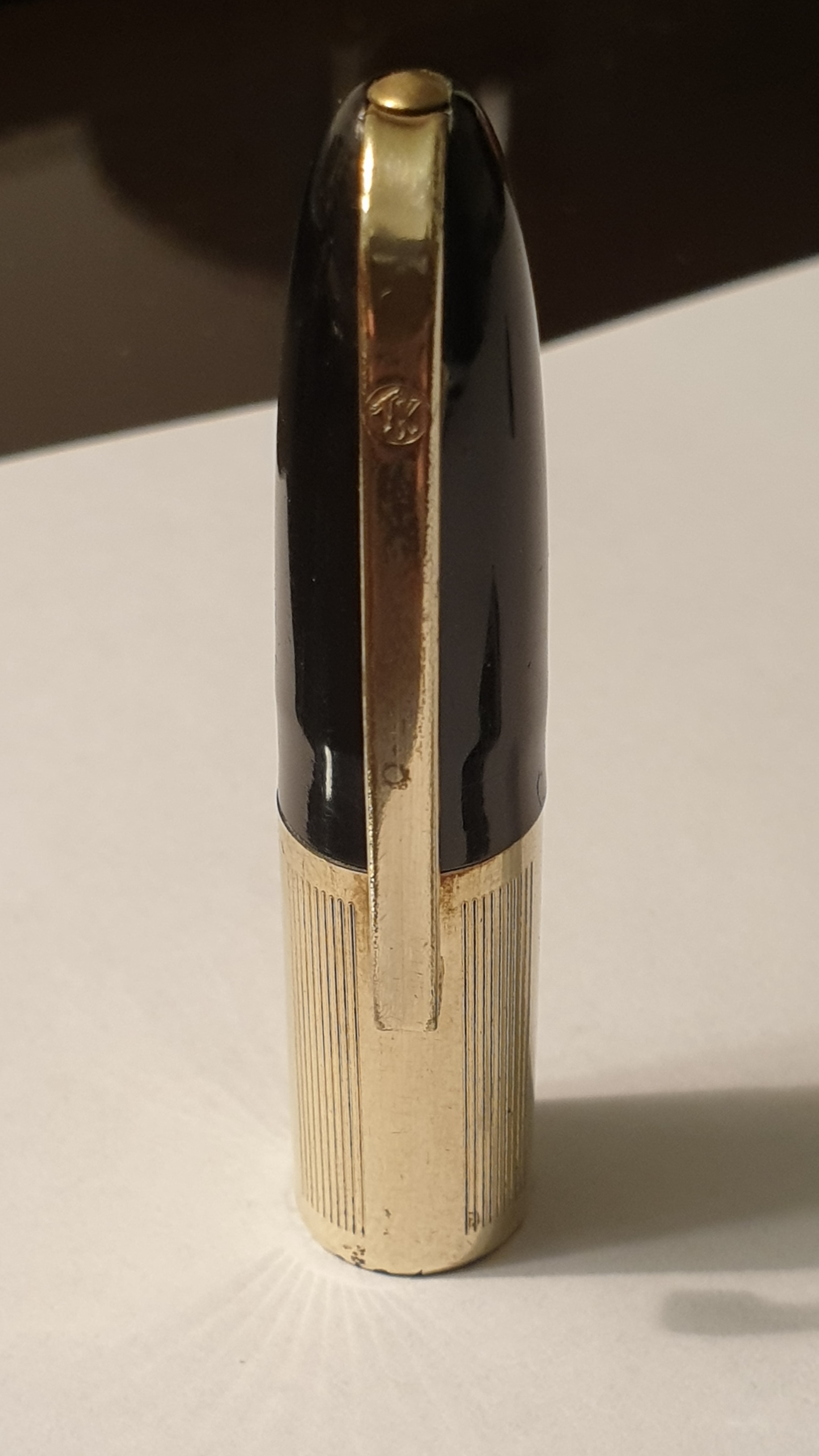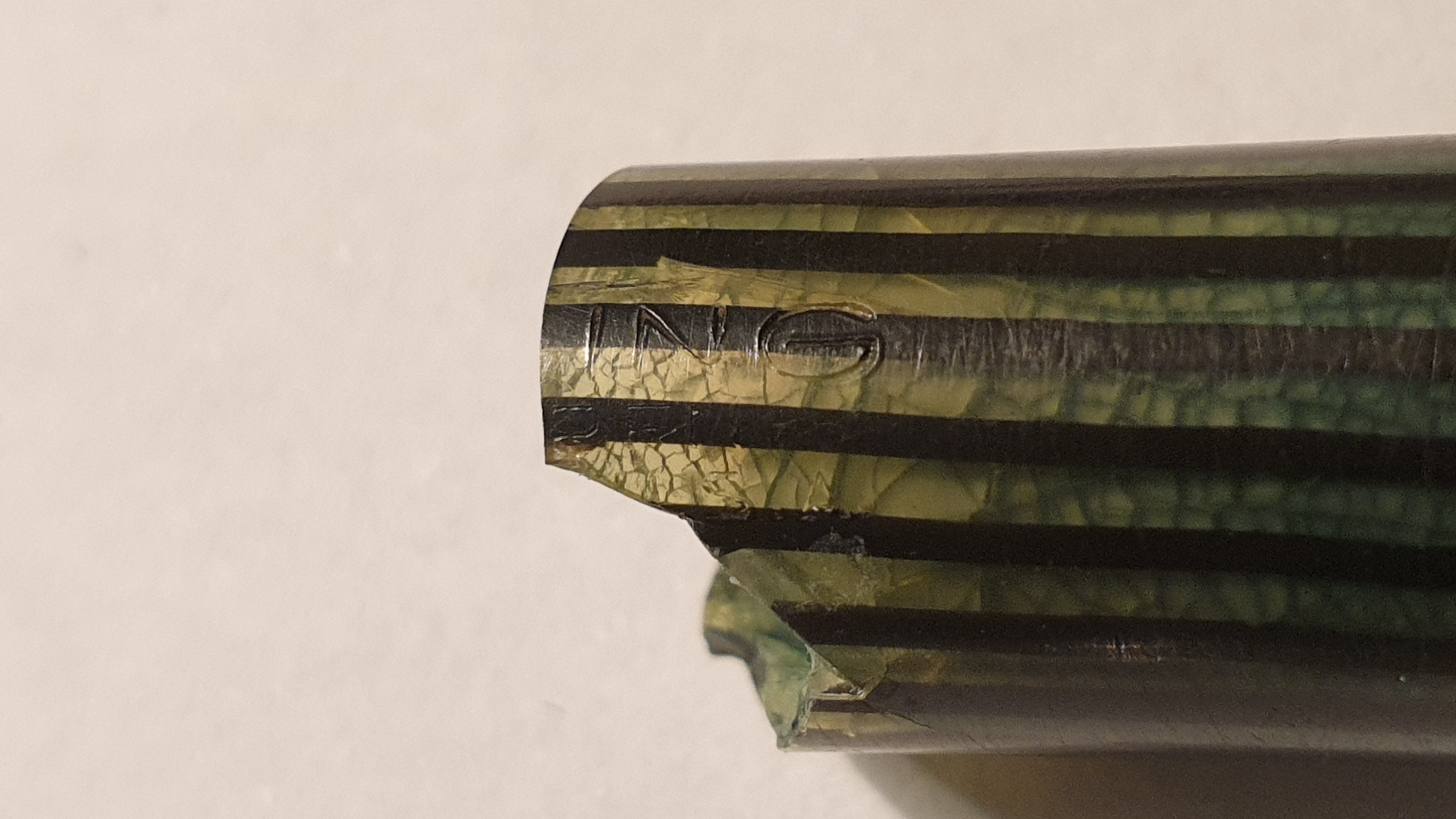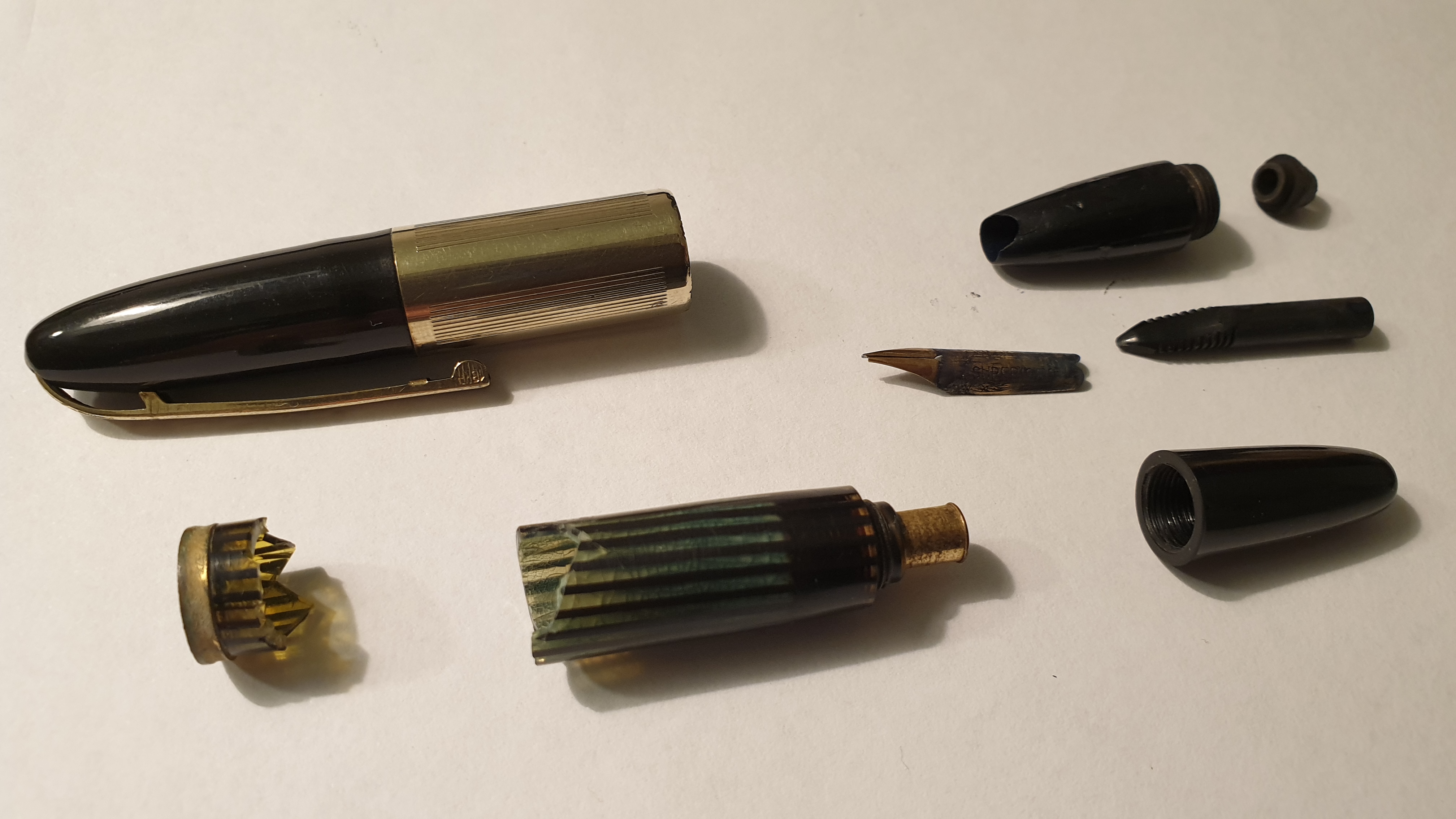 Ci vorrebbe un mago! La celluloide del fusto è ormai fragilissima, per cui andrebbe trovato un fusto uguale o andrebbe ricostruito, ma sono imprese difficili. Il pennino è un altro problema, perché ha una punta spezzata e una piccola frattura vicino al foro, ma volendo spenderci un po' di soldi si può far riparare (all'estero). Personalmente lascerò i pezzi in una bustina fino a quando non mi verrà un'idea per renderli utili...