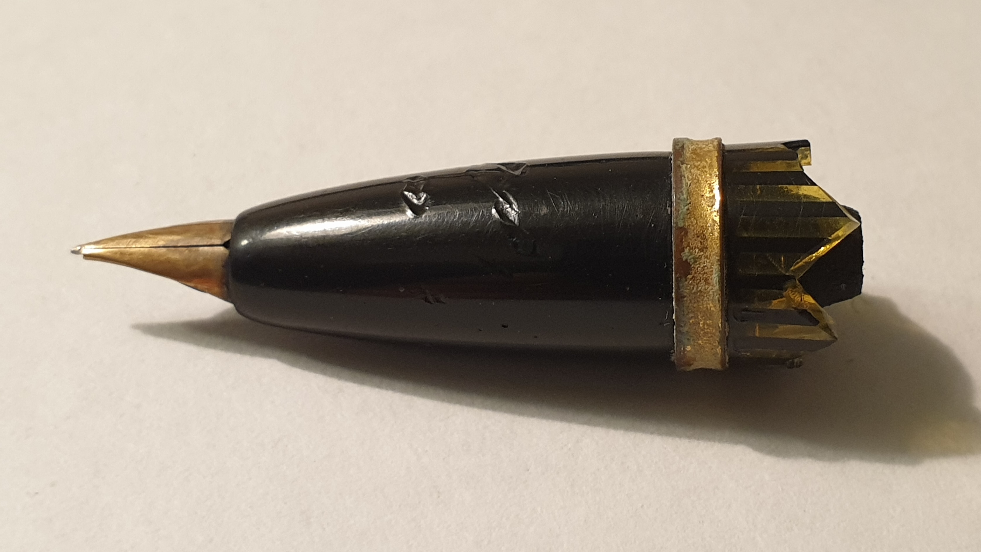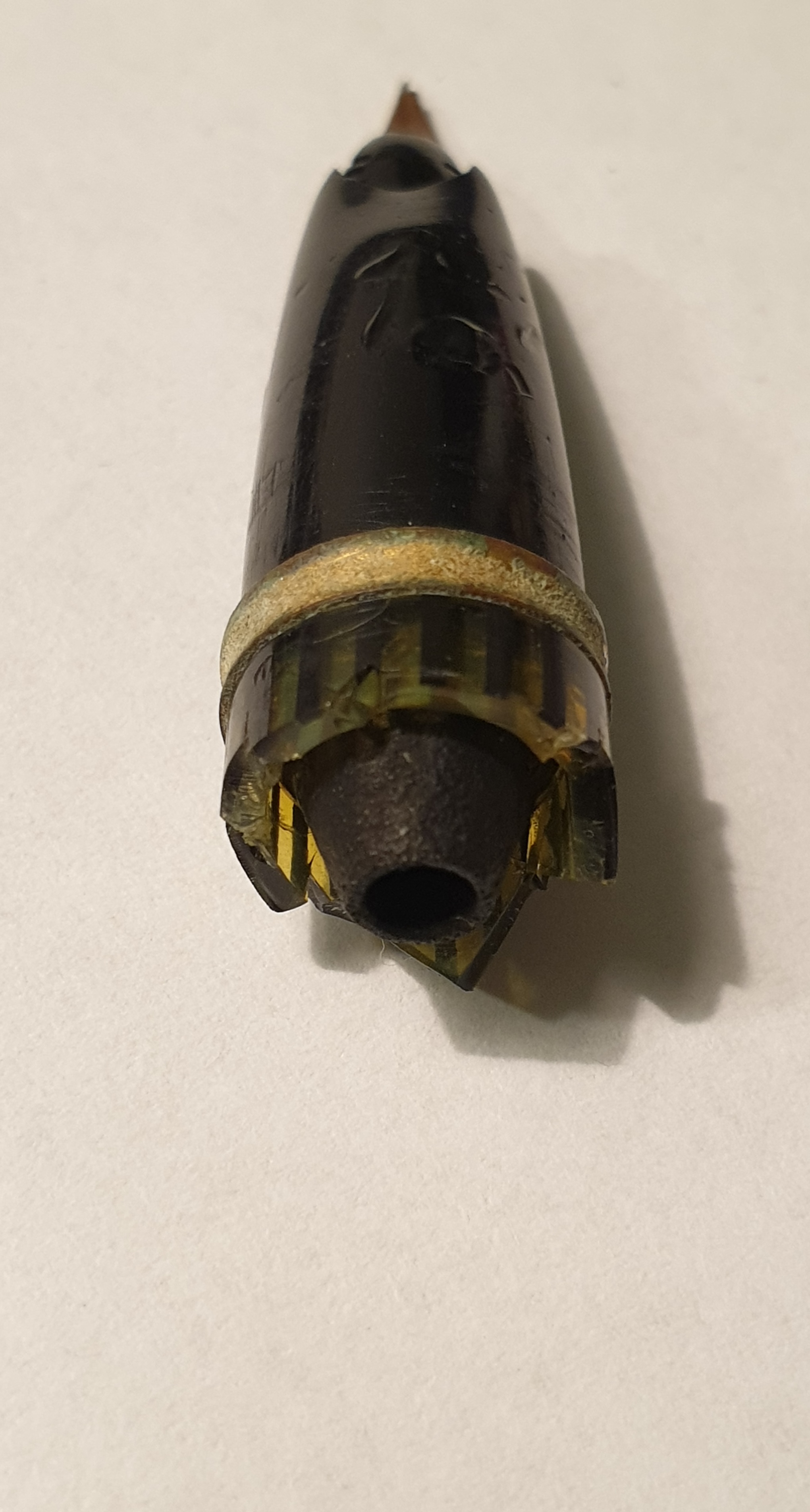 Il fondello della sezione entra a pressione nel foro del conduttore e immagino che, quando la penna era integra, servisse ad ospitare una piccola cannuccia.Esme ha scritto: ↑martedì 18 gennaio 2022, 10:42 Interessante la forma conica del fondello della sezione, per altro rimuovibile (svitabile?).