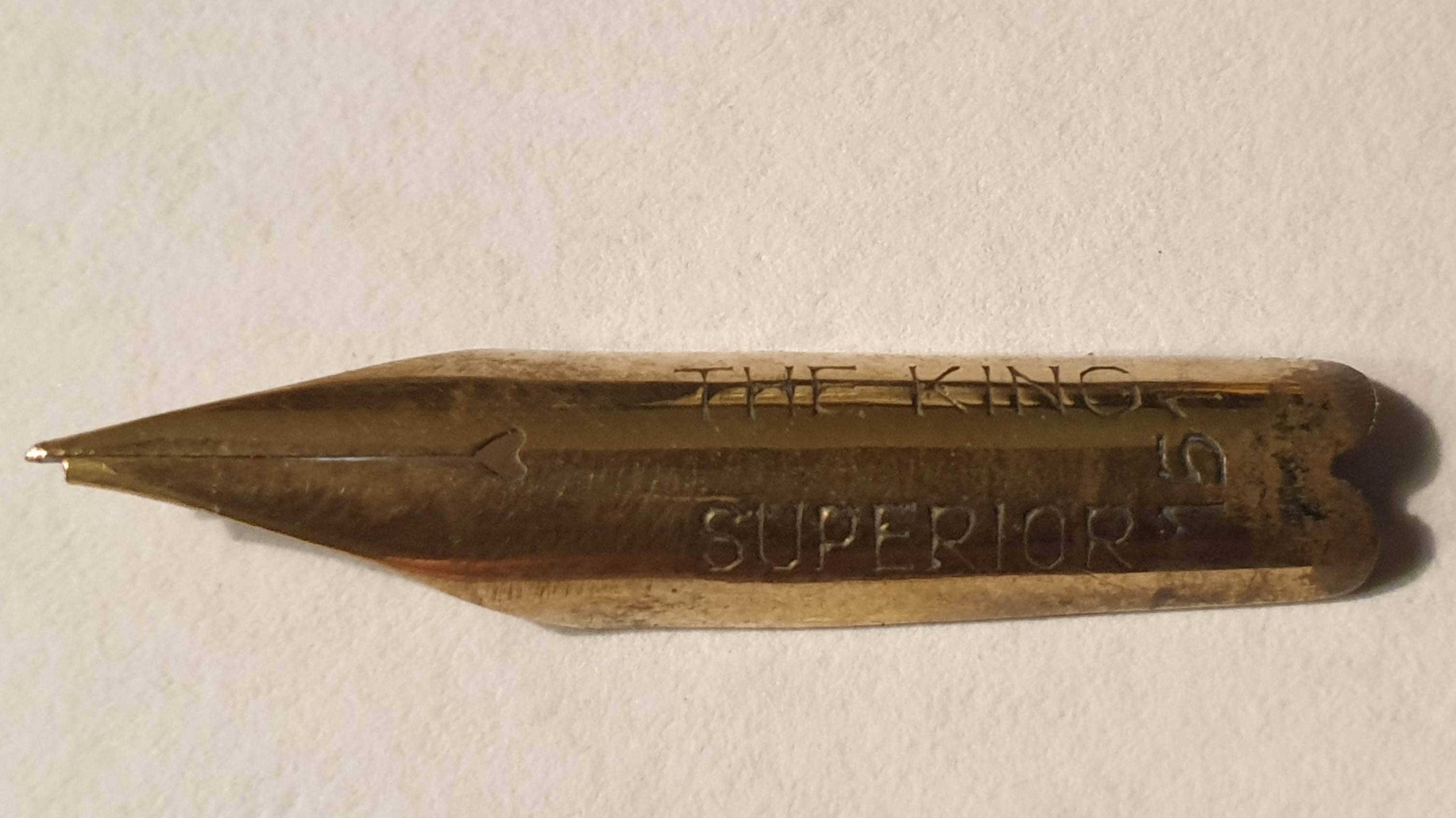Posseggo una meravigliosa The King Superior, in celluloide "arco", e qualche settimana fa ho deciso di comprare un rottame della stessa marca, visto su eBay, dato che sembrava avere il pennino e il conduttore in buono stato (pur essendo questi carenati) e il cappuccio simile a quello della mia. Il fusto era completamente a pezzi e nel complesso la penna era inguardabile, ma dopo un bel bagnetto di qualche giorno ha cominciato a rivelare almeno due cose per me molto interessanti: un sistema di caricamento ibrido, ossia un inedito pistone comandato dal pulsante di fondo, e la dicitura "U.S.A." su ciò che rimane del fusto semitrasparente. Quest'ultima cosa, in particolare, mi ha incuriosito non poco, avendo studiato la storia del marchio. Ma niente, tranne alcuni dibattiti su una sua eventuale parentela con Omas, fa riferimento ad una possibile produzione americana, che potrebbe essere, perché no, anche contestuale a quella italiana.