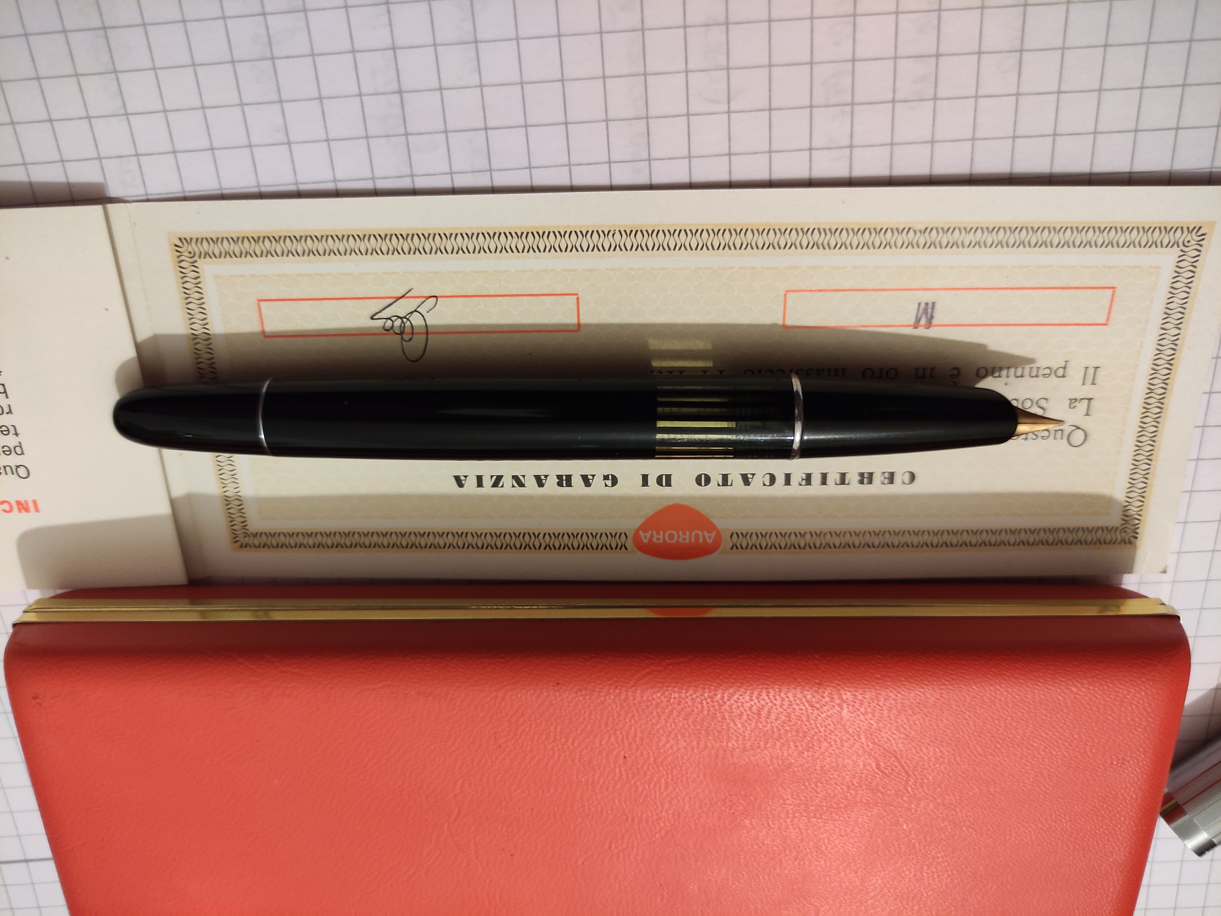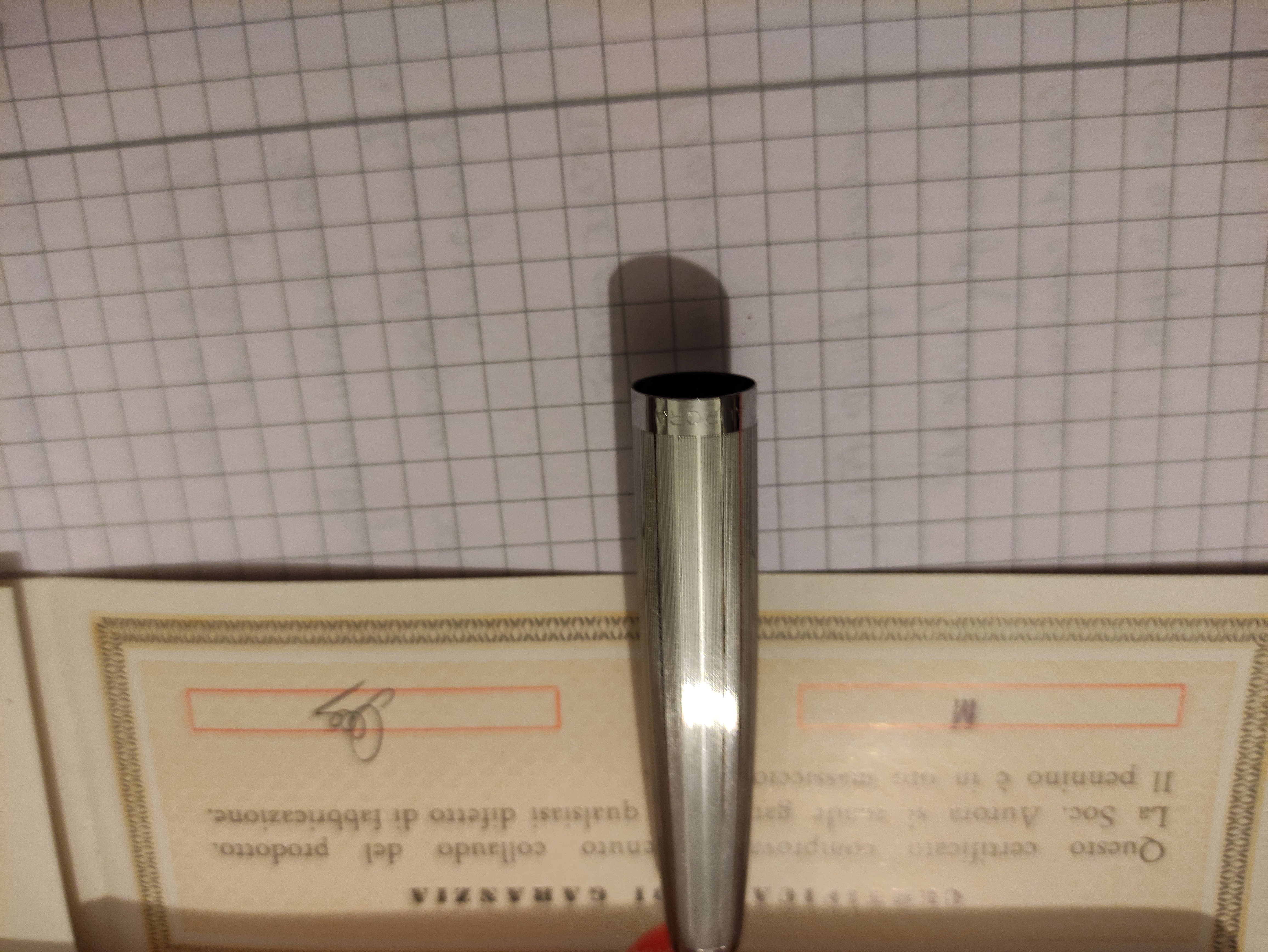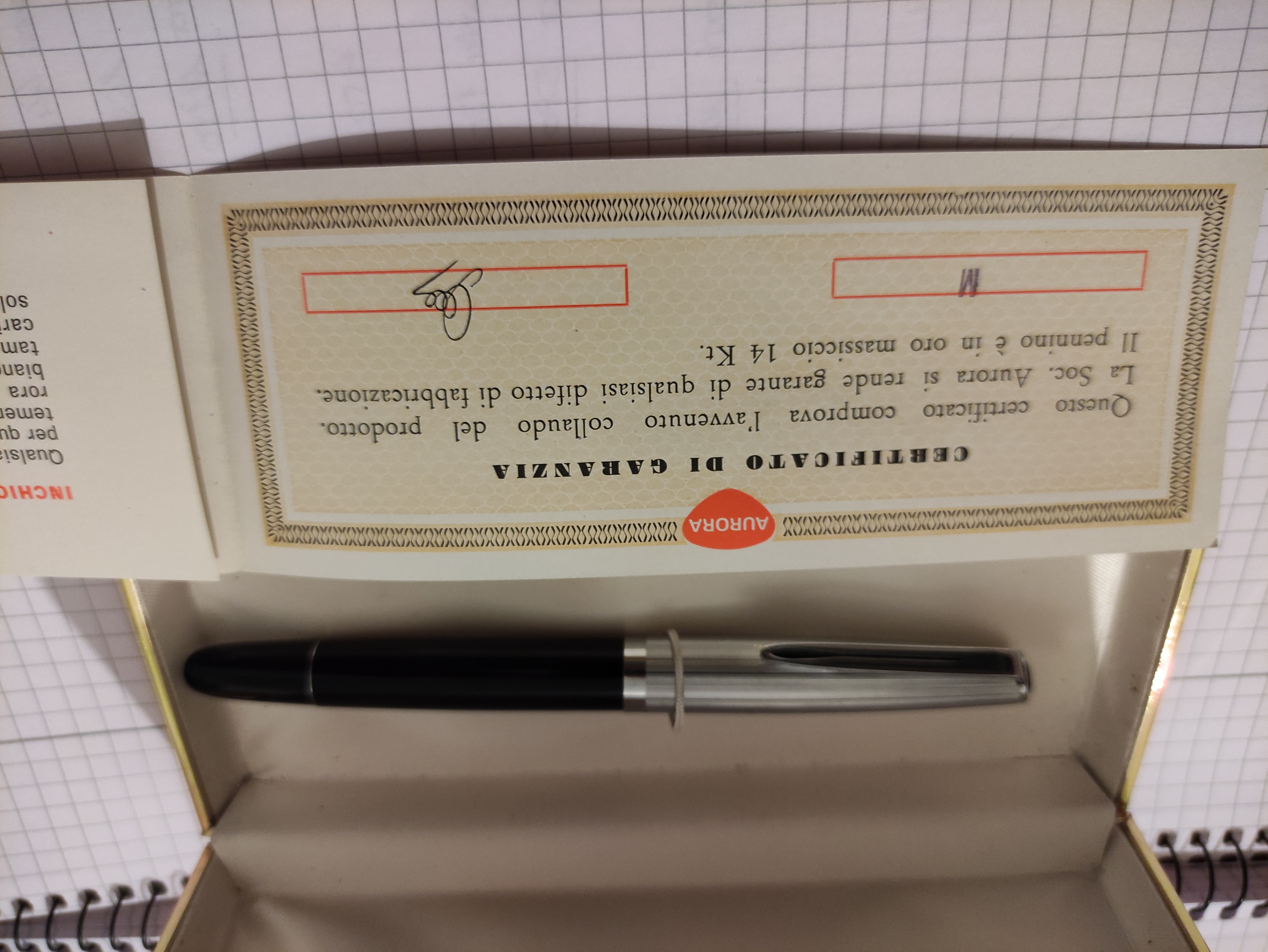 Spero di scrivere nella sezione giusta. In un mercatino domenicale ho trovato alcune penne, una mi ha colpito in particolar modo. In una scatola arancione con marchio Aurora (scatola che ho ancora visto postata nel forum) c'era una Aurora 88P cappuccio cromato a righe. Le condizioni estetiche erano molto buone, alcuni piccoli segni sul cappuccio, la scritta " AURORA " dietro la clip. Apro il cappuccio, controllo la finestrella gialla quasi immacolata, il pistone scorre fluido. Era presente il certificato di garanzia che riporta la taglia del pennino e la firma del collaudatore. Controllo la sezione e rimango perplesso, non è presente il logo con la scritta " Aurora , 88P " ed è assente anche il codice seriale. Questa cosa mi ha spiazzato. Chiedo cortesemente al venditore se potevo guardare meglio il pennino, motivando il mio stupore. Gentilissimo ed incuriosendosi anche lui, sfilo il pennino che riporta la scritta AURORA e sotto 585%.