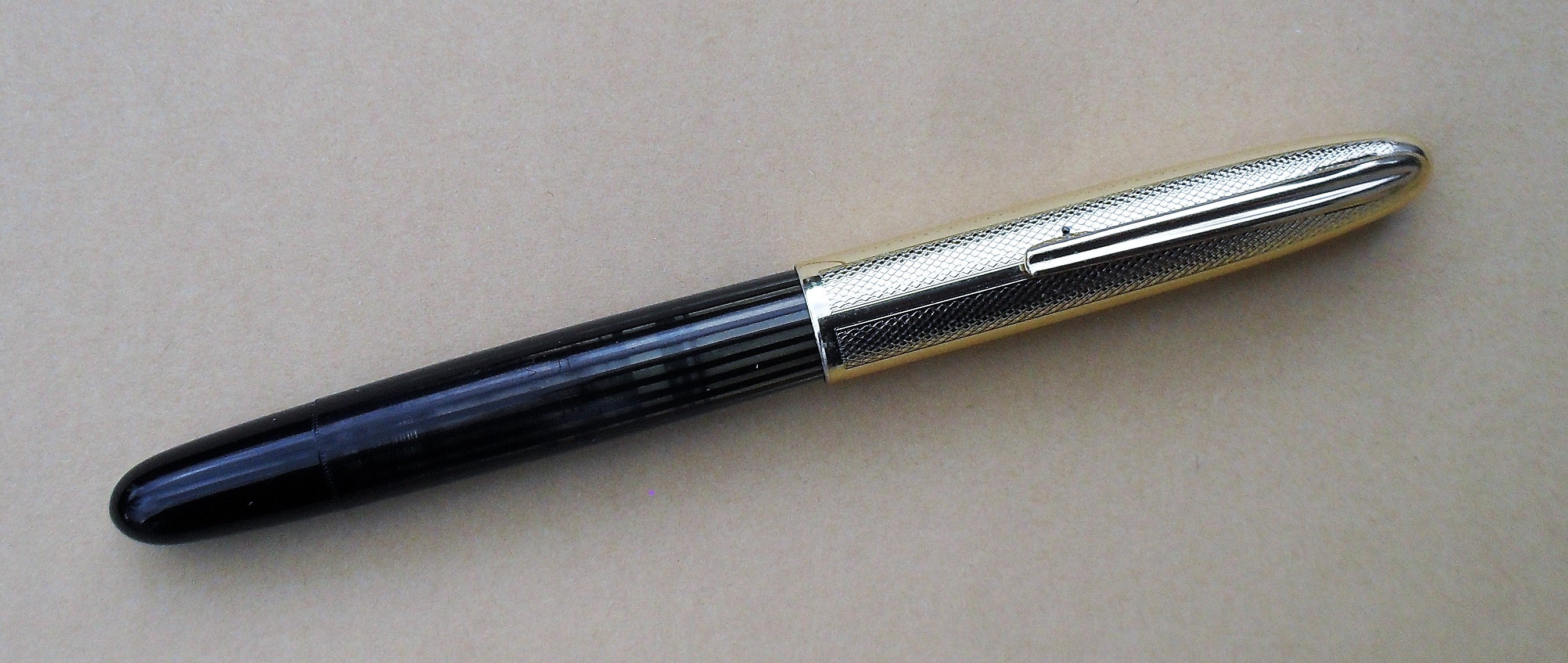 Per quanto concerne il sistema d'alimentazione, il modello del quale vi offro qualche immagine, a titolo di curiosità, non è nuovo per il forum (viewtopic.php?f=8&t=18436), anche se l'esemplare che vedete è dotato di cappuccio interamente metallico e dorato e non riporta alcuna incisione con il numero del modello, ma solo, al centro del corpo e trasversalmente a quest'ultimo, la scritta, su due livelli, "NOREX / Doppeltank - pat.". Il che mi fa pensare che, forse, si tratta del primo modello con questo sistema d'alimentazione. Il sistema di caricamento a doppia camera prevede prima il riempimento della camera posteriore, attraverso la cannula che, a pistone del tutto abbassato, fuoriesce dalla guarnizione anteriore, poi il riempimento della camera anteriore, la prima a rifornire l'alimentatore. Esaurita la carica di quest'ultima, l'abbassamento dello stantuffo riversa nella camera anteriore l'inchiostro contenuto in quella posteriore, che agisce da riserva. L'estetica di questa Norex ricorda la Parker 51 e, salvo verifica, penso sia ragionevole ipotizzare che la produzione risalga al periodo 1955 - 1965 (pura ipotesi, senza alcun riscontro, per ora). Senza inchiostro, la penna pesa 14 grammi, mentre il peso del cappuccio, che si chiude in un giro e mezzo, è di 5 gr.