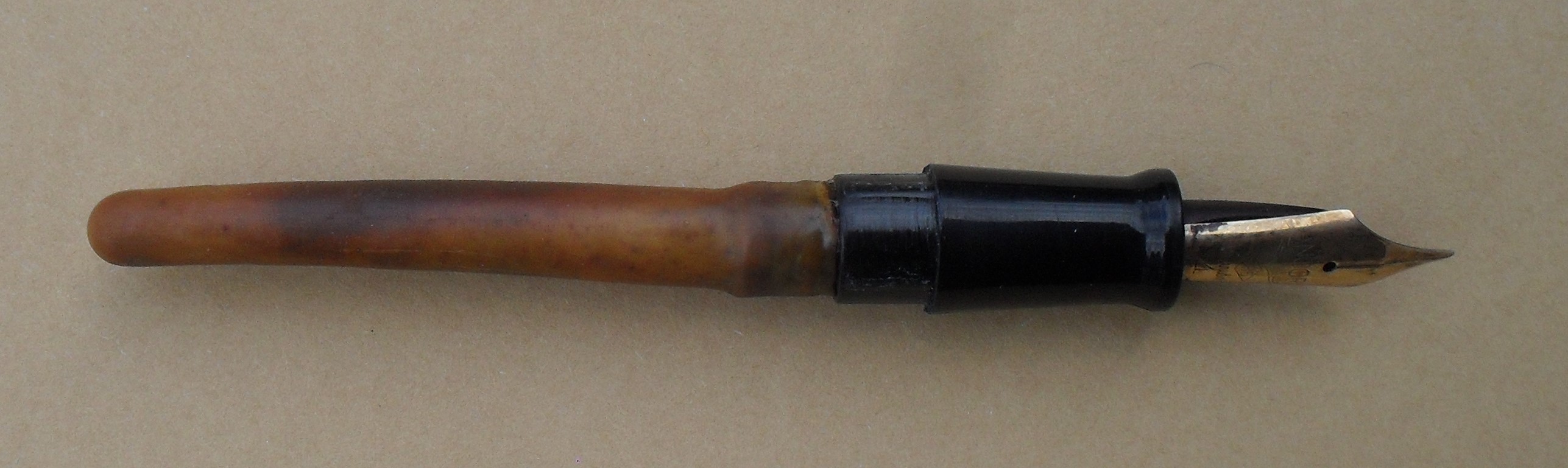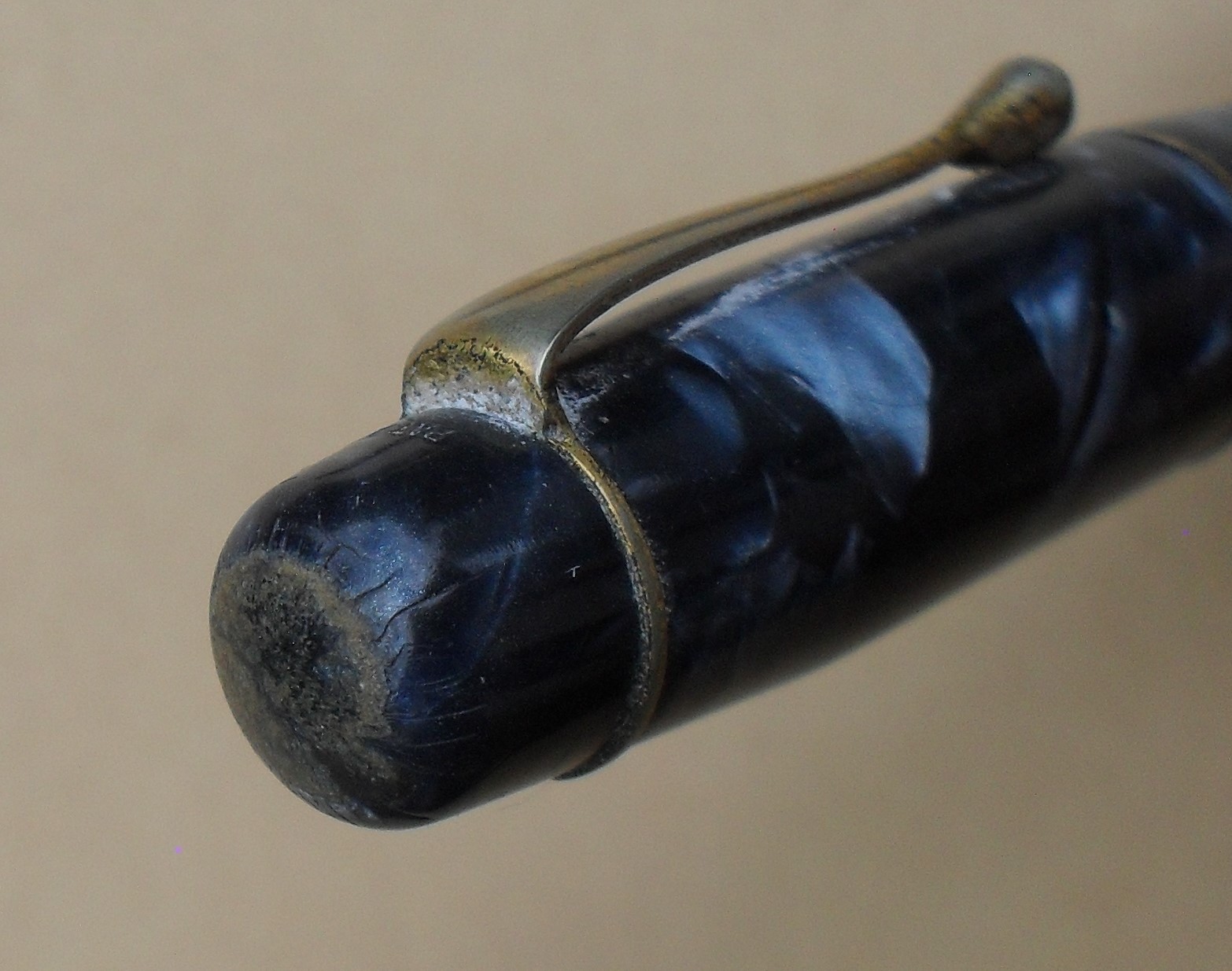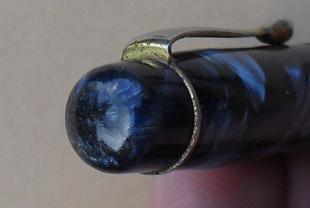 Circa il materiale, infatti, mi ha insospettito la scritta "Pat.App.For" incisa sulla testa del cappuccio: dato che l'architettura della stilografica è del tutto usuale (alimentazione a levetta, cappuccio a vite, fermaglio ad anello e pennino scoperto), immagino che la scritta abbia senso se riferita al materiale. In effetti, quando mi è pervenuta, la penna manifestava un curioso effetto di cristallizzazione delle due estremità, del fondello e del cappuccio: