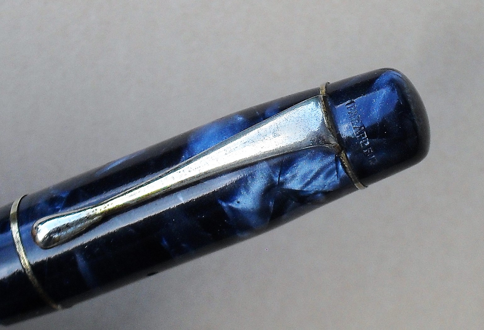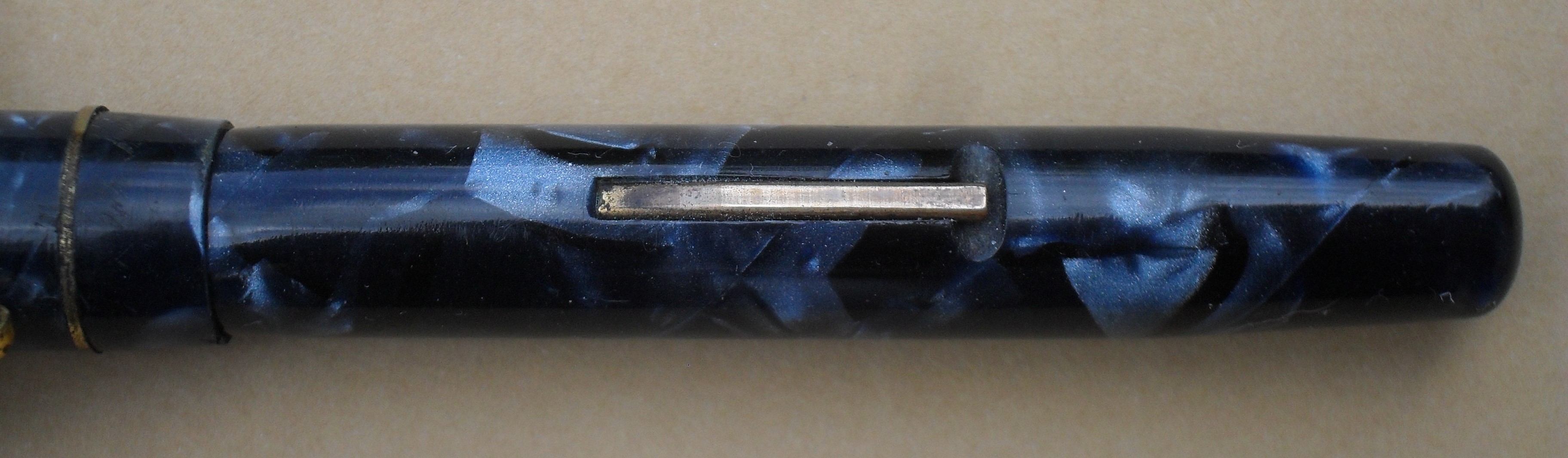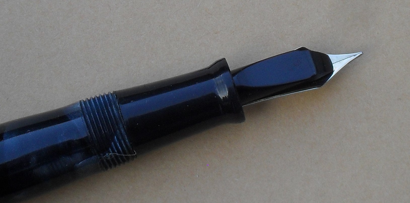 Circa il materiale, infatti, mi ha insospettito la scritta "Pat.App.For" incisa sulla testa del cappuccio: dato che l'architettura della stilografica è del tutto usuale (alimentazione a levetta, cappuccio a vite, fermaglio ad anello e pennino scoperto), immagino che la scritta abbia senso se riferita al materiale. In effetti, quando mi è pervenuta, la penna manifestava un curioso effetto di cristallizzazione delle due estremità, del fondello e del cappuccio: