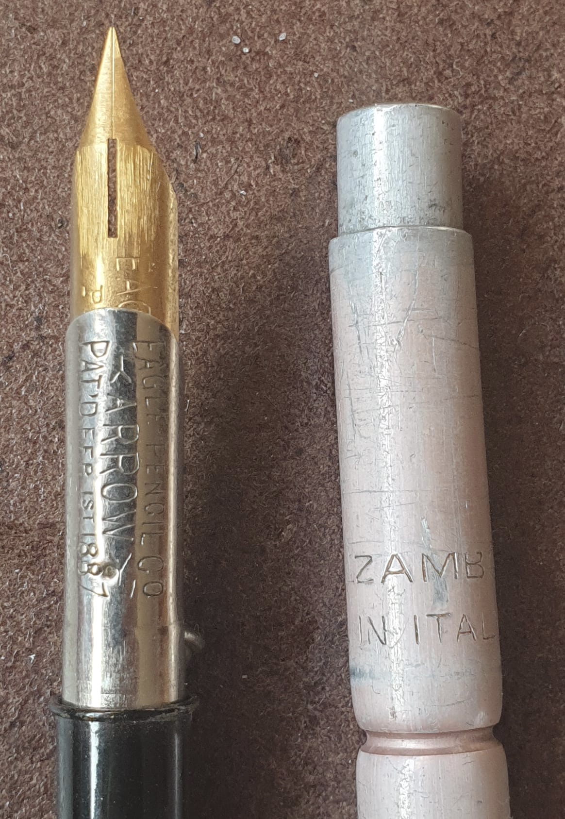 Ecco una Eagle Arrow New York brev.1887 con pennino a gravità e blocco a catenella accanto alla italiana Zambo. Chissà chi dei due ha copiato...