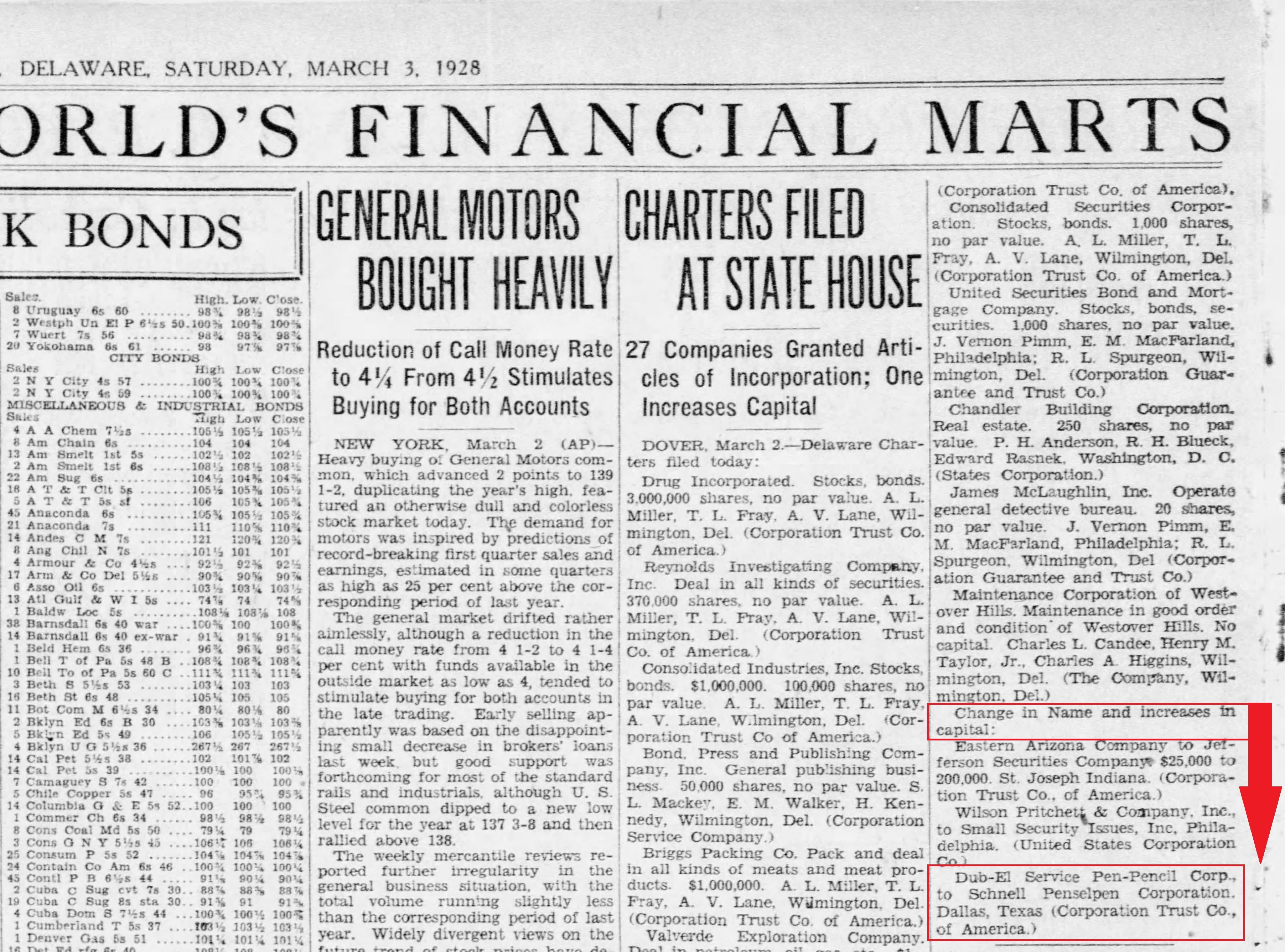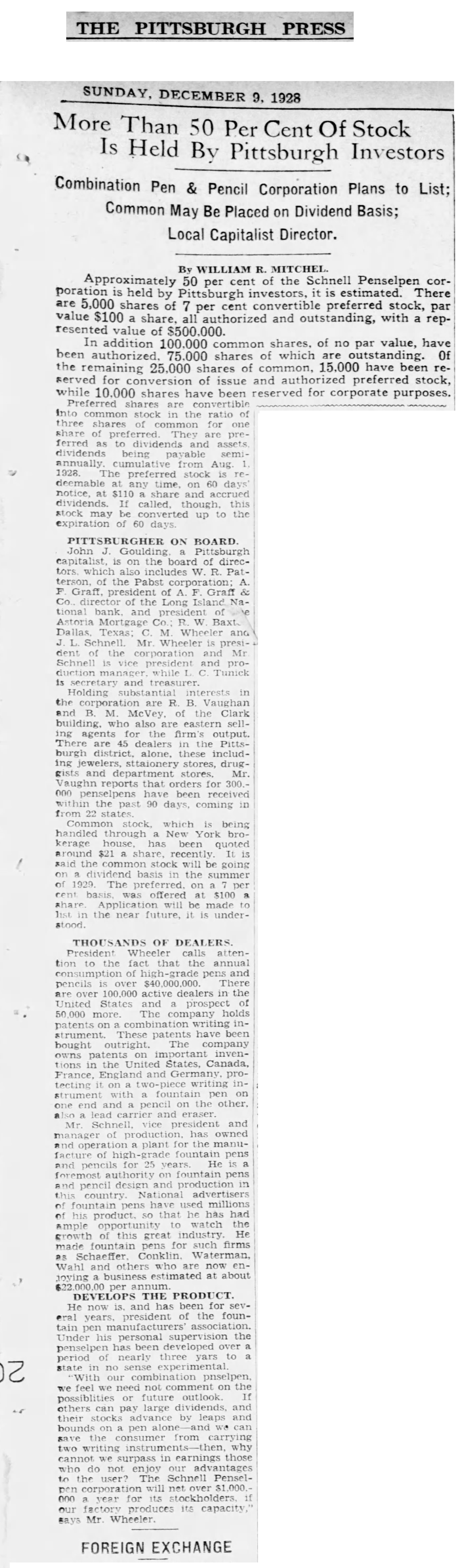 La prima notizia della “Schnell Penselpen Corporation” da me rinvenuta sulla stampa quotidiana statunitense è del 3 marzo 1928 (sul «The Morning News» di Wilmington, Delaware): in essa sono citati la ricapitalizzazione e il cambio della ragione sociale