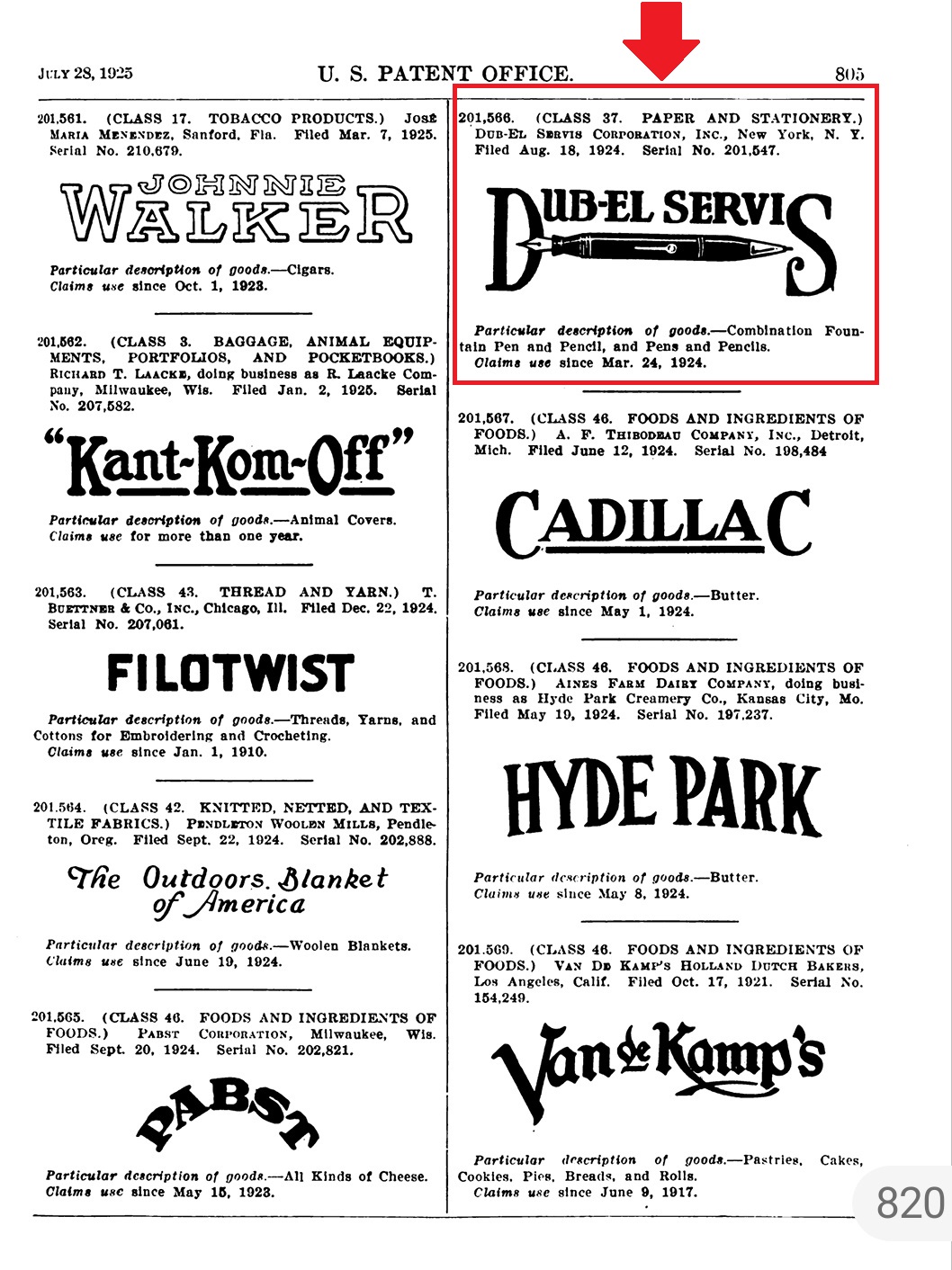 La “Dub-El Service” andrebbe, innanzi tutto, più correttamente indicata come “Dub-El Servis” (ennesimo gioco di parole per indicare il “double service”, ovvero il “doppio servizio” offerto dallo strumento), di proprietà del newyorkese Joseph Maynard Gilliam, e produceva inequivocabilmente combo stilografica-matita già dal 1924, come risulta dai “trademarks” pubblicati dall’Ufficio Brevetti americano: