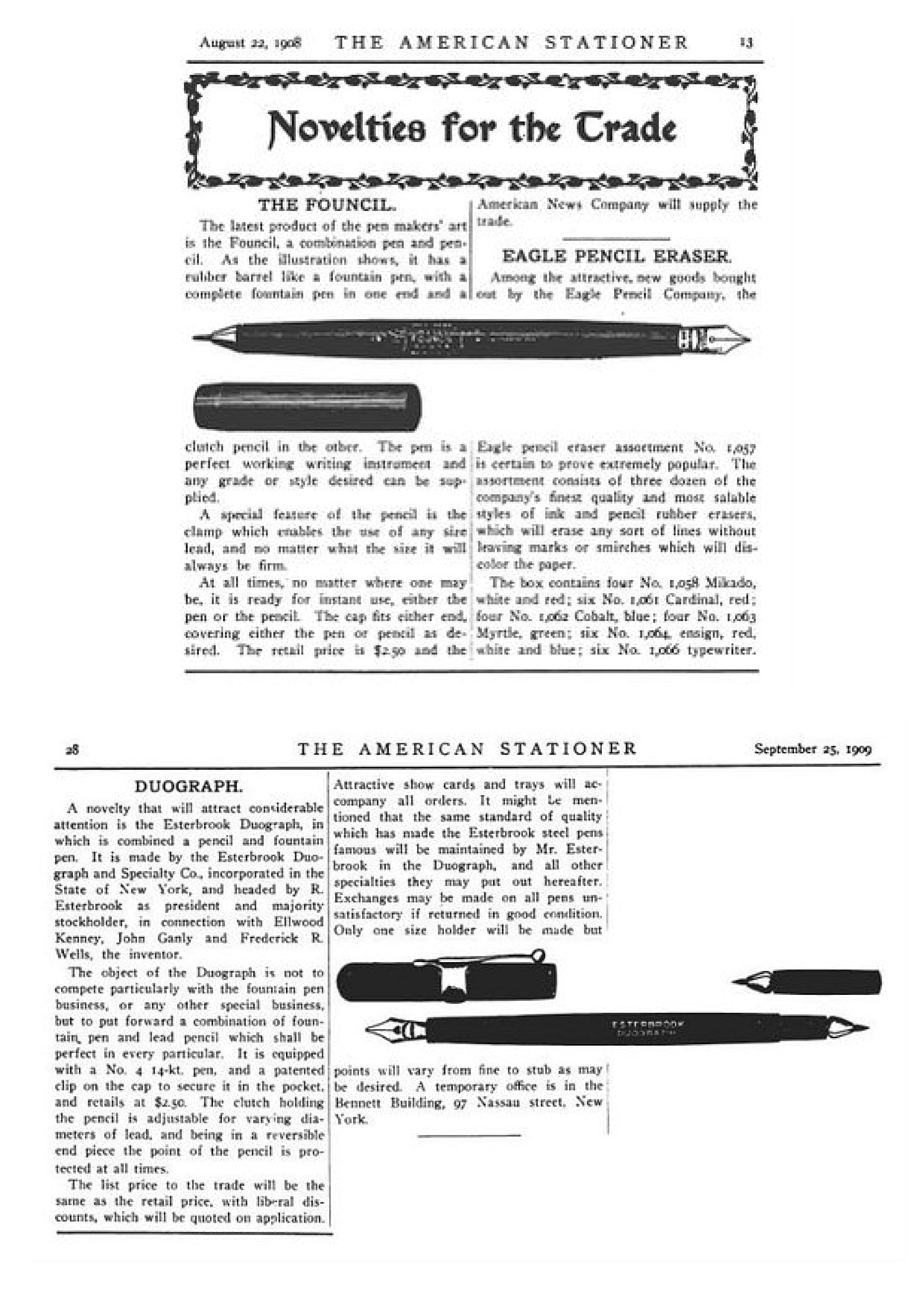 Ma è all’inizio del Novecento che ai pennini da intinzione si sostituirono le stilografiche a serbatoio. Tuttavia, nessuno di quegli strumenti ebbe diffusione e notorietà sufficienti da creare un trend nazionale: potremmo ricordare la DUOGRAPH della Eagle (1908), la FUNCIL (sic!) della Esterbrook del (1909)…