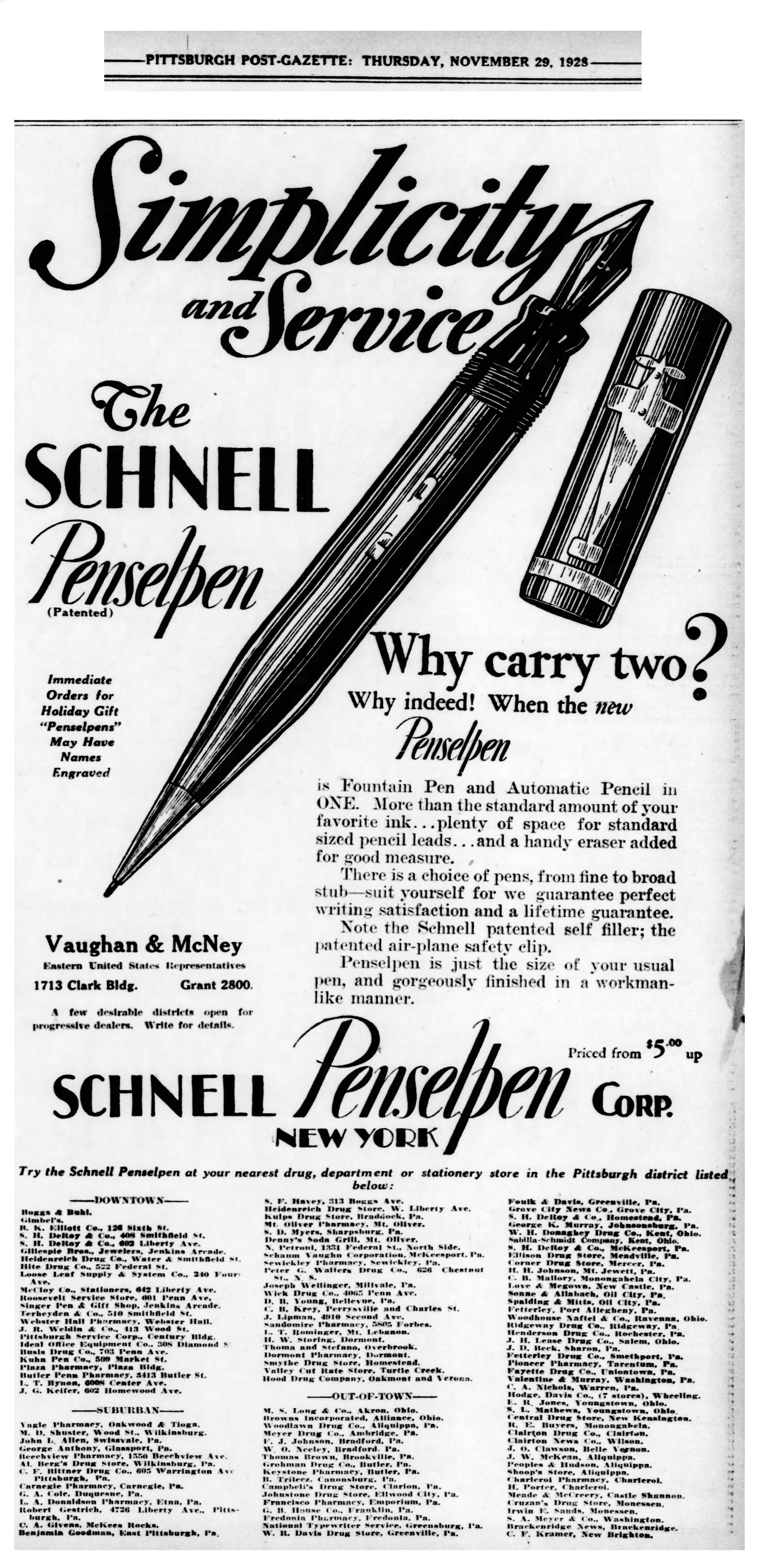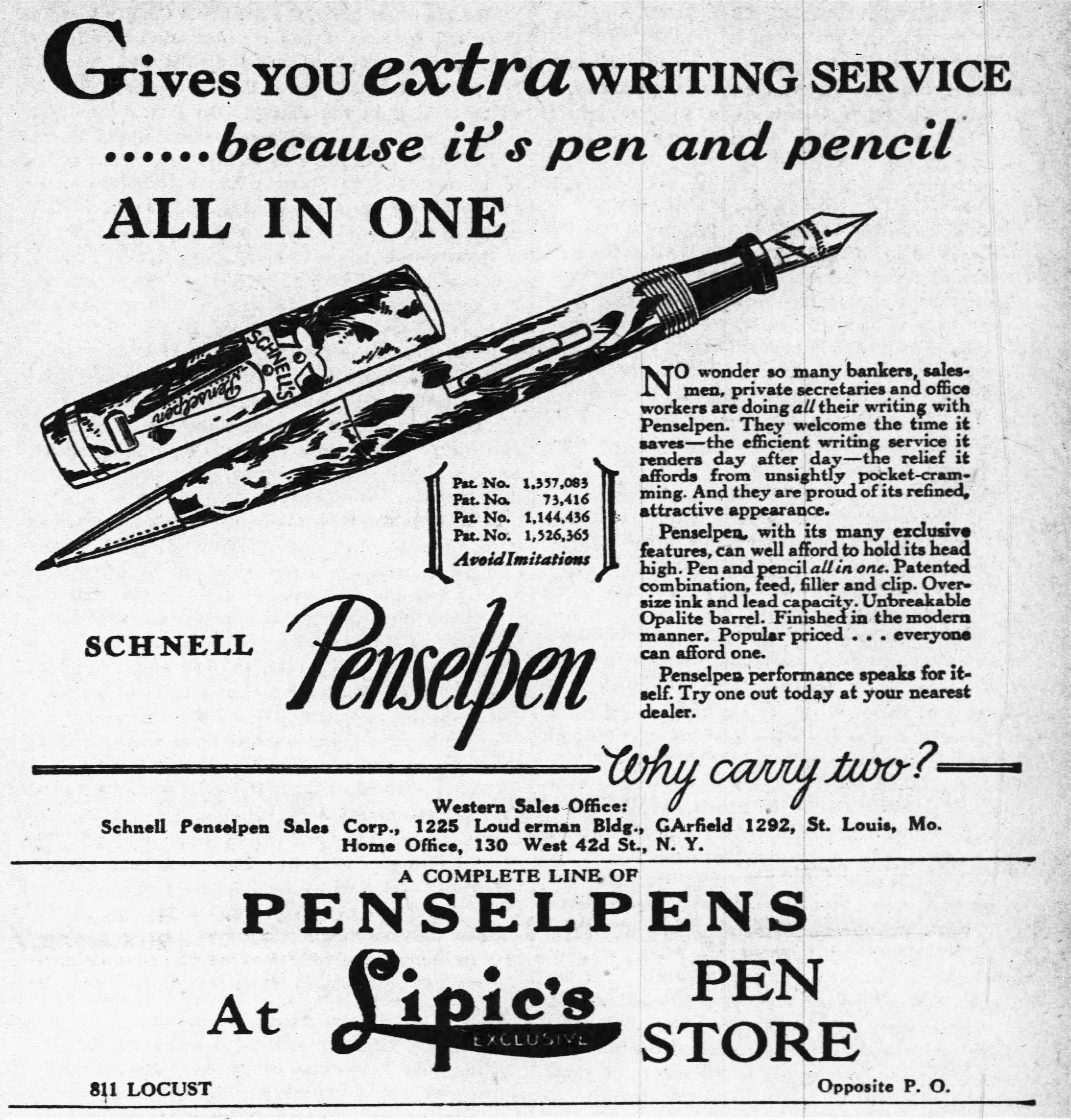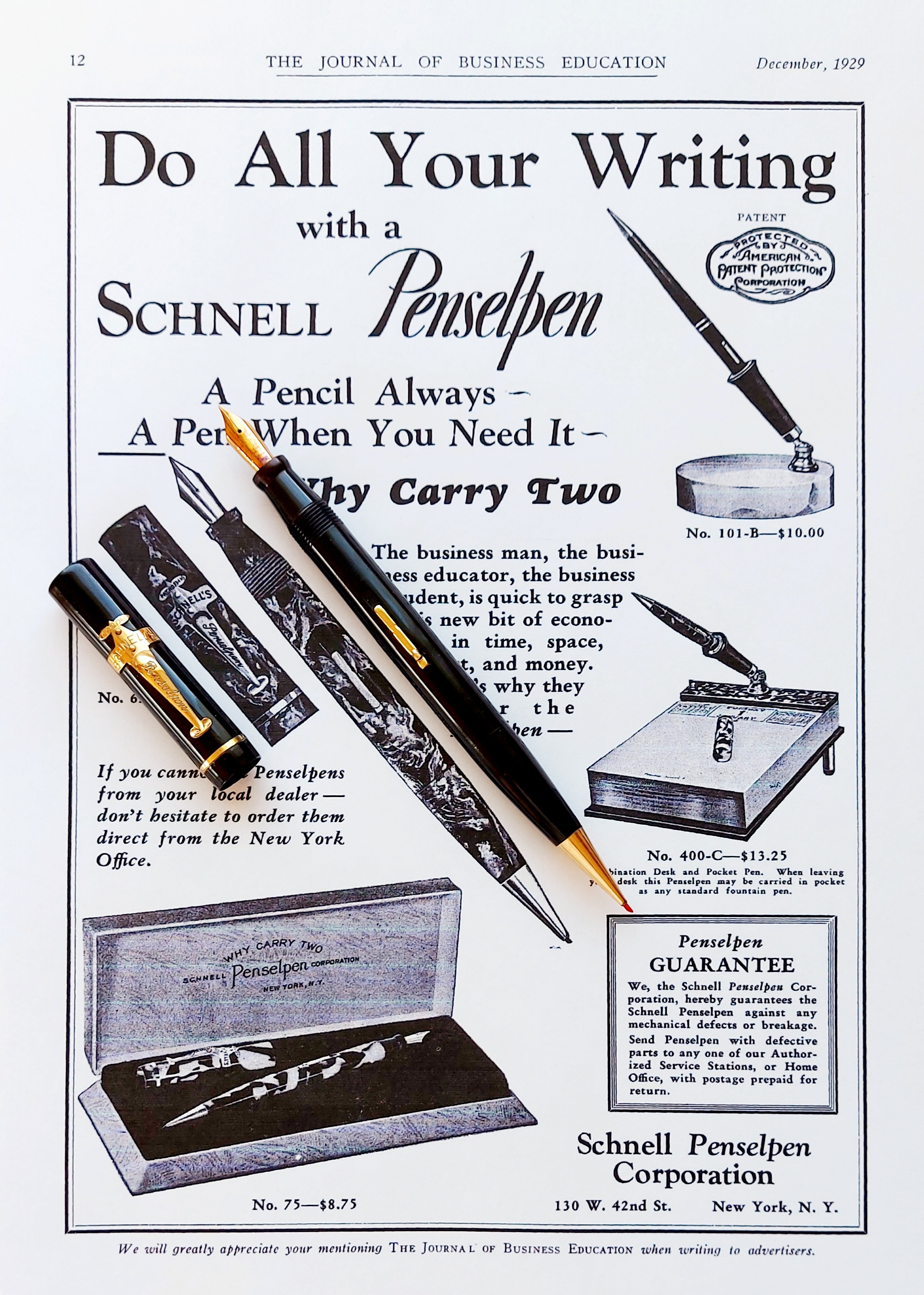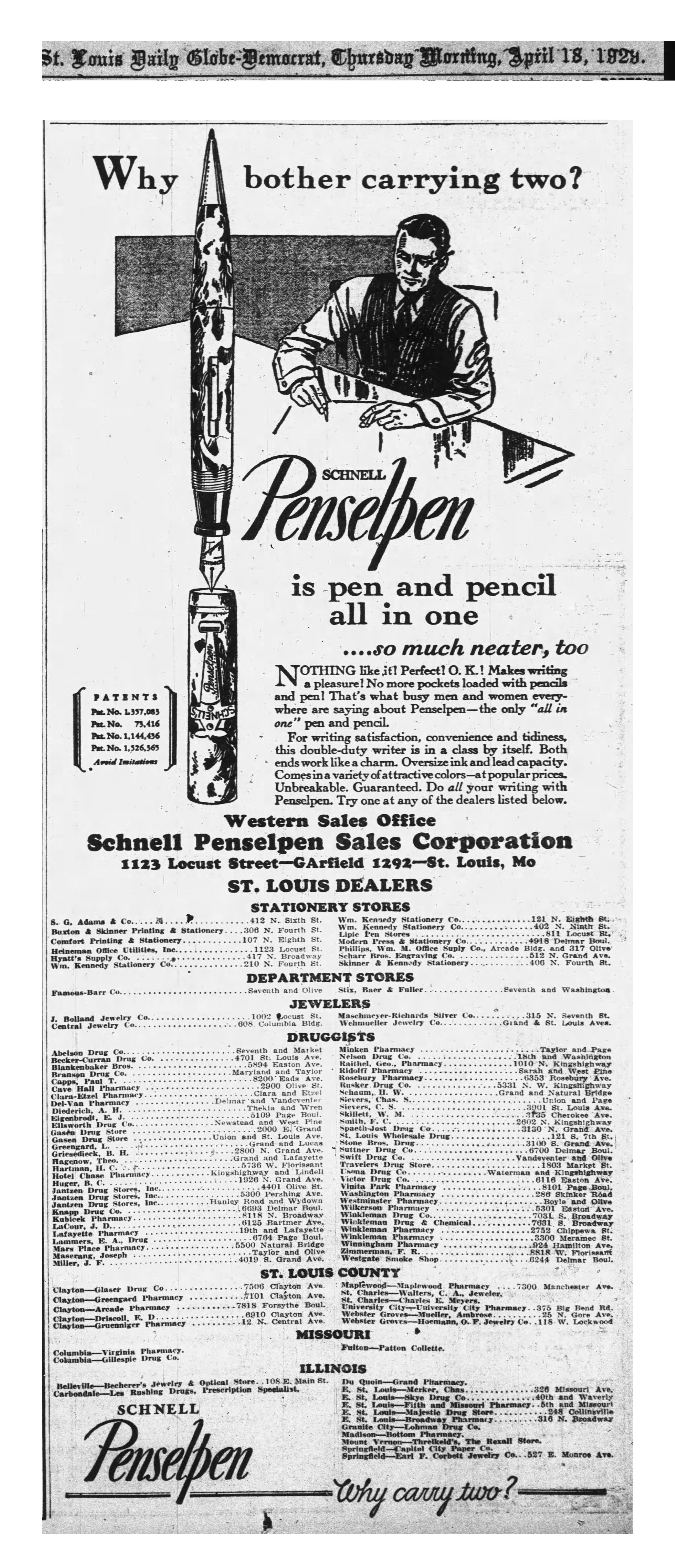 L’impresa di Schnell si proponeva di competere coi colossi del settore (sia tra le penne che tra le matite meccaniche!), come risulta da un annuario bancario (Rand McNelly Bankers Directory) aggiornato alla metà del 1928: