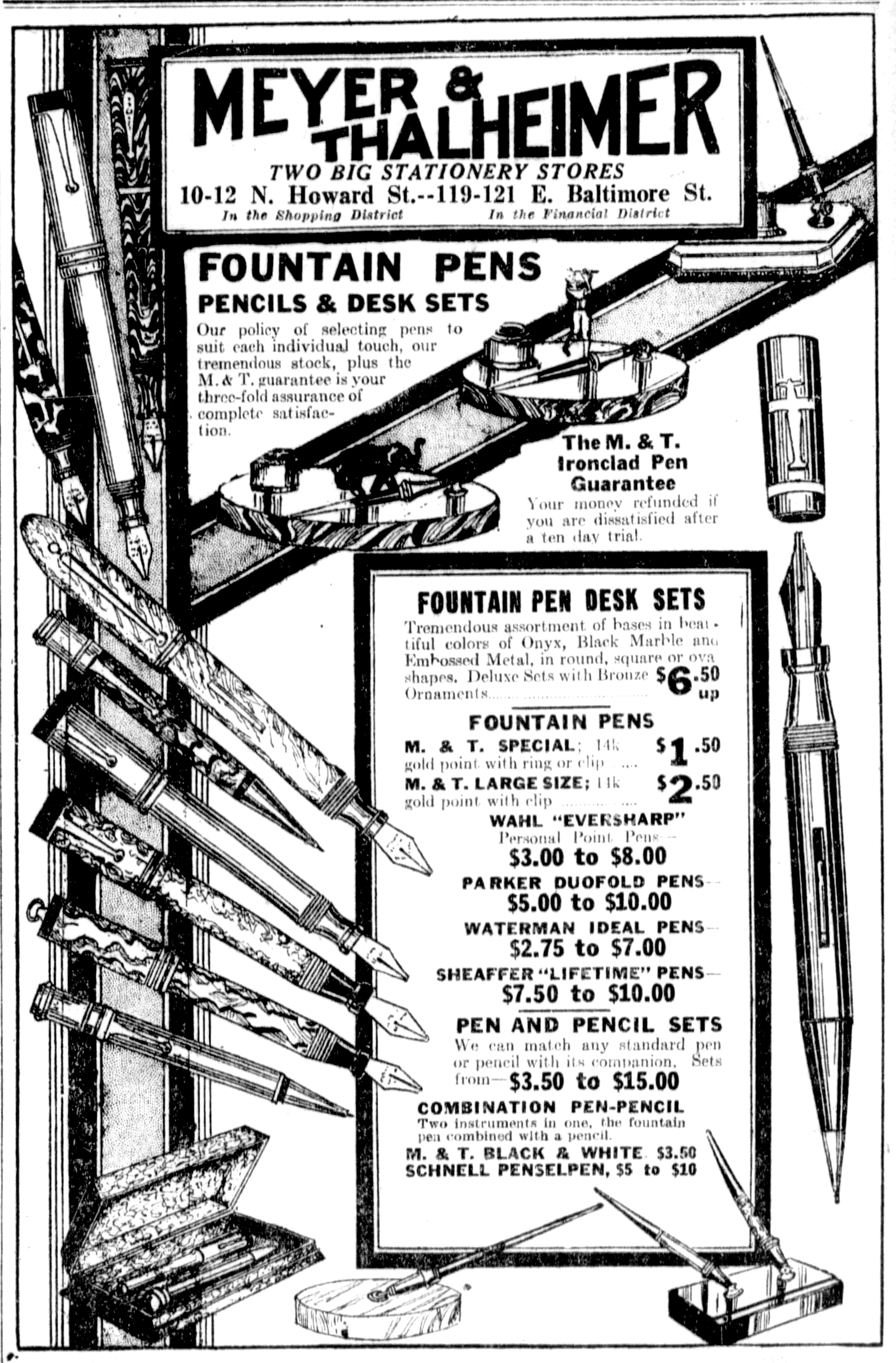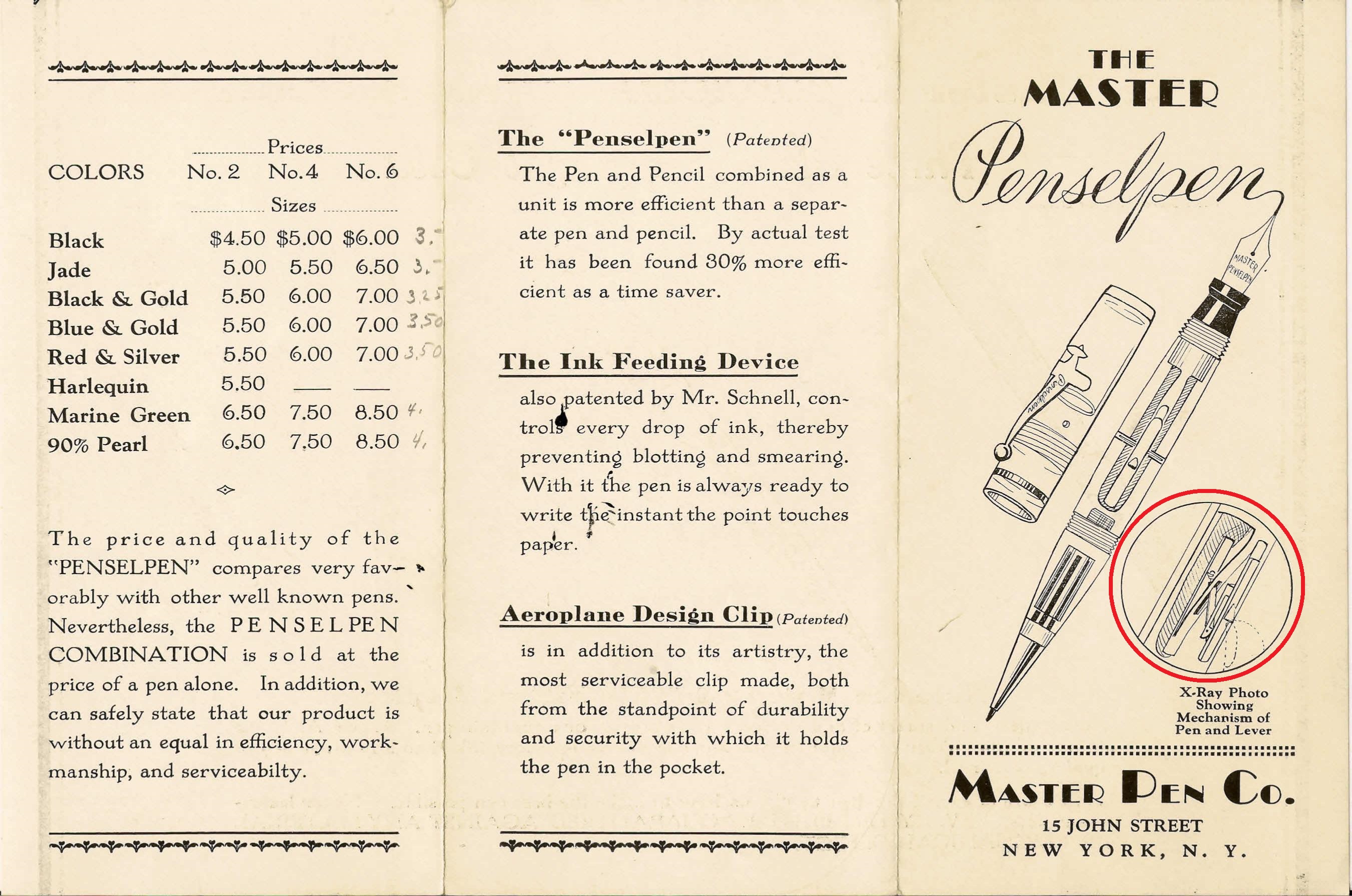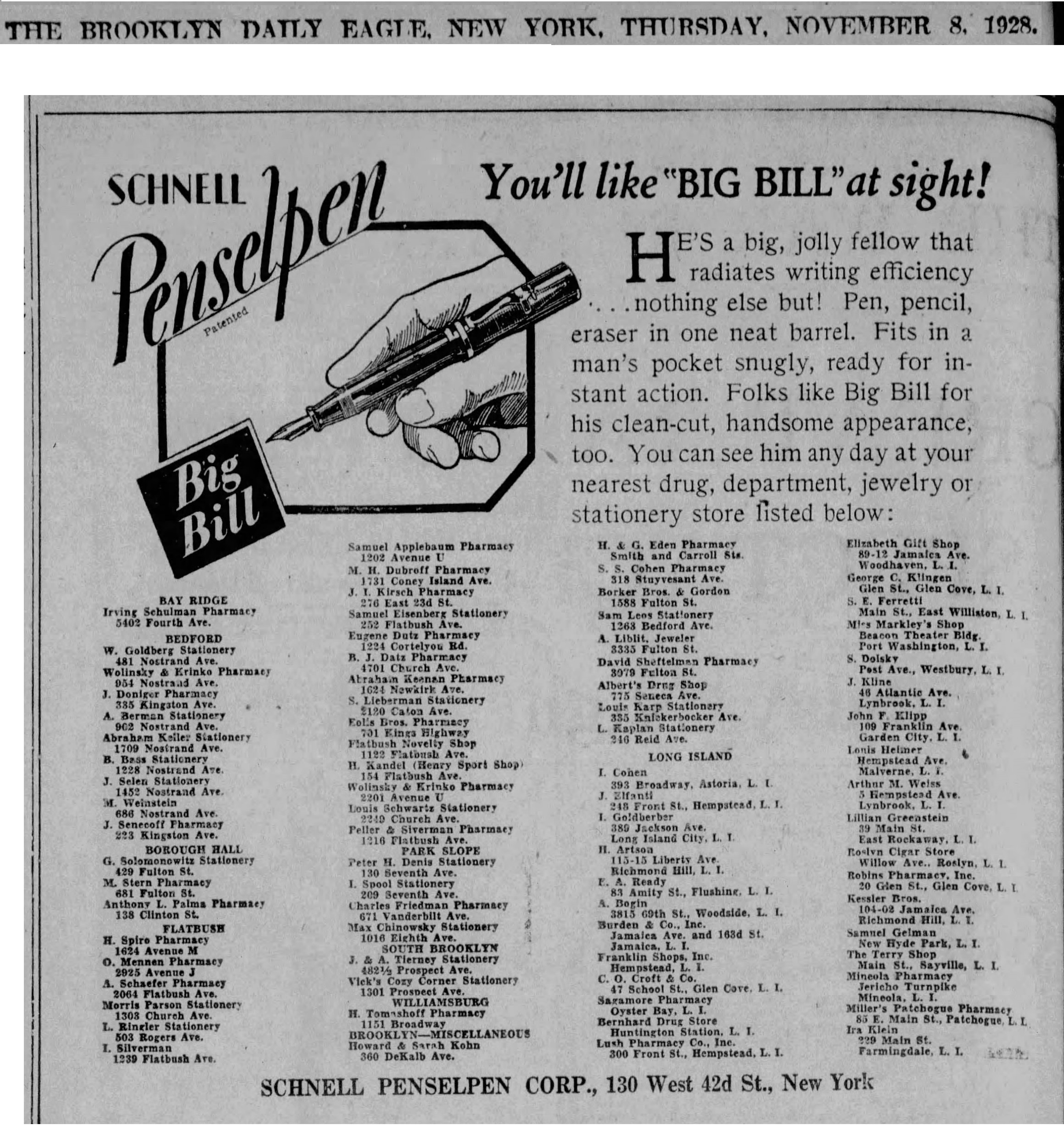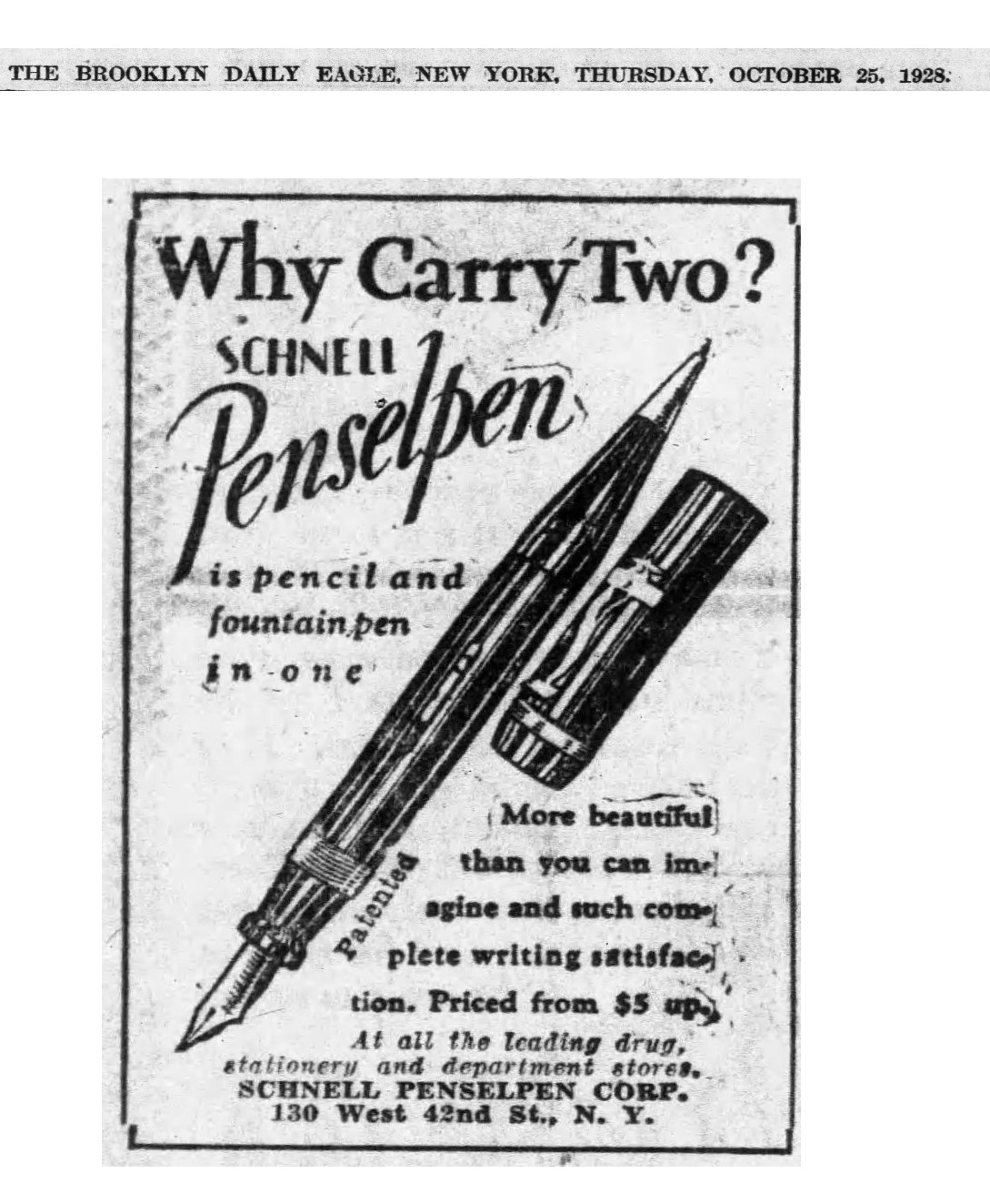 L’impresa di Schnell si proponeva di competere coi colossi del settore (sia tra le penne che tra le matite meccaniche!), come risulta da un annuario bancario (Rand McNelly Bankers Directory) aggiornato alla metà del 1928: