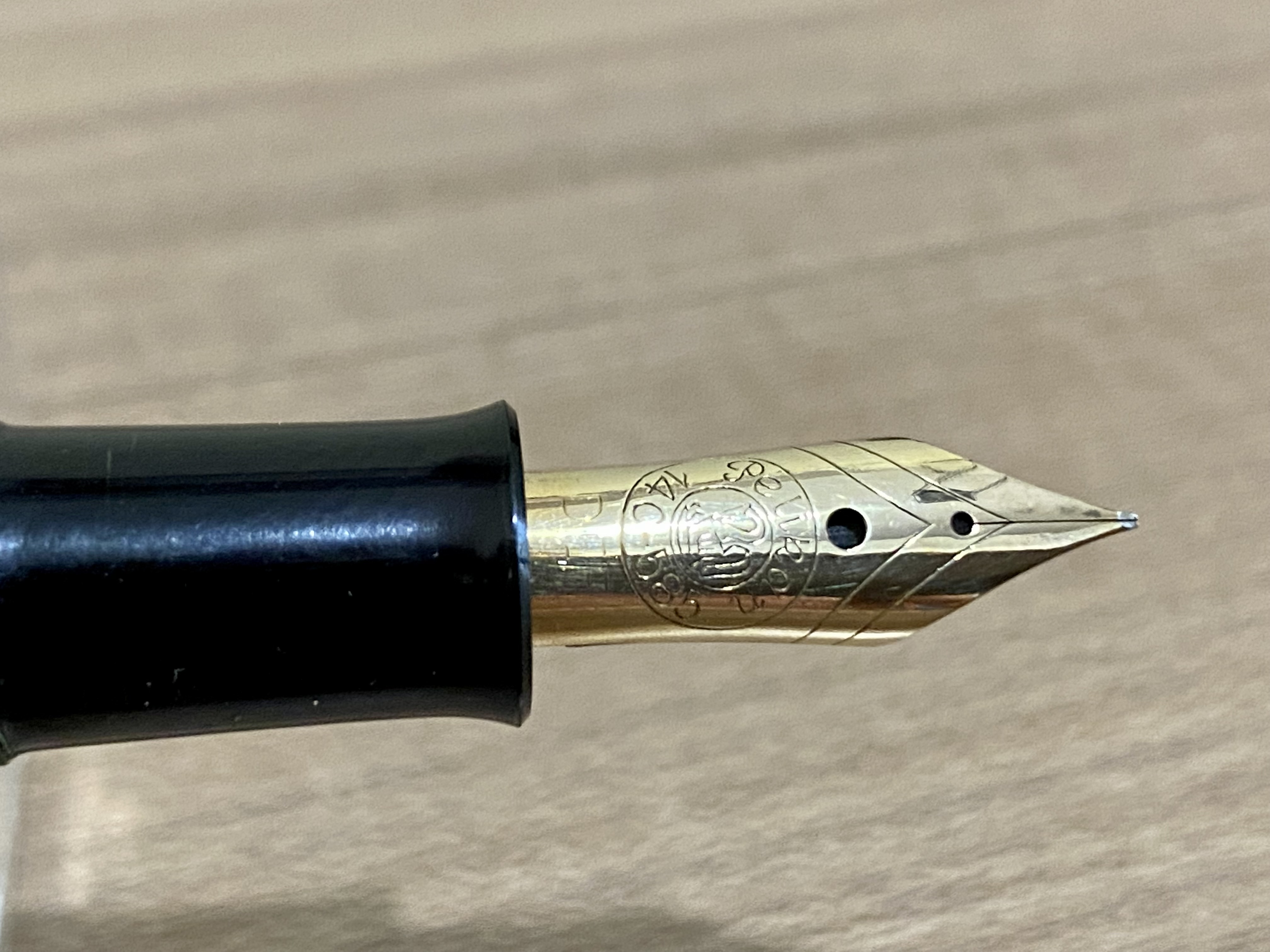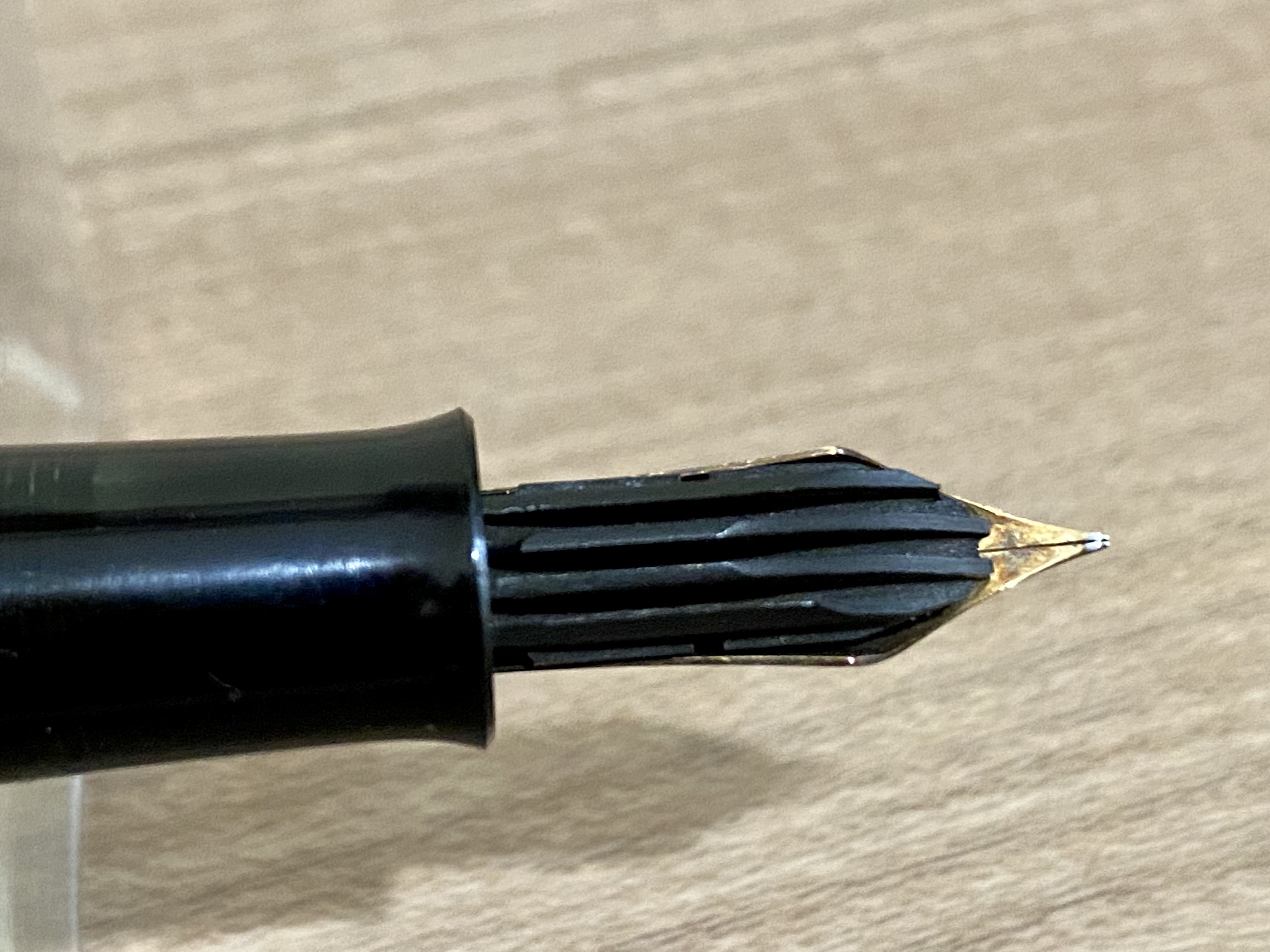 L’alimentatore è quello in ebanite con le alette verticali a formare tre scanalature. Il pennino che la equipaggia è un 14K gradazione DEF ossia un pennino EF per Carta Carbone (Durchschribe).