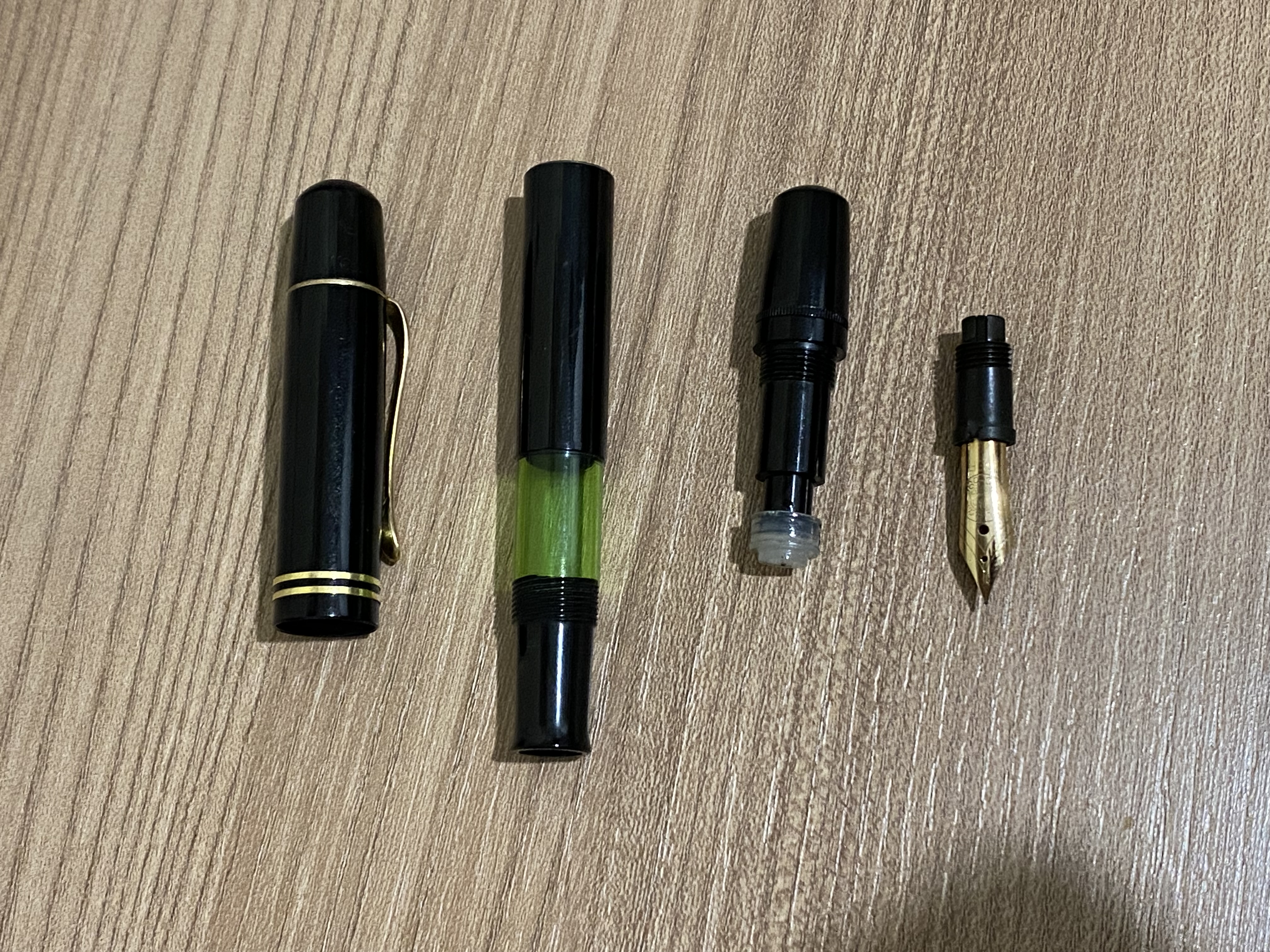 Su questo esemplare poi ritroviamo il collarino con due scanalature stile Montblanc, introdotto da Pelikan nel 1950, cosa che ne consente la rimozione con una apposita chiavetta.