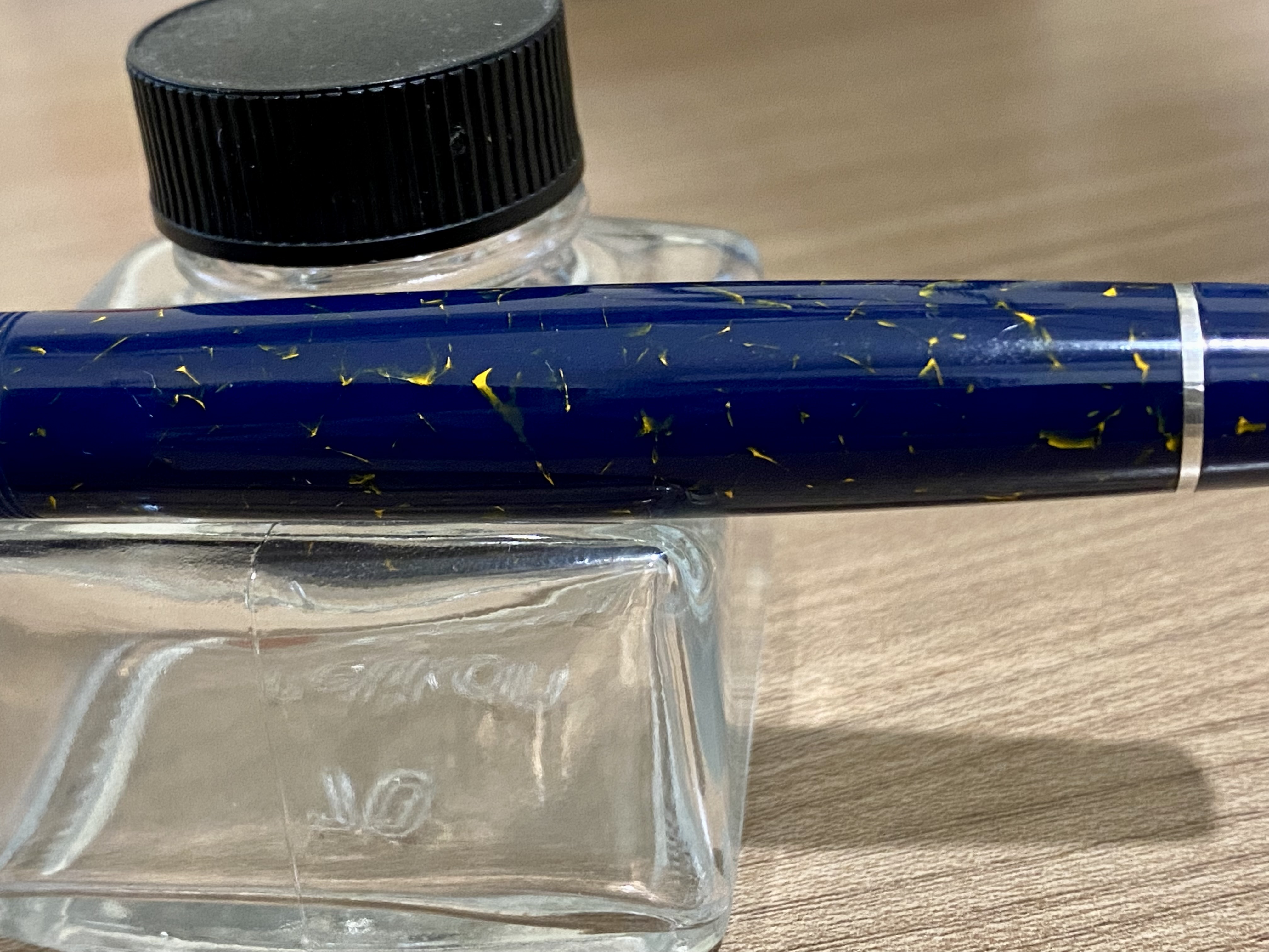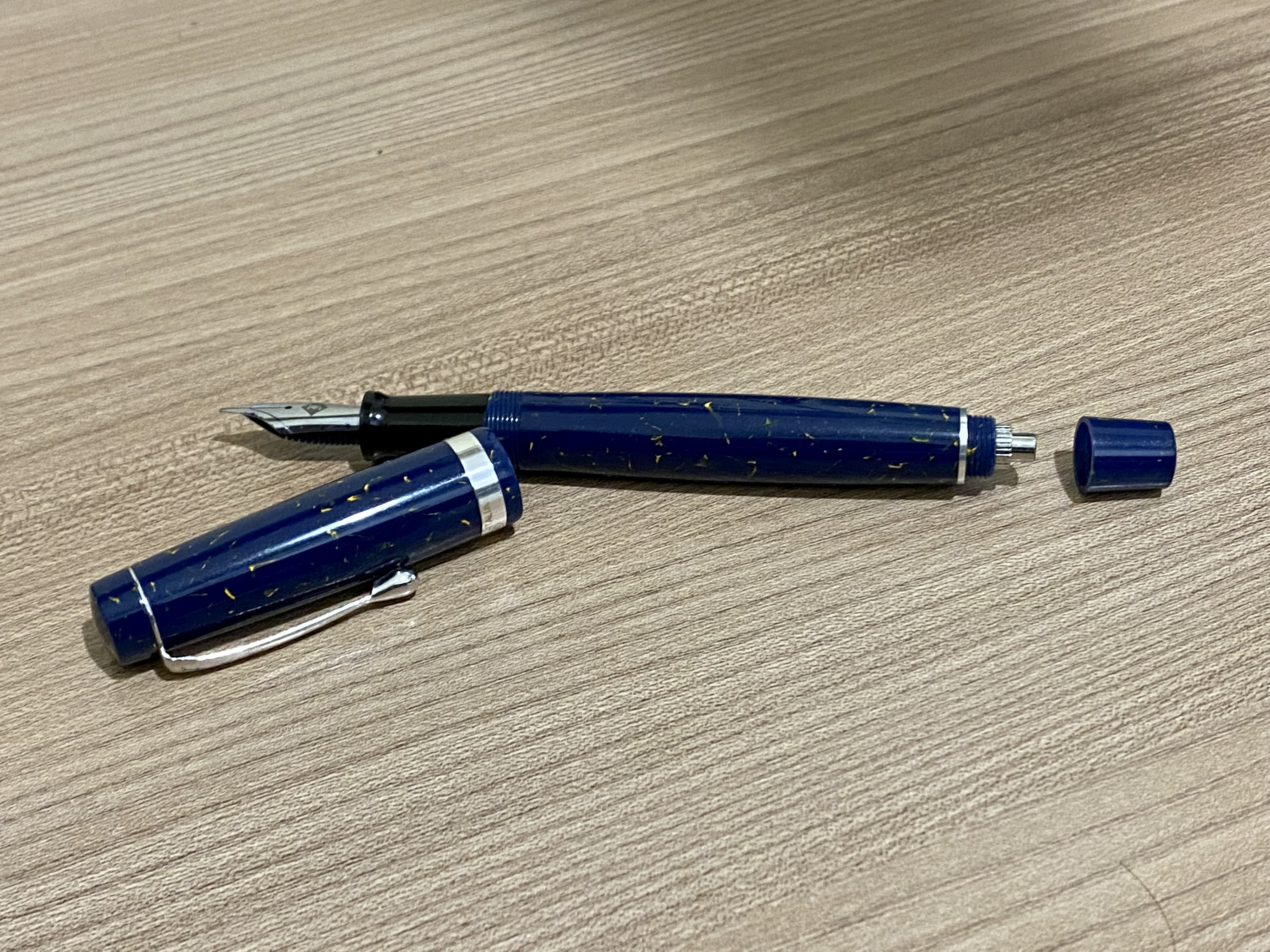 Il materiale della penna è stato la prima cosa che ha attirato la mia attenzione, è una moderna celluloide blue con delle screziature arancio, se vogliamo nulla di esotico, non vi sono sfumature particolari e tanto meno presenta la profondità e la luminosità tipiche delle più esclusive celluloidi prodotte, ma è comunque accattivante e, soprattutto, piacevole al tatto.
