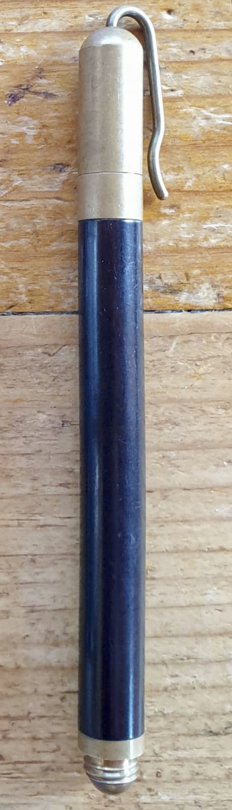 Un'eccezione per questa vecchia sfera giapponese Pentel, direttamente da Villabassa, ieri. Ottone ed ebanite, lunghezza cm 14, probabilmente anni ‘70; ma sono gradite informazioni più dettagliate.