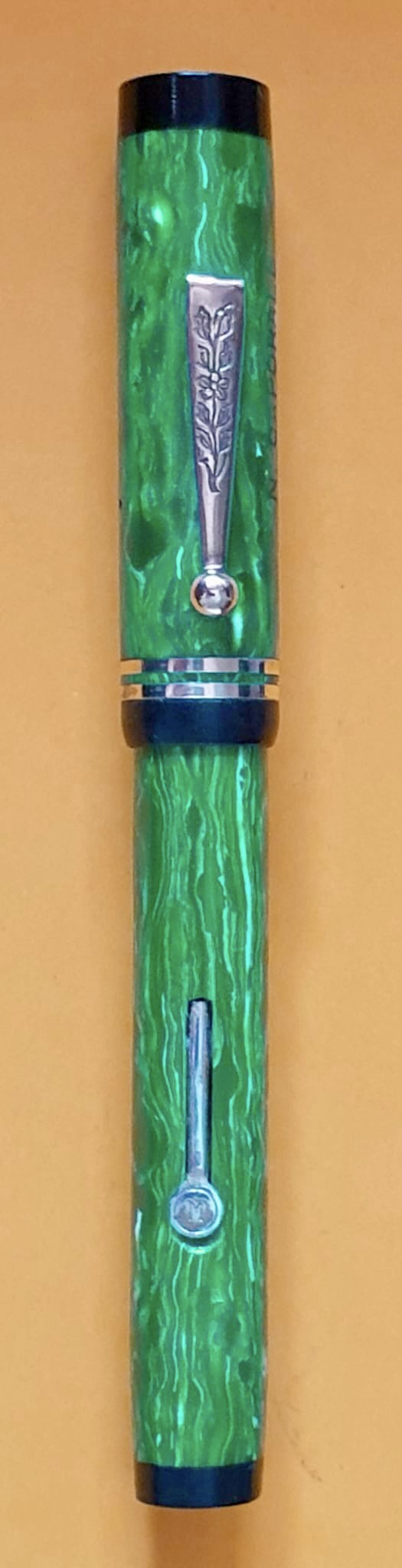 Bellissimo verde marmorizzato per questa probabilmente centenaria Good Service Pen Co. - Chicago in celluloide. Come vedete, pennino importante, coevo ma non originale.