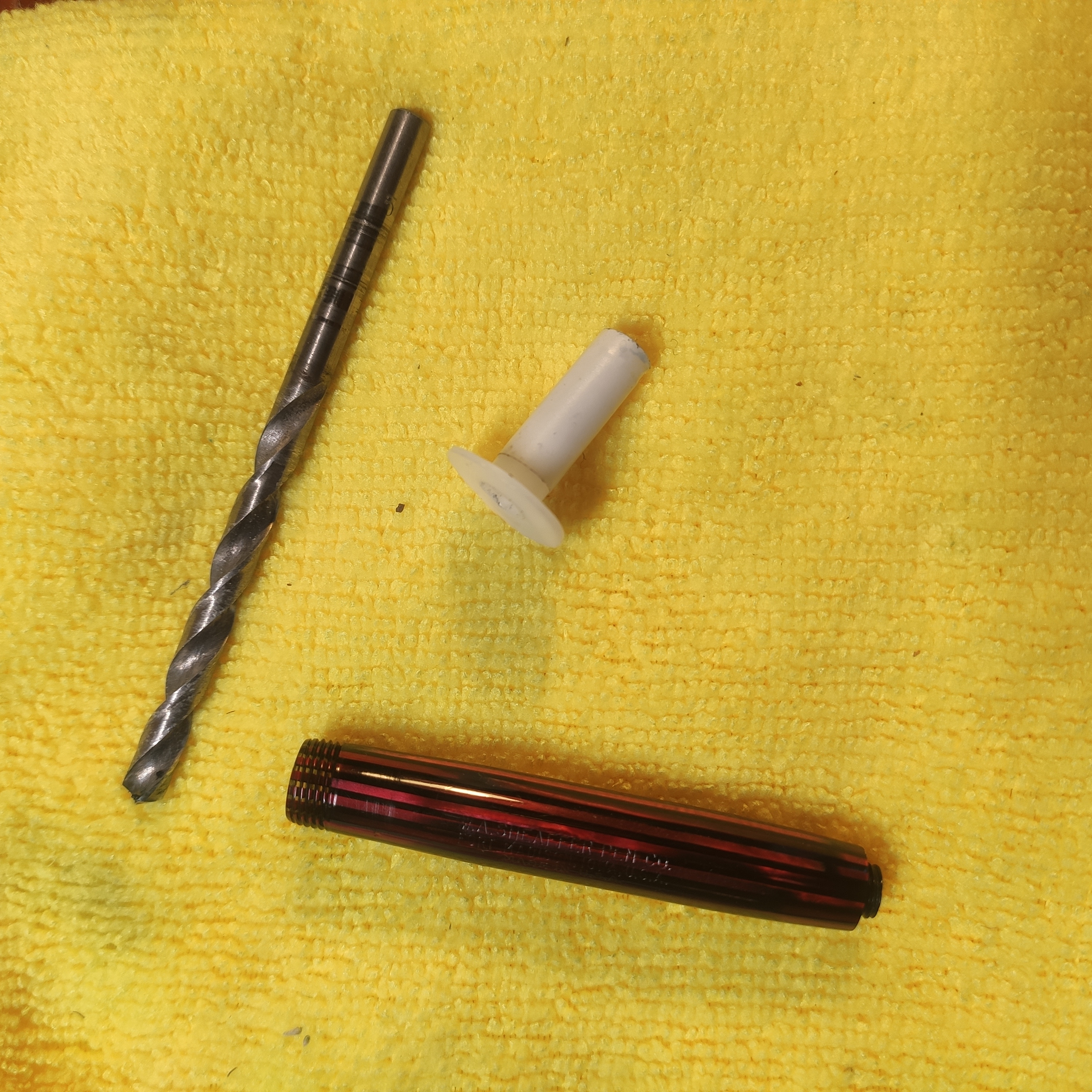 Utilizzando la guida bianca inserita nel fusto, trapanare per liberare il fondo del fusto dalla vecchia “guarnizione” (sono dischetti di feltro). Questa fase è la più critica, poiché non bisogna né far toccare la parte laterale della punta del trapano alle pareti del fusto (in tal caso la “guida” mi ha aiutato) né far riscaldare troppo la parte dove si sta trapanando. Trapanare per qualche secondo e poi lasciar raffreddare. Poco alla volta. Praticamente dovete trapanare per liberare il fondo del fusto dalla parte interna di una parte di plastica in cui sono bloccati i discetti di feltro. La punta deve essere da 5, poiché bisogna lasciare un po’ di bordo dove poi incollare la rondella bianca.