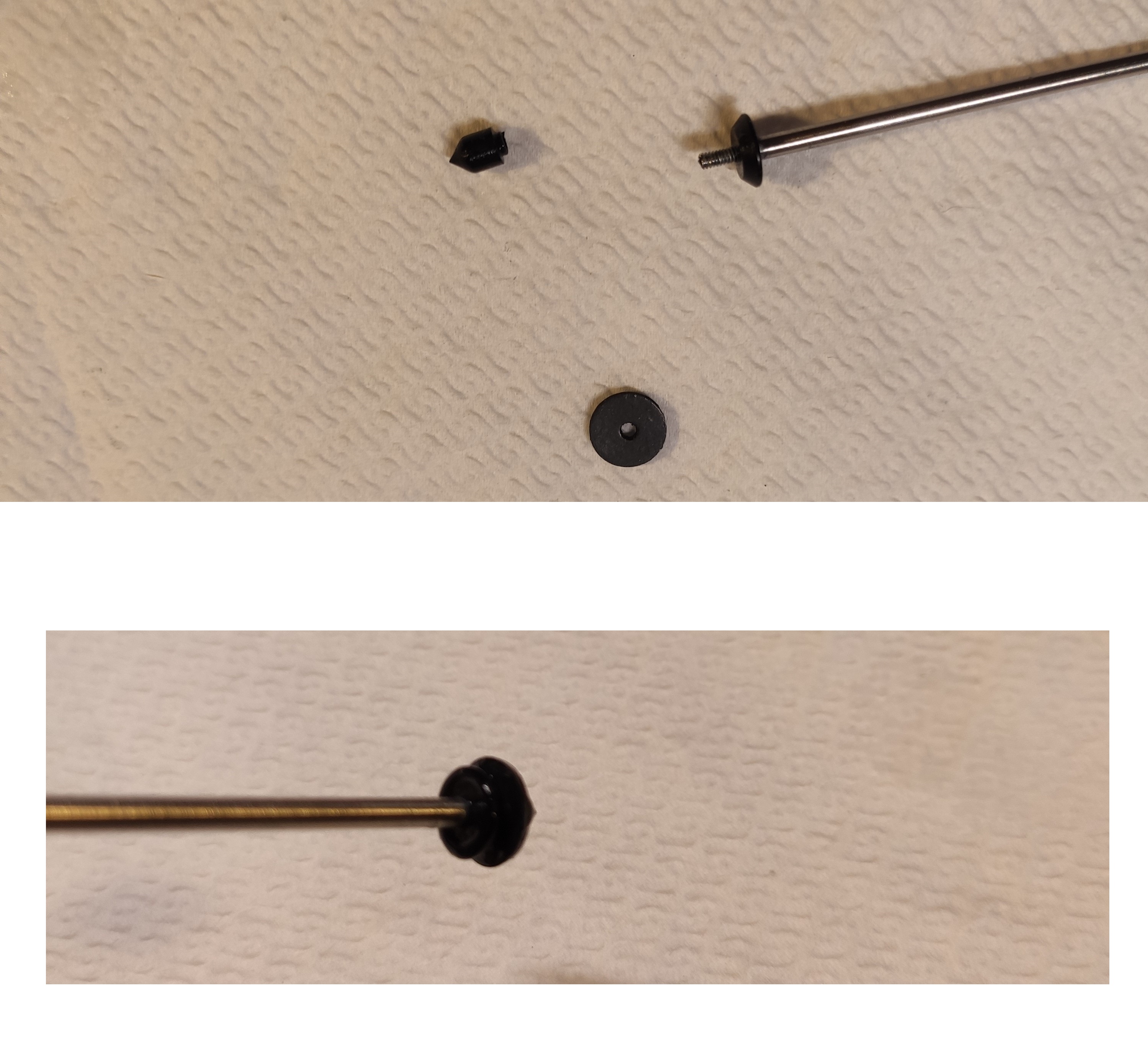 Passiamo ora all’alberino. Anche qui va sostituita la guarnizione, ma qui è davvero semplice. Svitare la punta, togliere la vecchia guarnizione e inserire la nuova (una parte in plastica è saldata all’alberino e chiaramente non va rimossa, serve per mantenere la guarnizione). Mettere un po’ di grasso siliconico sulla guarnizione e riavvitare la punta in plastica sull’alberino.