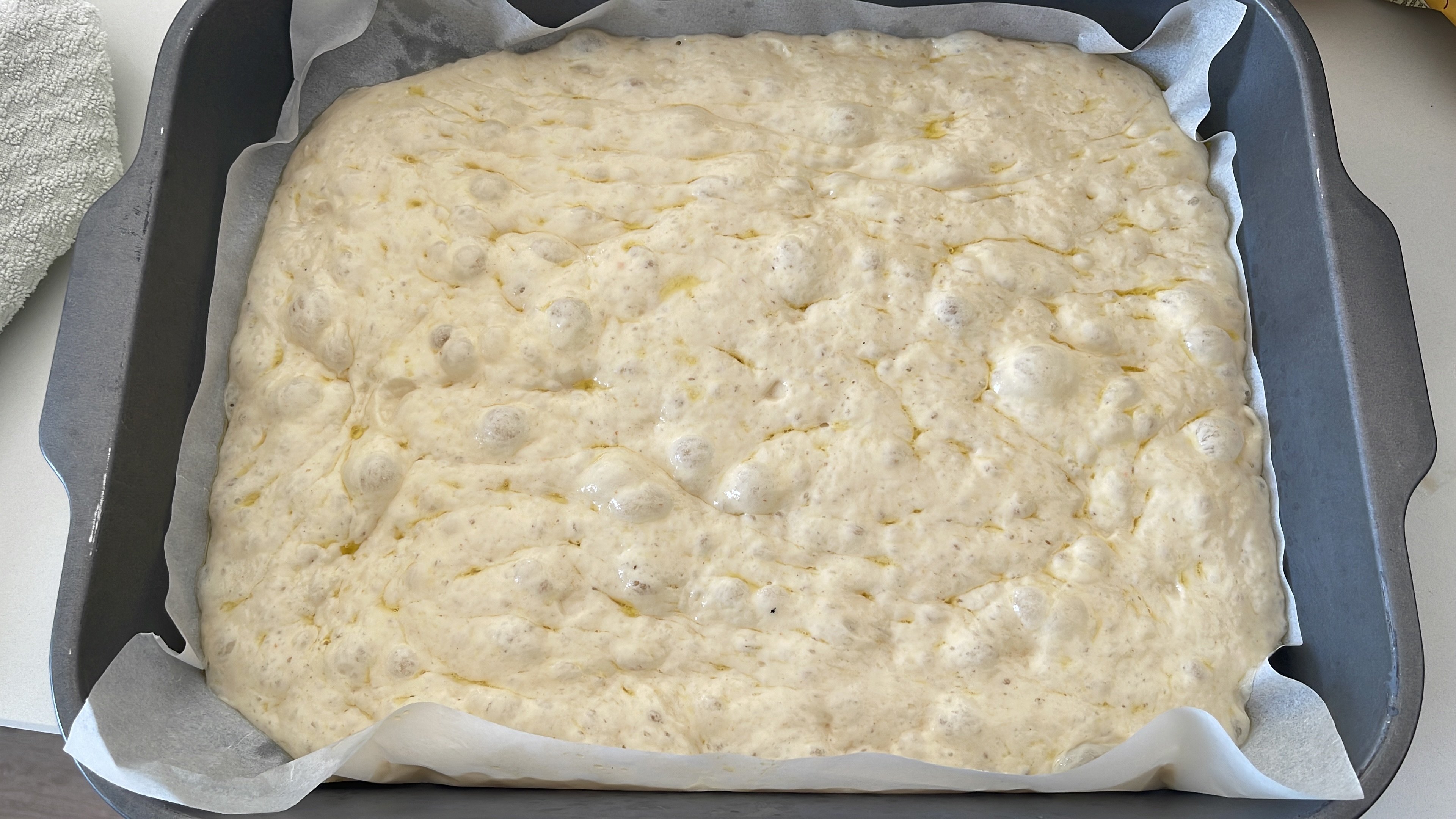 Passate le due ore, travasare l’impasto in teglia e allargarlo con le dita sugnose di olio e rimettere al calduccio per un altro paio d’ore.