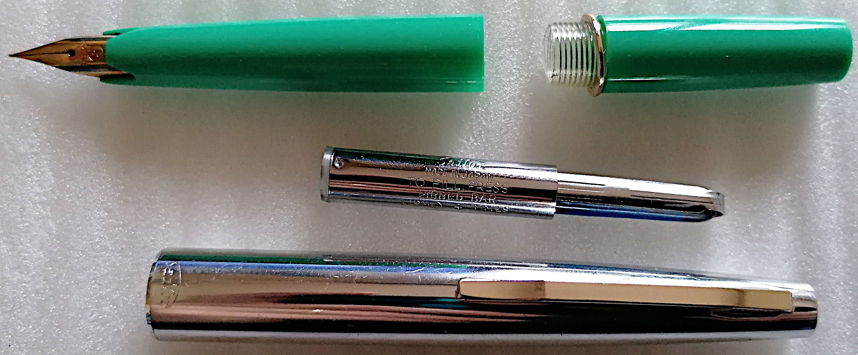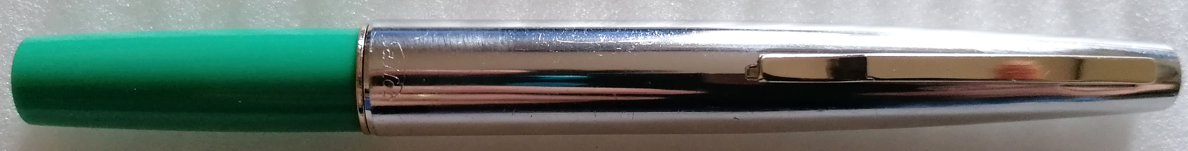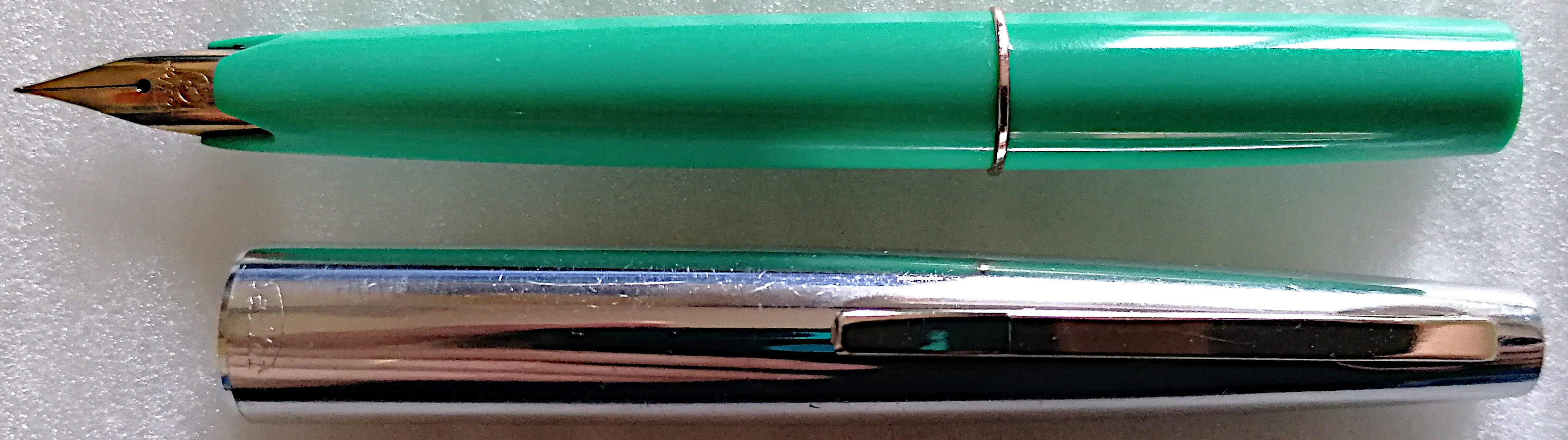 ho trovato questa Sailor, direi stile scolastica, in plastica color verde, molto mini senza cappuccio d'acciaio (ma scrive bene sia calzato sia no),