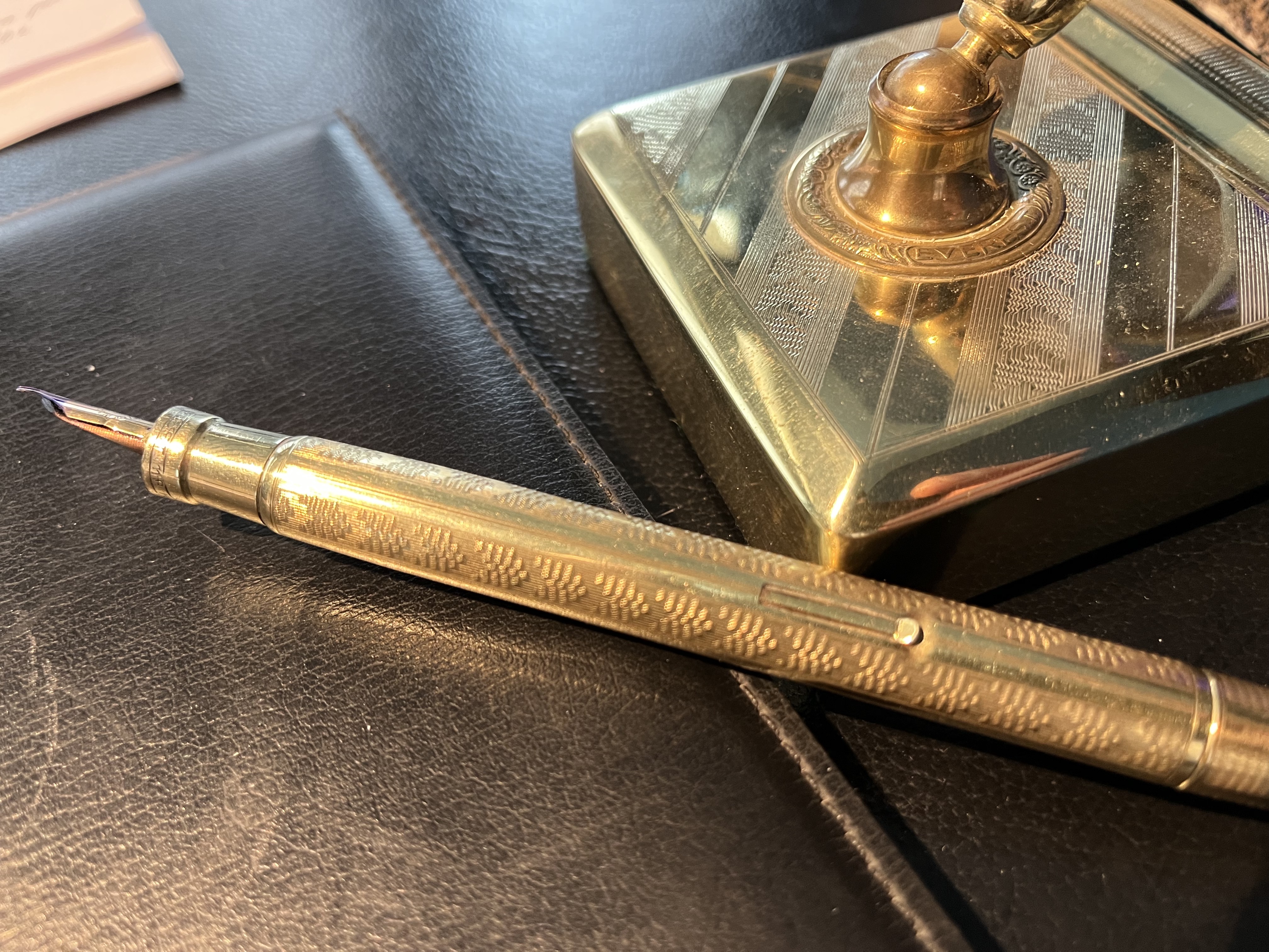 Salve a tutti... mi appello a voi più esperti per sapere qualcosa in più rispetto a questo regalo che mi hanno appena fatto. Una penna everets tutta laminata in oro 18 K, con un bel pennino molto flessibile di 14 c... Chi me l'ha regalata mi ha detto che come epoca è in mezzo tra i pennini e calamaio e le prime stilografiche... Ha infatti l'alloggiamento tipico del pennino ma anche il caricamento a sacchetto..... Grazie a tutti per le info....