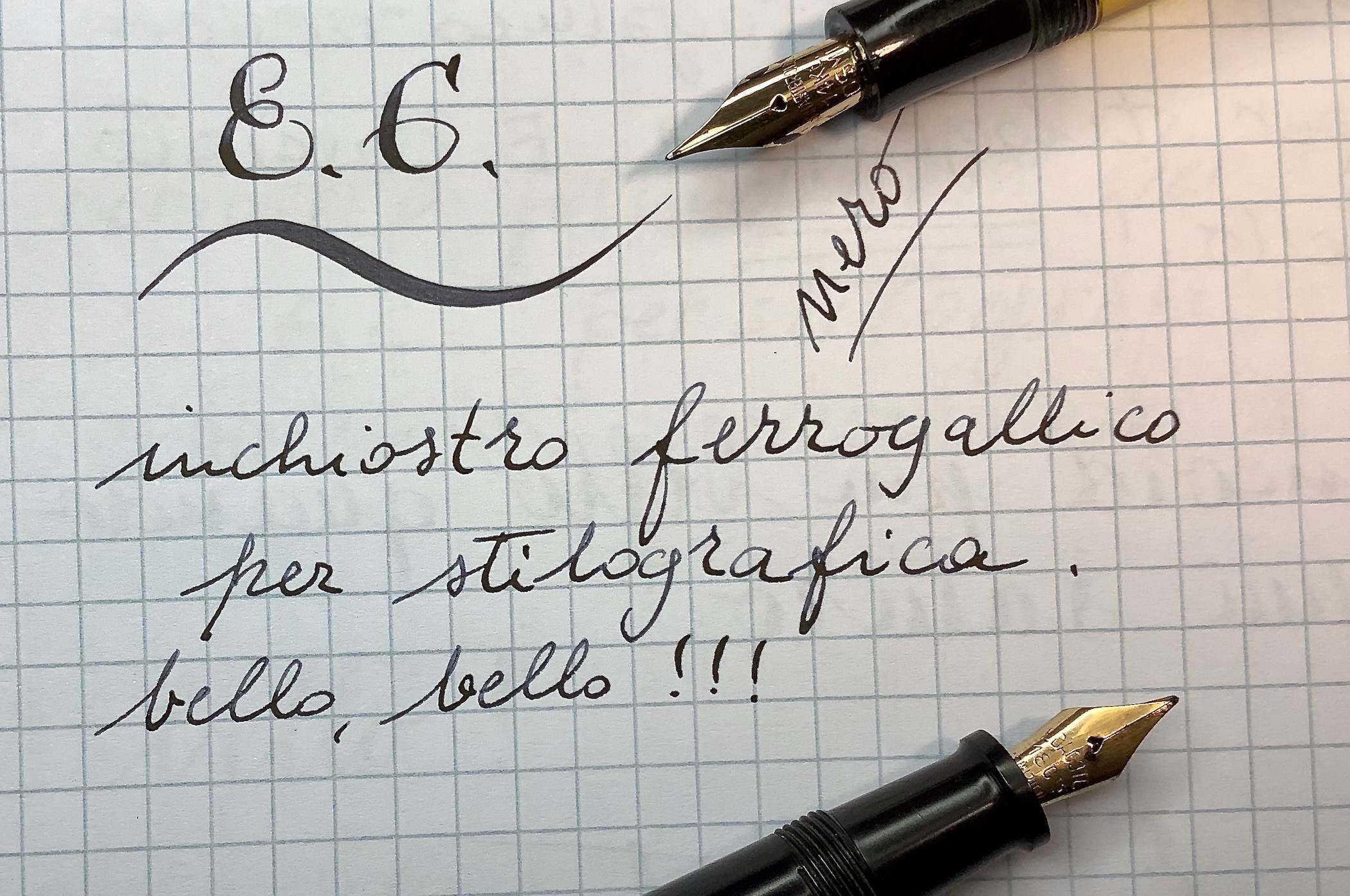 Ho avuto modo di vedere questo inchiostro al Pelikan Hub. È davvero bello, su tratti molto larghi una volta asciutto è un bel nero intenso. Poi, ottima resistenza all'acqua, il signor Casciato ha fatto le prove con altri inchiostri e una bottiglietta d'acqua. Questo ferrogallico non ha fatto una piega, ottimo