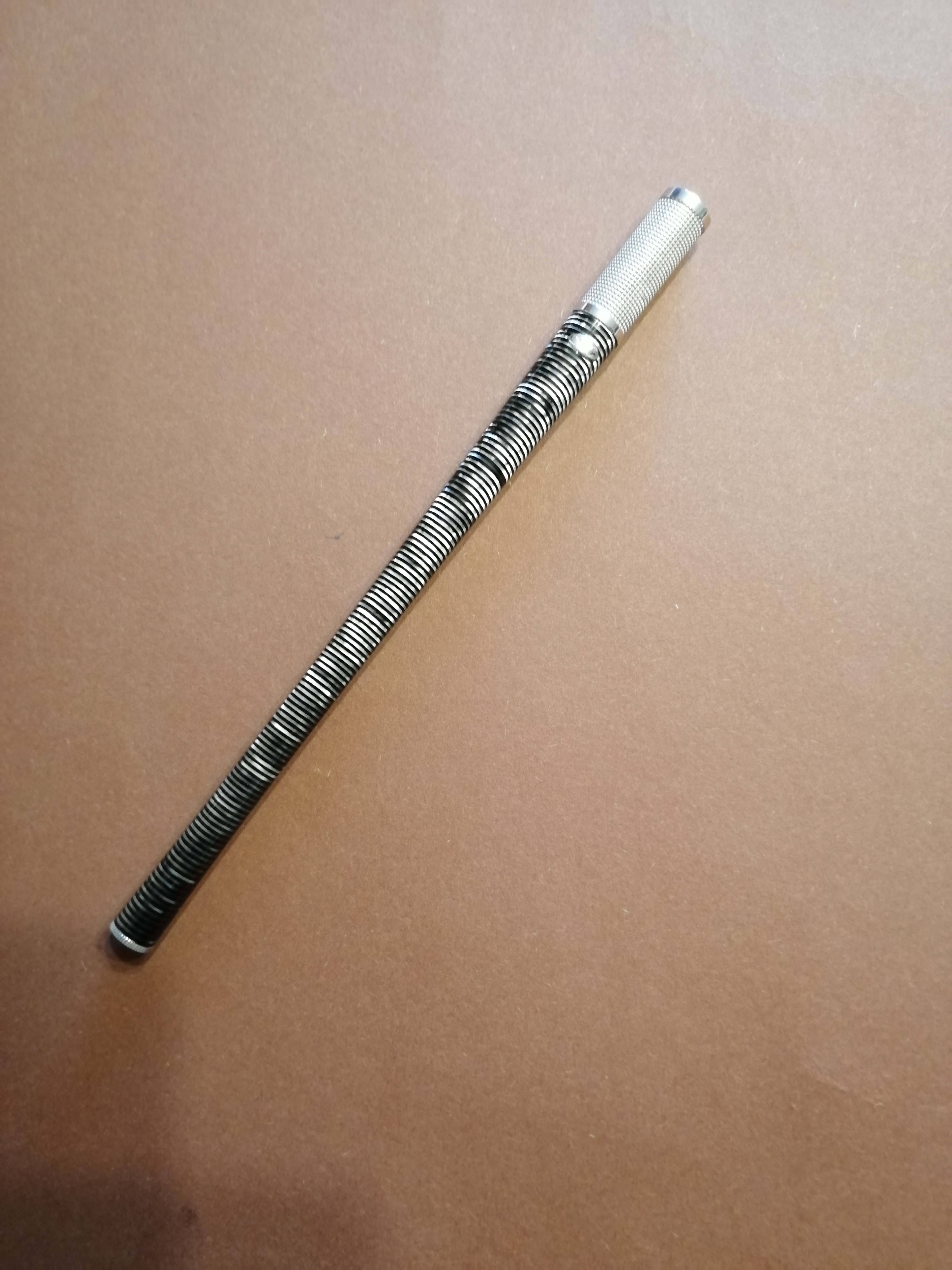 Serviva acquistare questa ulteriore cannuccia? Probabilmente no, ma é bellissima. Realizzata dalla Sec in celluloide anellata con impugnatura in metallo ha un grip piacevolissimo e un bilanciamento ideale. L'attacco brevettato in ebanite assicura inoltre un'ottima resistenza ad aventuali residui di inchiostro e acqua.