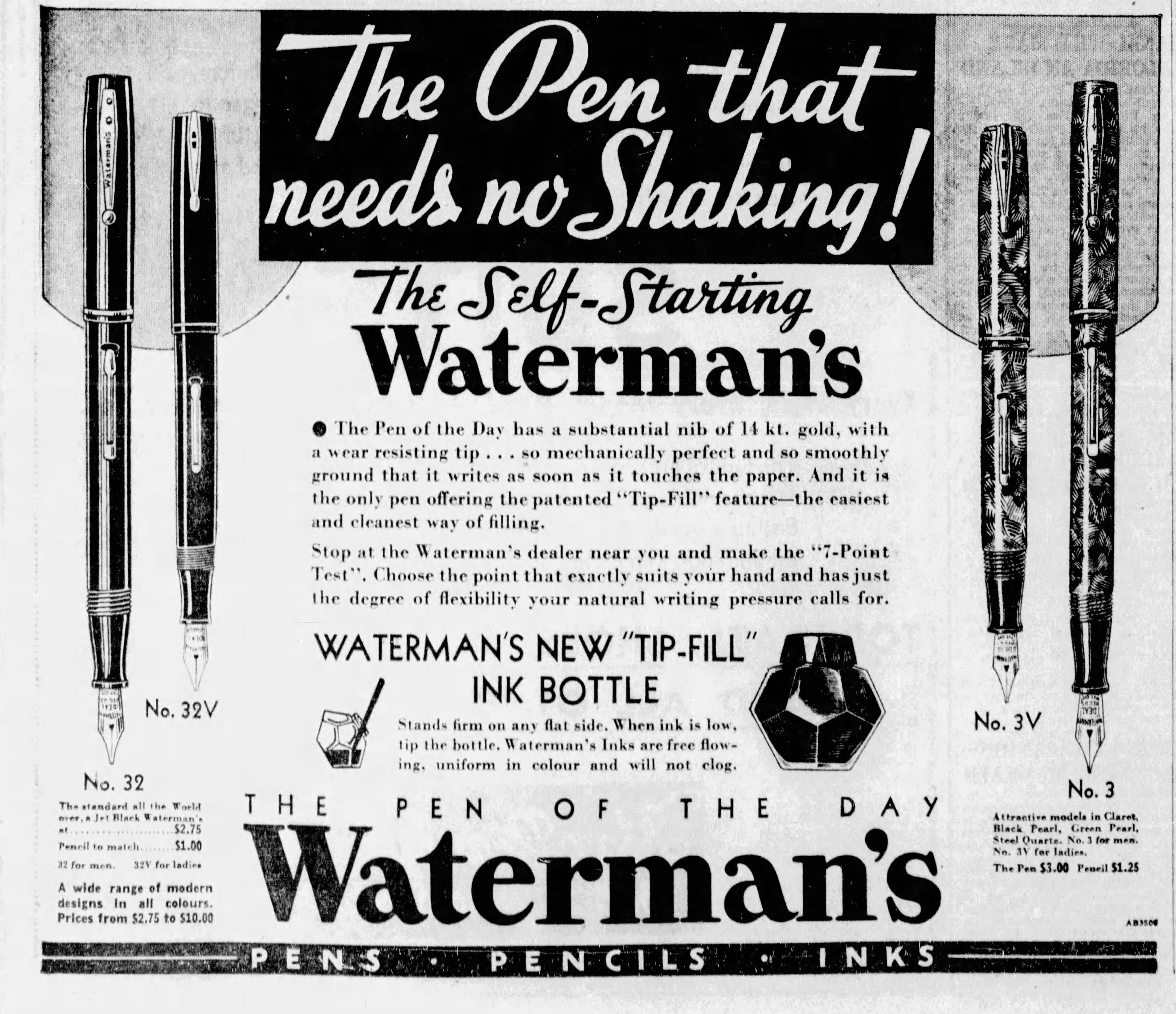WATERMAN’S Inks: DE LUXE “TIP-FILL” BOTTLE (G. Larsen) — New York, 1935