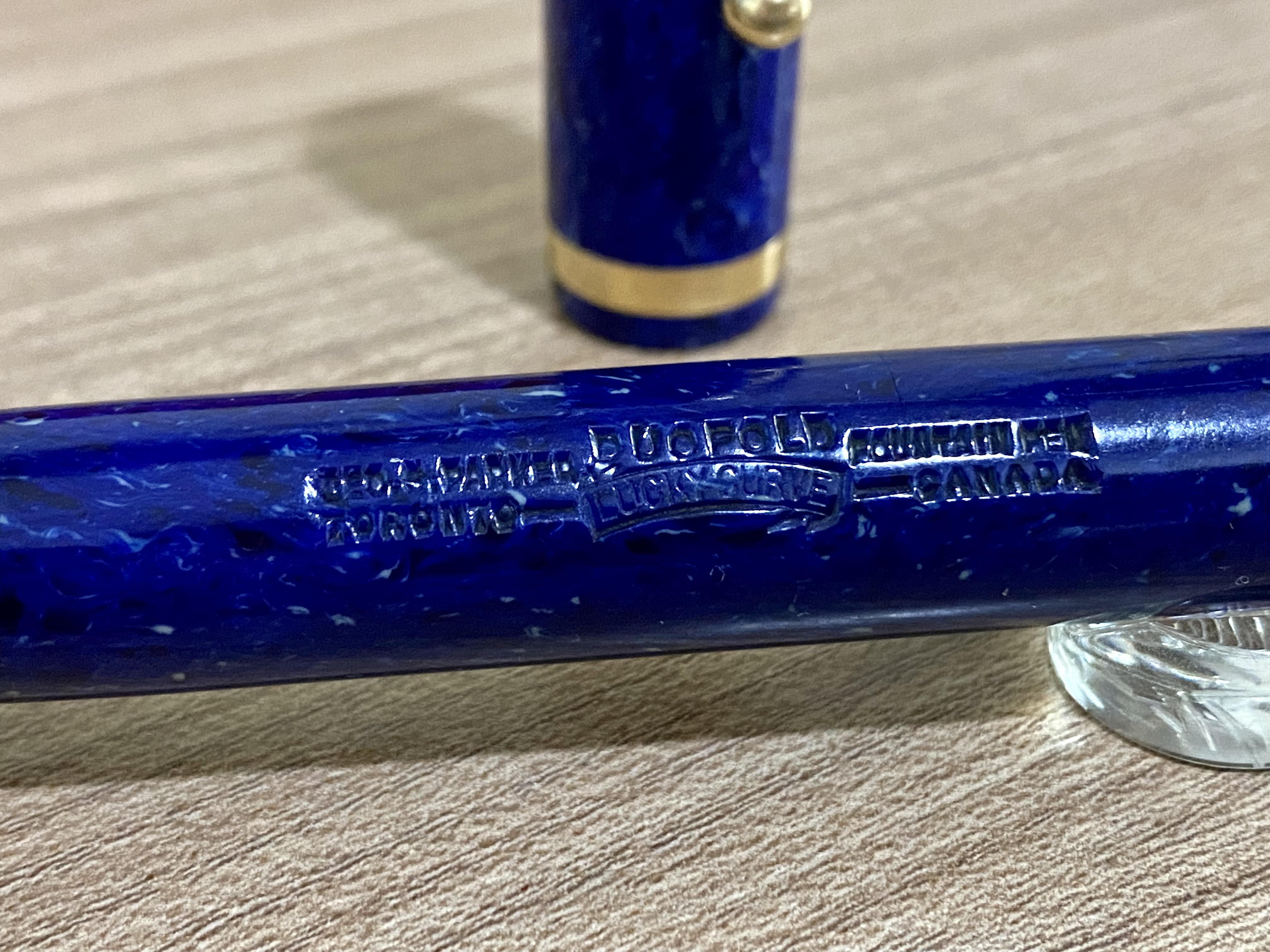 Sul fusto della penna troviamo l'incisione Geo. S. Parker Duofold Fountain Pen Toronto Canada con al centro il logo "Lucky Curve", ovvero il modello di penna da cui nasce la Duofold, più precisamente la Lucky Curve #26. Anche l'incisione ha subito diverse trasformazioni, divenendo rispetto ai primi modelli sempre più piccola fino alle dimensioni di questa versione