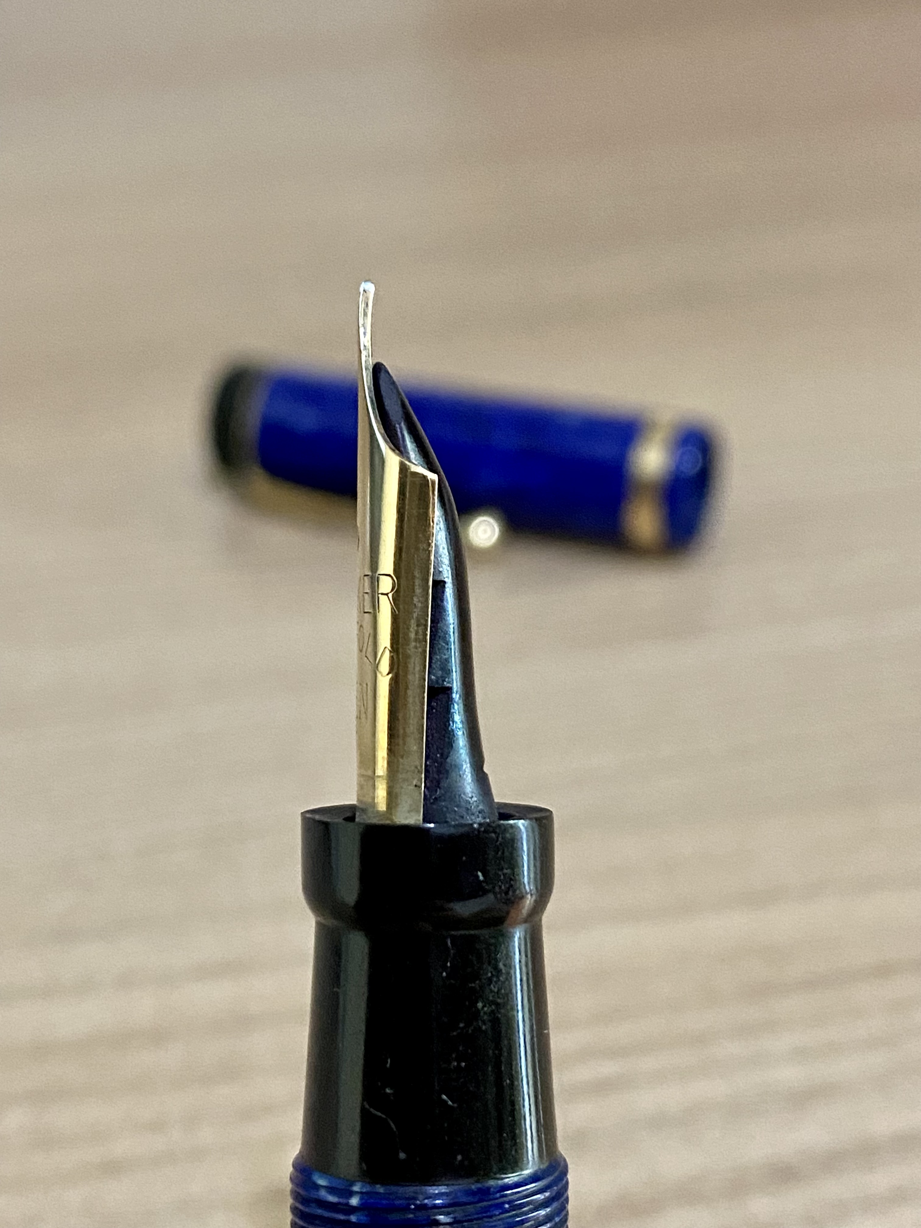 Benché l'esemplare è in condizioni estetiche perfette, praticamente pari al nuovo, reputo che il pennino per qualche motivo ignoto, è stato sostituito non essendo marcato Canada. Peraltro, a differenza del resto della penna, si nota subito che è un pennino alquanto usato, l'iridio ancora è presente ma non è certo quel che ci si aspetta su un pennino nuovo o quasi nuovo.