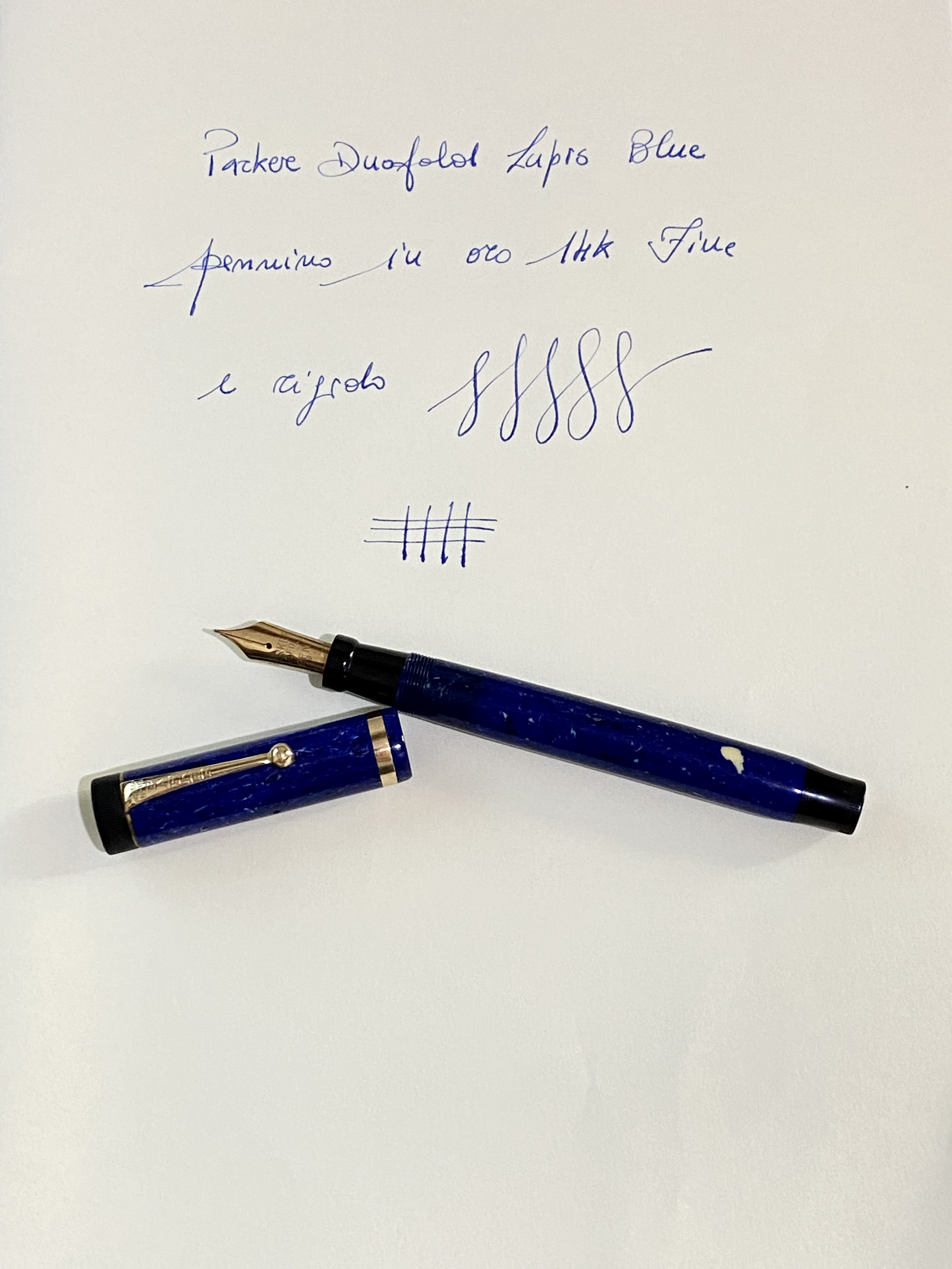 Scrive come ci aspetta da un Duofold di un centinaio di anni fa, bene, in maniera consistente e, a disprezzo della fama del lucky curve, non ha mai rigurgitato inchiostro (considerando che la uso da una settimana scarsa). Il pennino è rigido con un tratto fine e dal flusso non eccessivo ma costante, una penna che è fatta per lavorare e si sente.