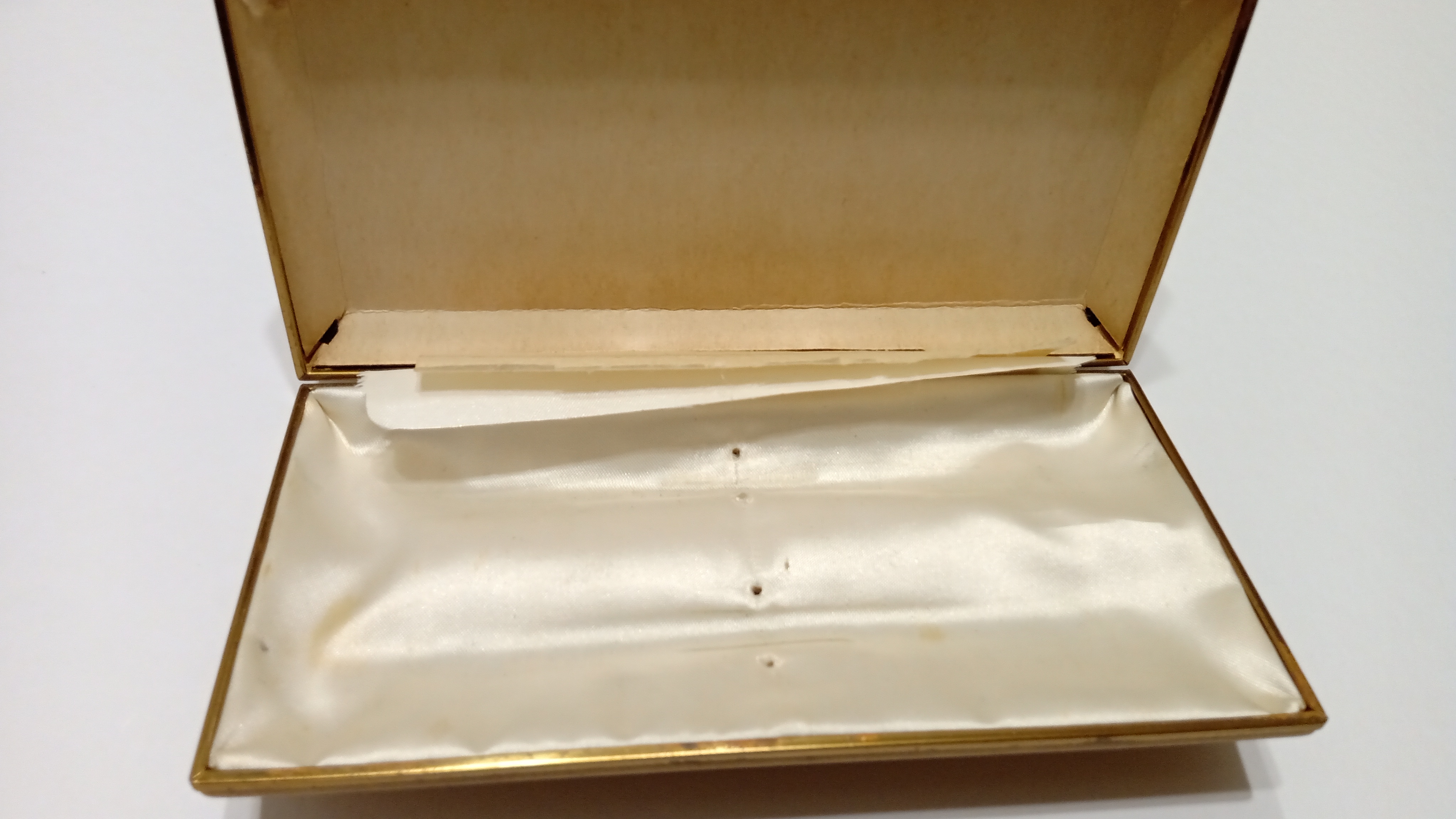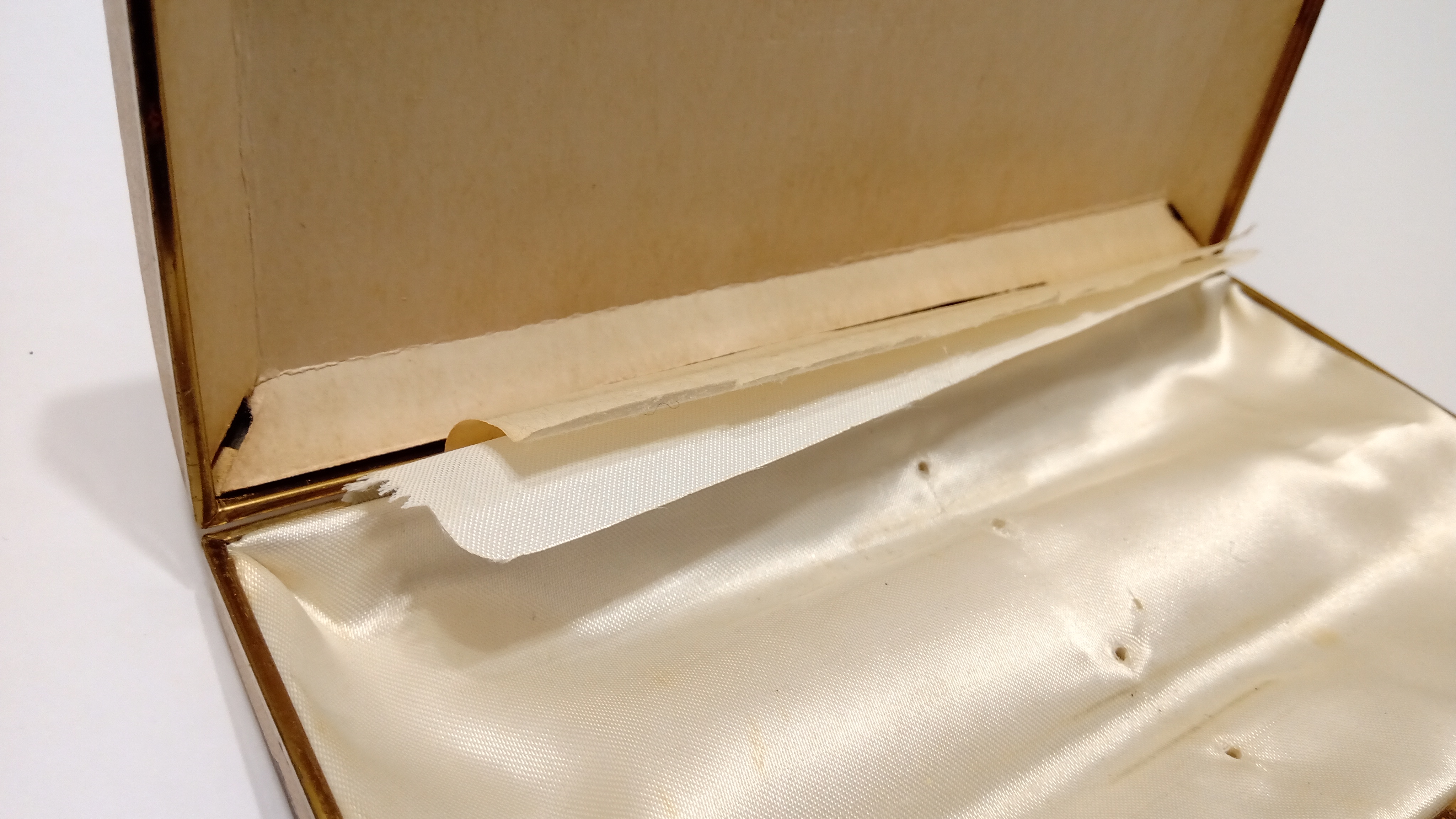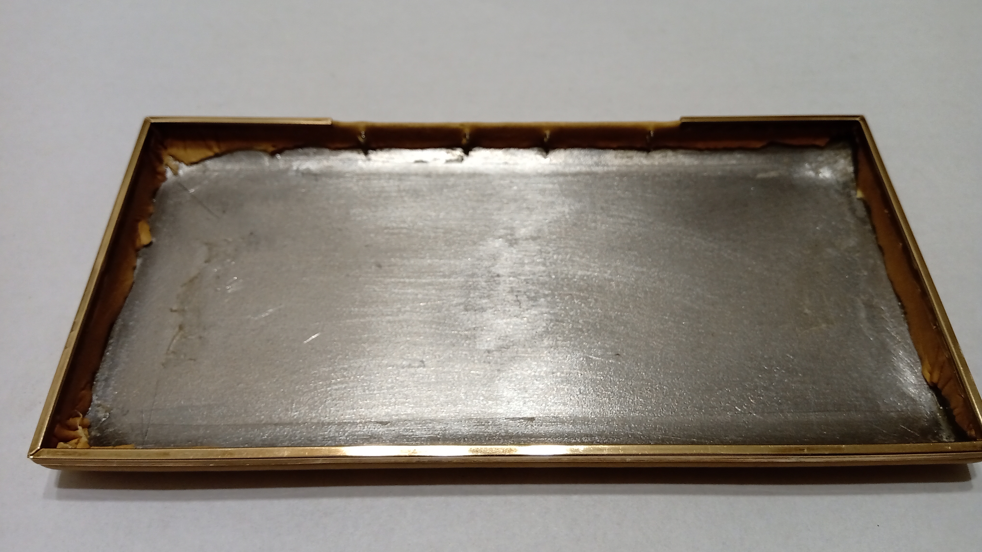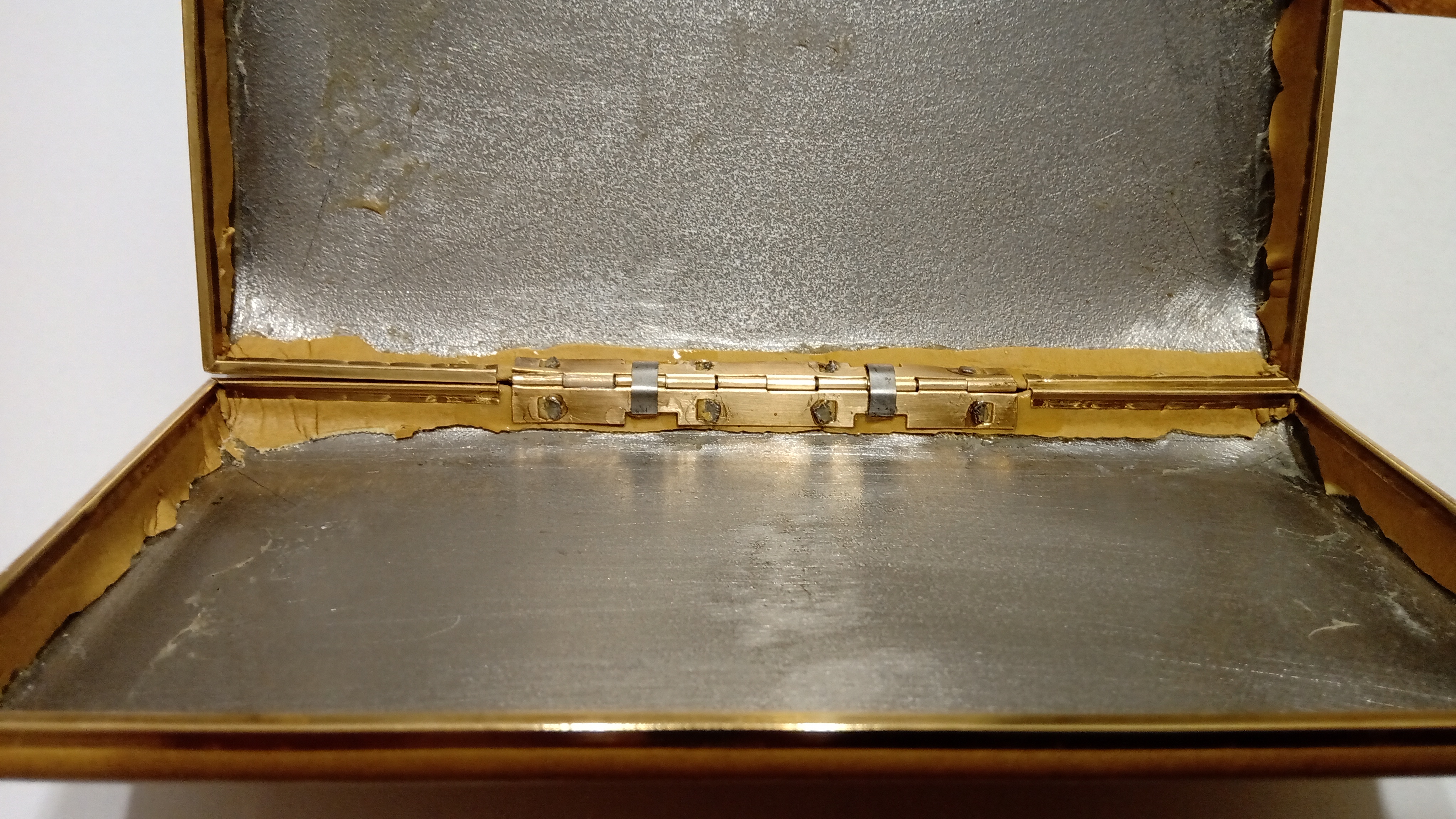 Ho quindi tolto il coperchio aderito al metallo, osservando che sia i materiali utilizzati per la cerniera che per il bacchette erano di altissima qualità, così come il metallo stesso della scatola, che presentava una curiosa "granatura" in maniera quasi perfetta stato di conservazione...