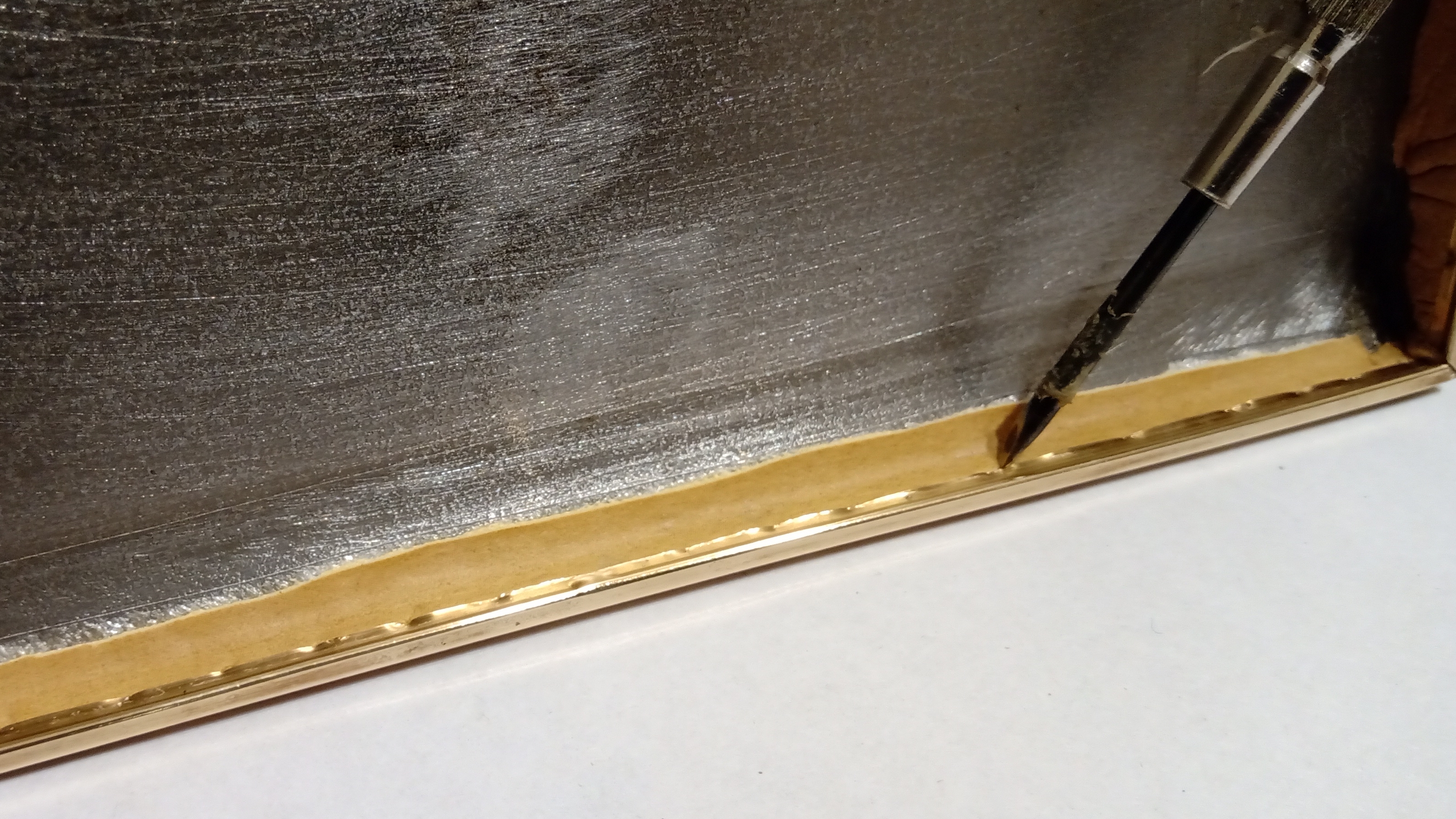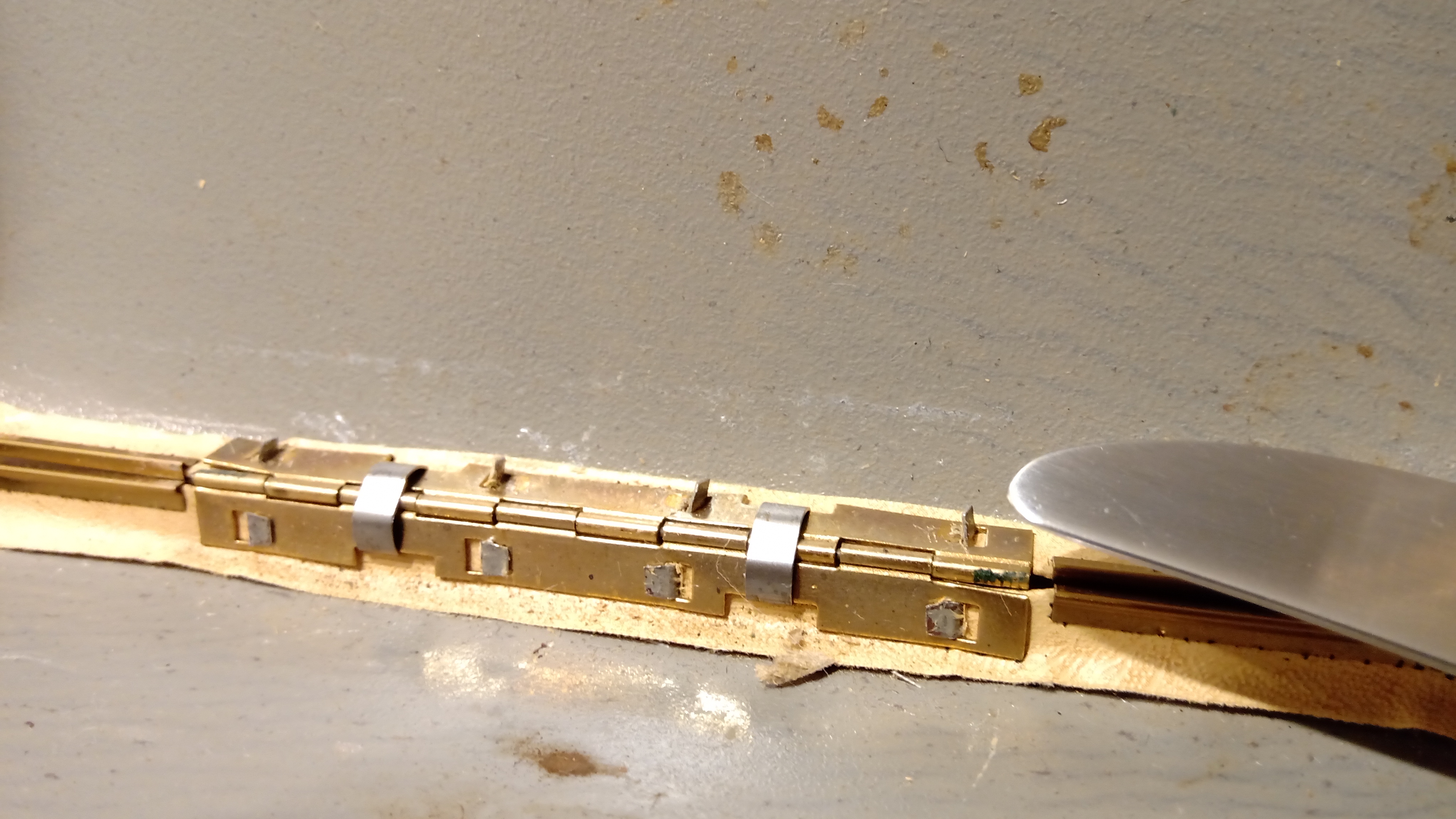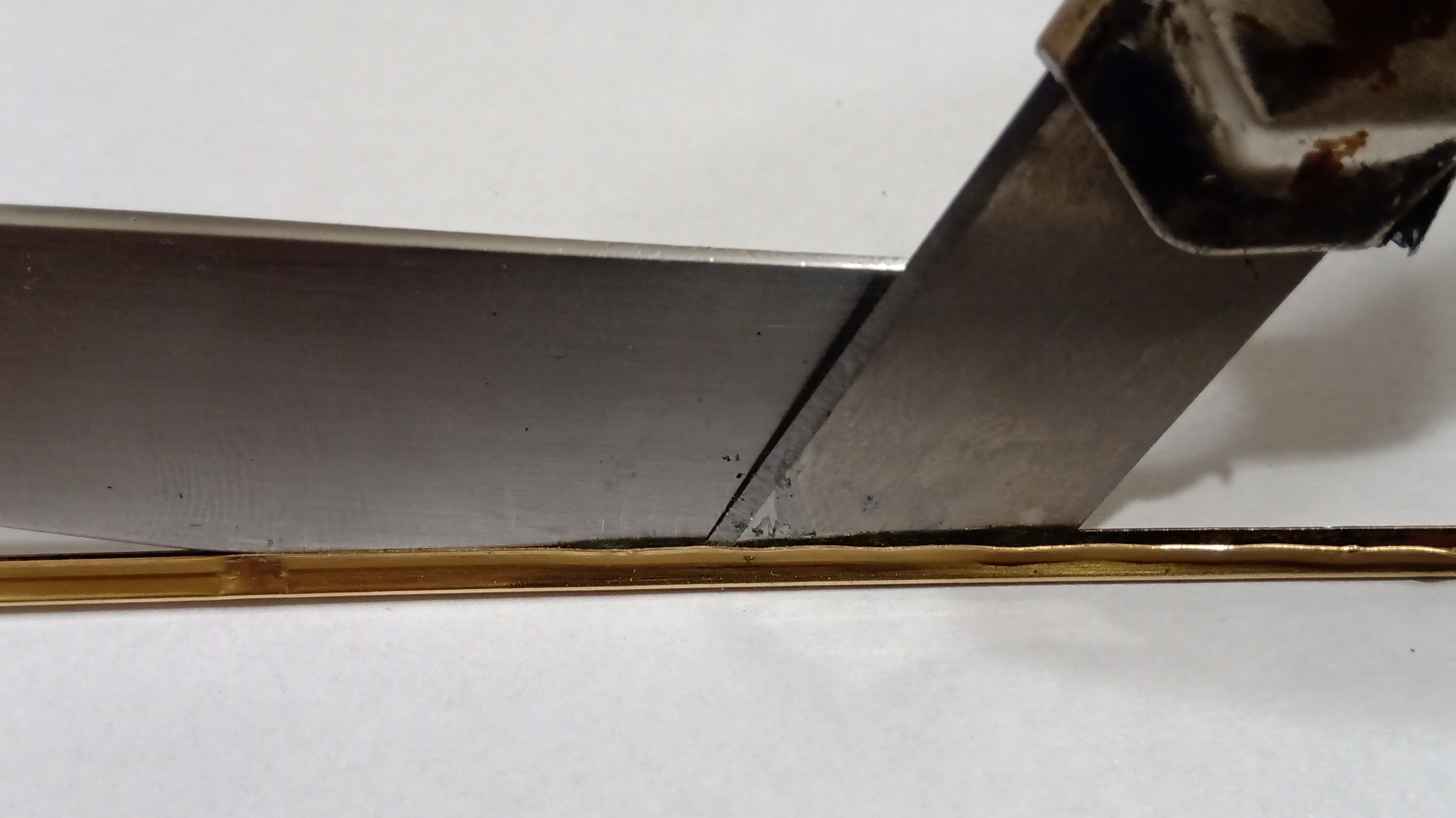 Poi ha toccato la collocazione delle bacchette di ottone, dovendo prima allargare e aprire l'ancoraggio, per il quale ho utilizzato due lame, una di riserva che ho appoggiato contro il bordo esterno, impedendo che si segnasse, e una interna per fare leva sulla parte esterna lama e allargare il canale...
