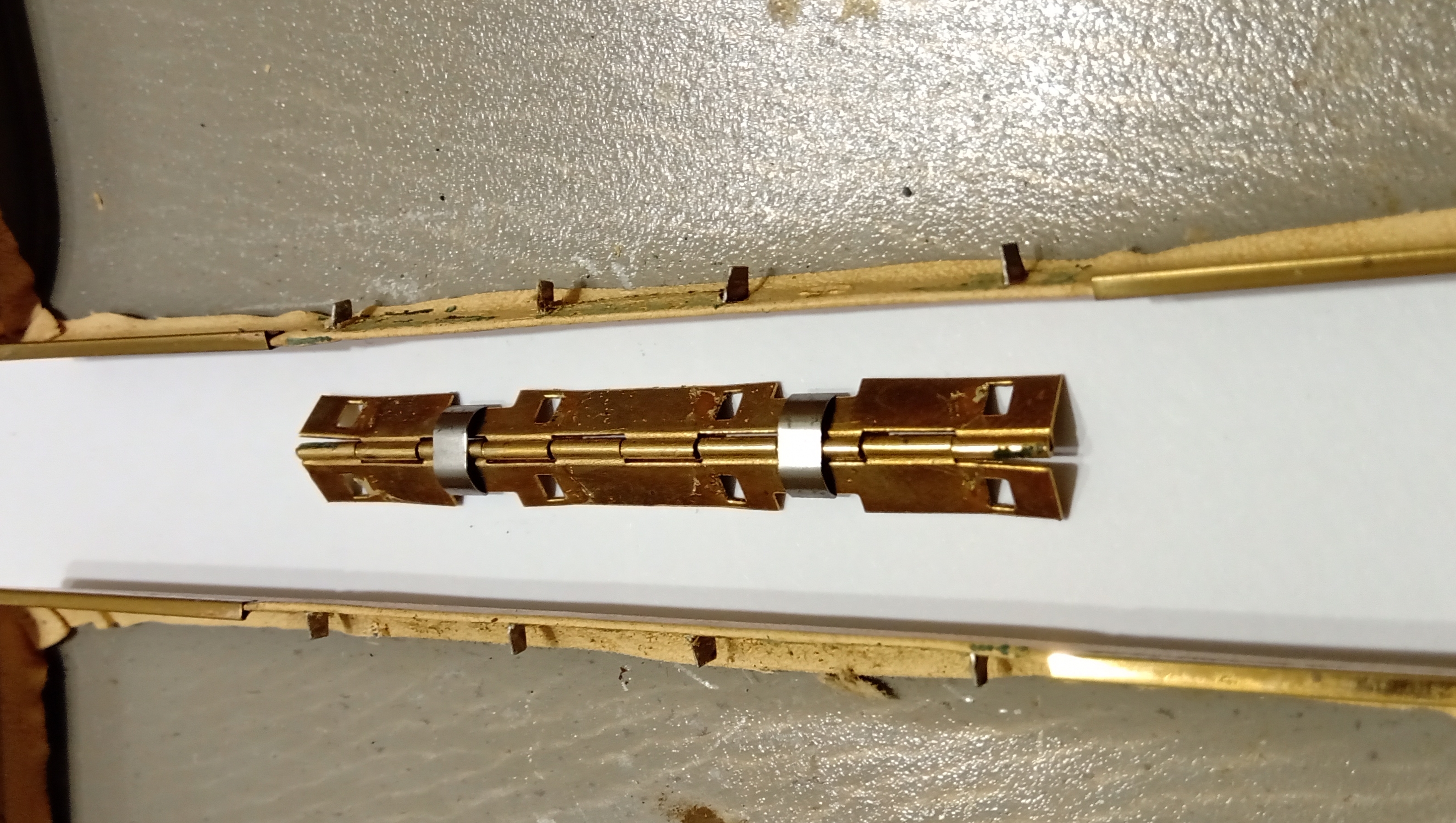 Una volta che l'inchiostro si è asciugato, ho potuto riposizionare la cerniera, fissandola con qualche goccia di cianoacrilato sulle linguette, dopo aver verificato il corretto allineamento tra il coperchio e la base...