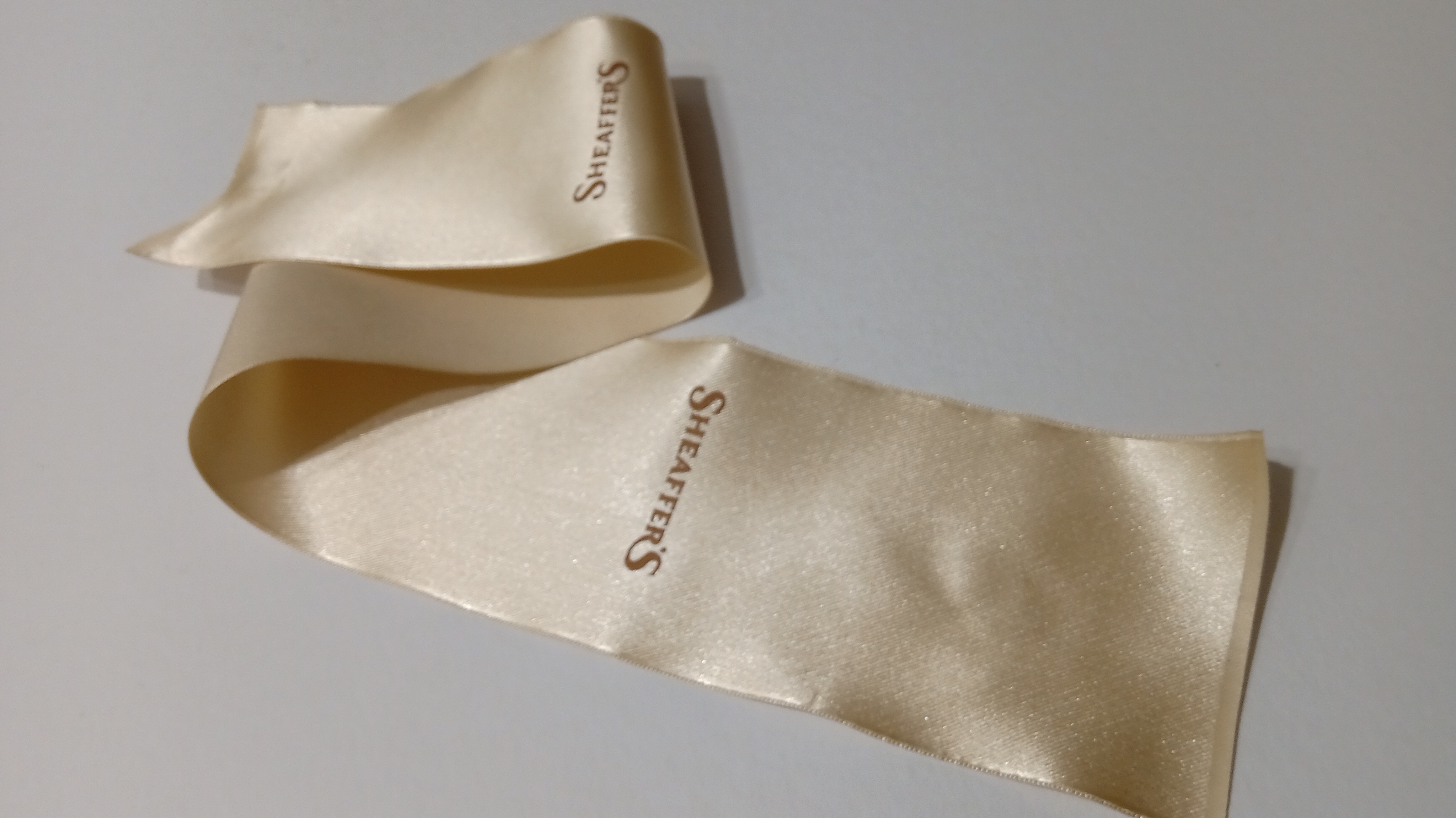Infine, abbiamo stampato un nastro protettivo che abbiamo inserito all'interno della scatola, una stampa che è stata realizzata con un inchiostro vinilico ramato su un nastro di raso...