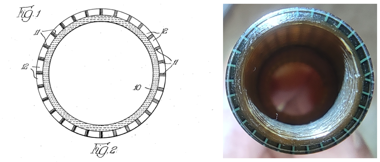 Dalla descrizione in brevetto, sembra di capire che l'idea fosse invece quella di comporre la decorazione direttamente in forma tubolare, montando le strisce, un po' come fosse un'opera di ebanisteria.