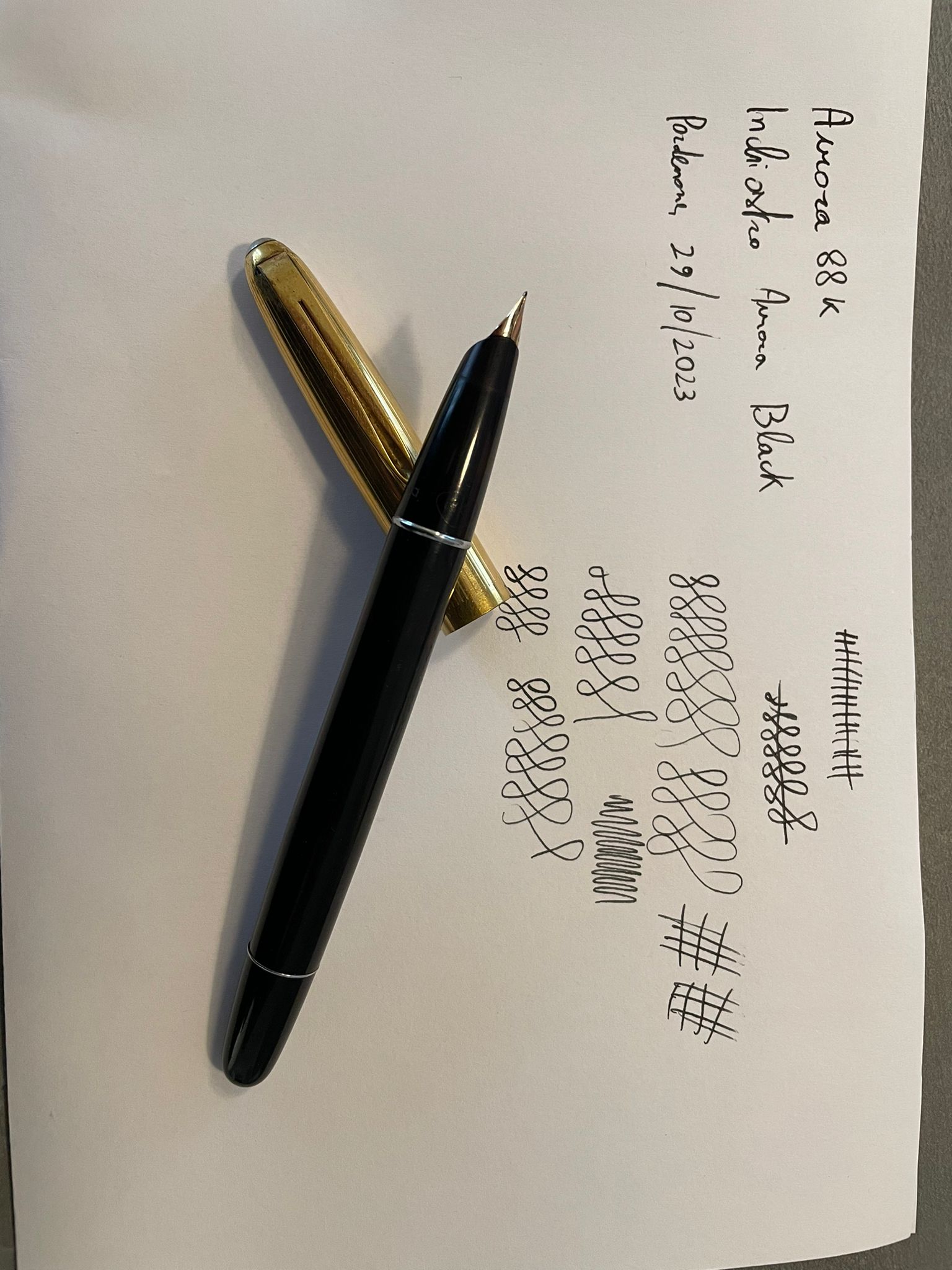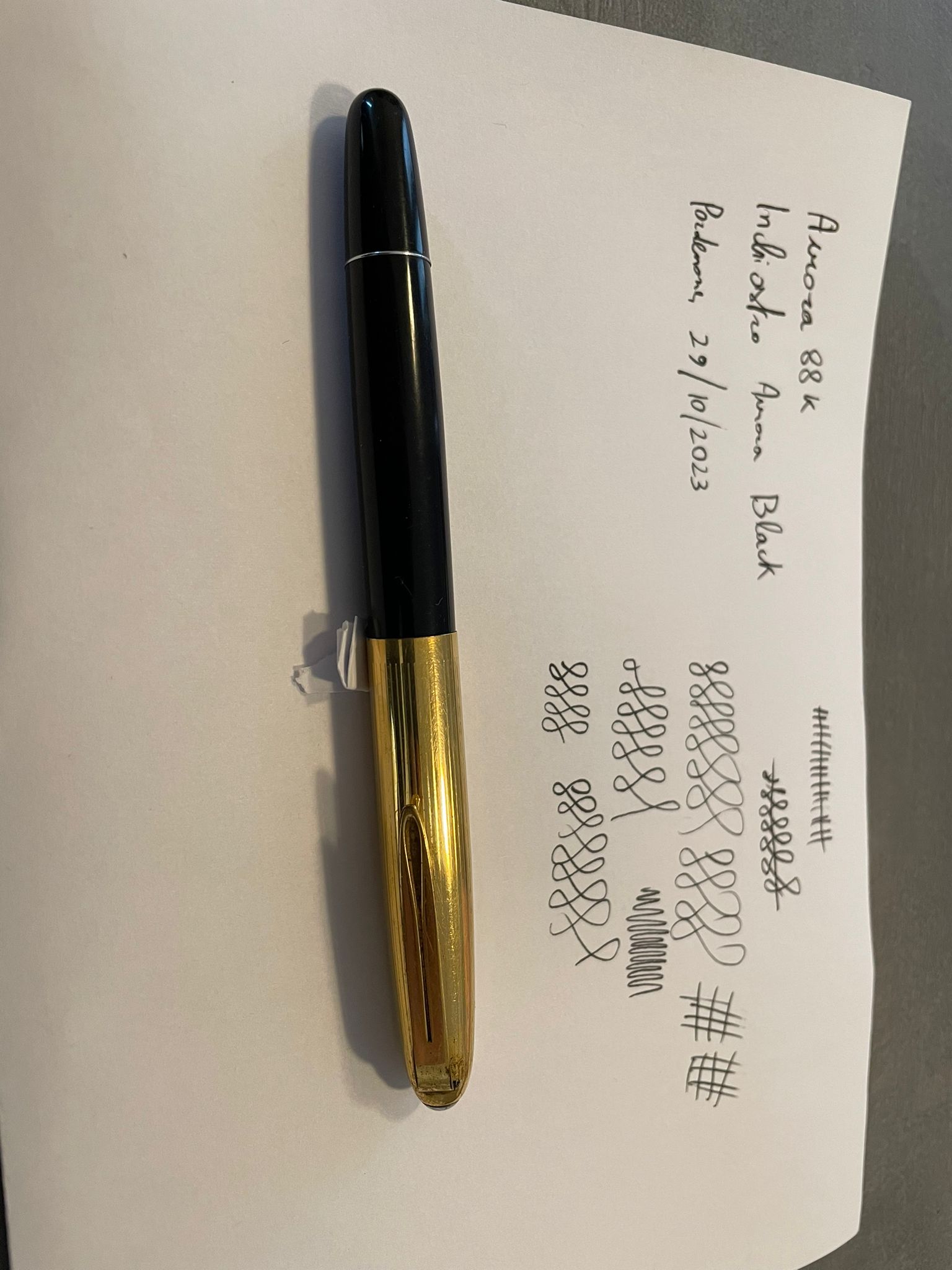 Come sempre, prima di inchiostrarla, provo una pulizia con acqua. Rimango un po' perplesso: quando avvito per buttare fuori liquido, sembra non esca nulla. Temevo per un problema di caricamento, tuttavia provo lo stesso a inchiostrare con inchiostro Aurora Black e il risultato alla fine si dimostra buono. Spero solo che col tempo questa sensazione che ho di fastidio al caricamento sparisca...
