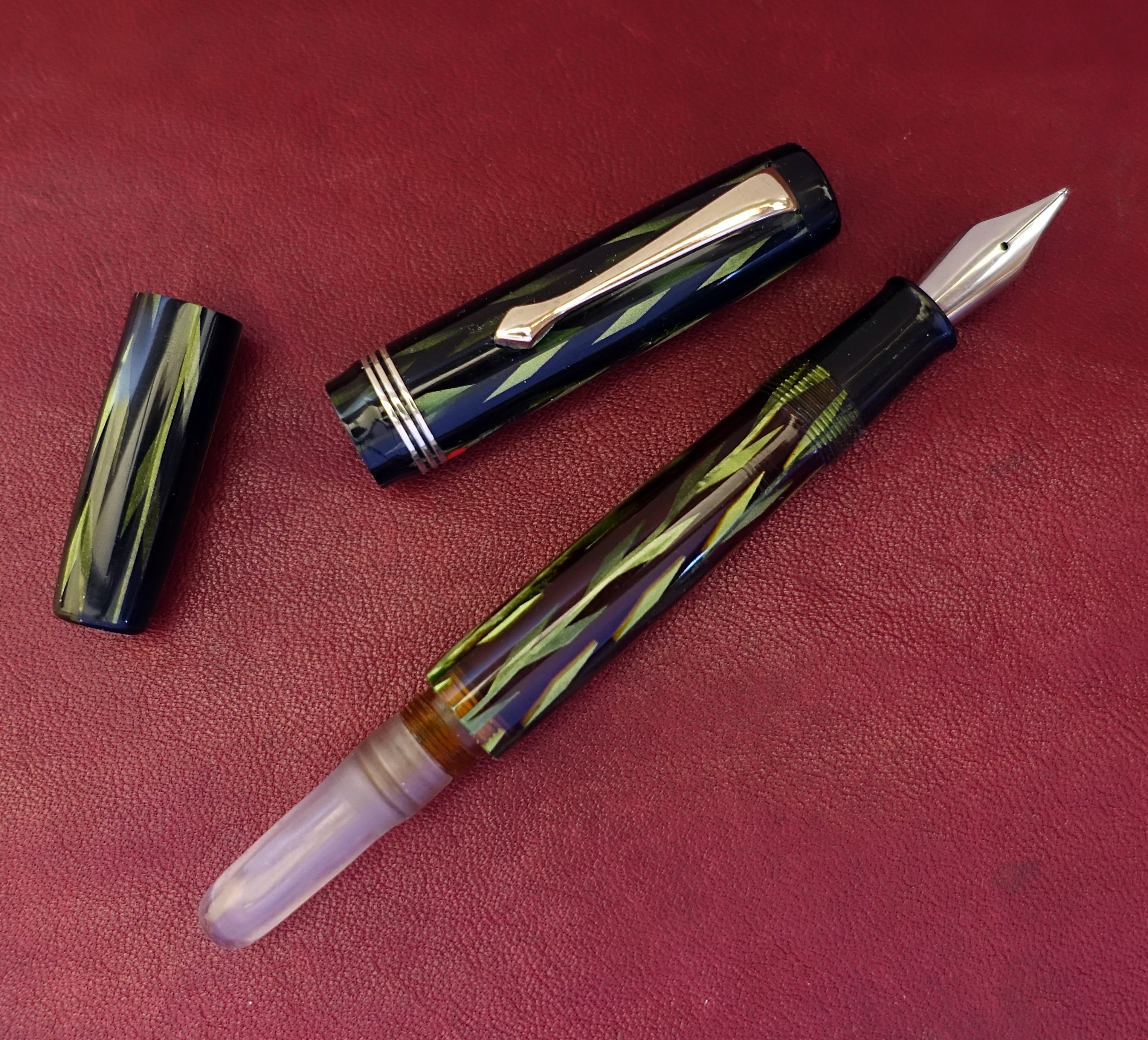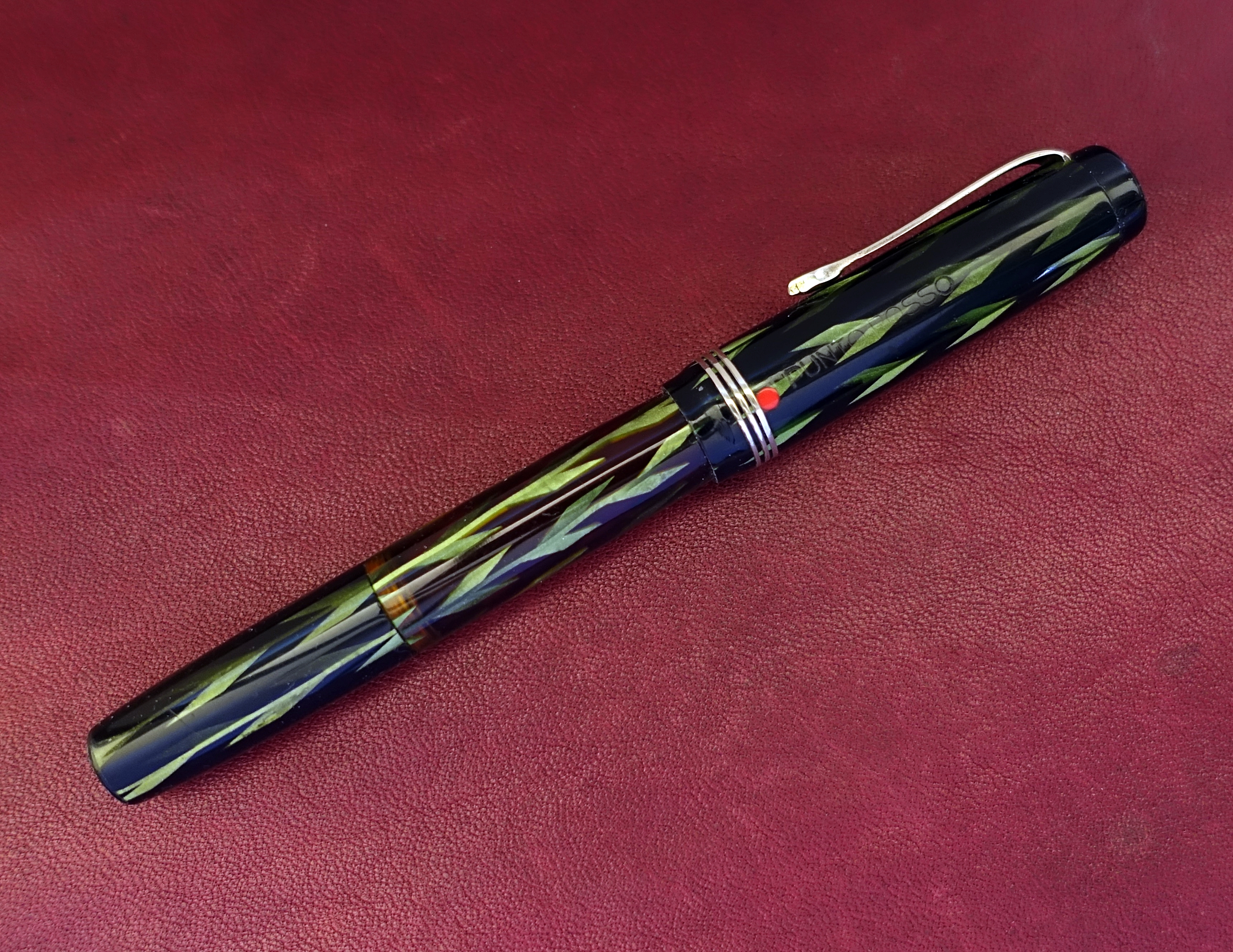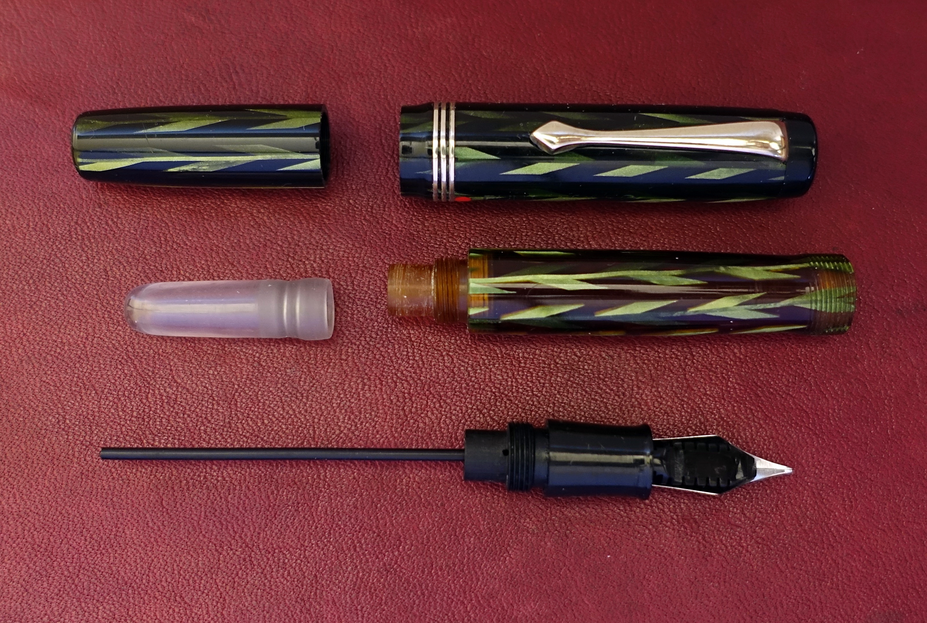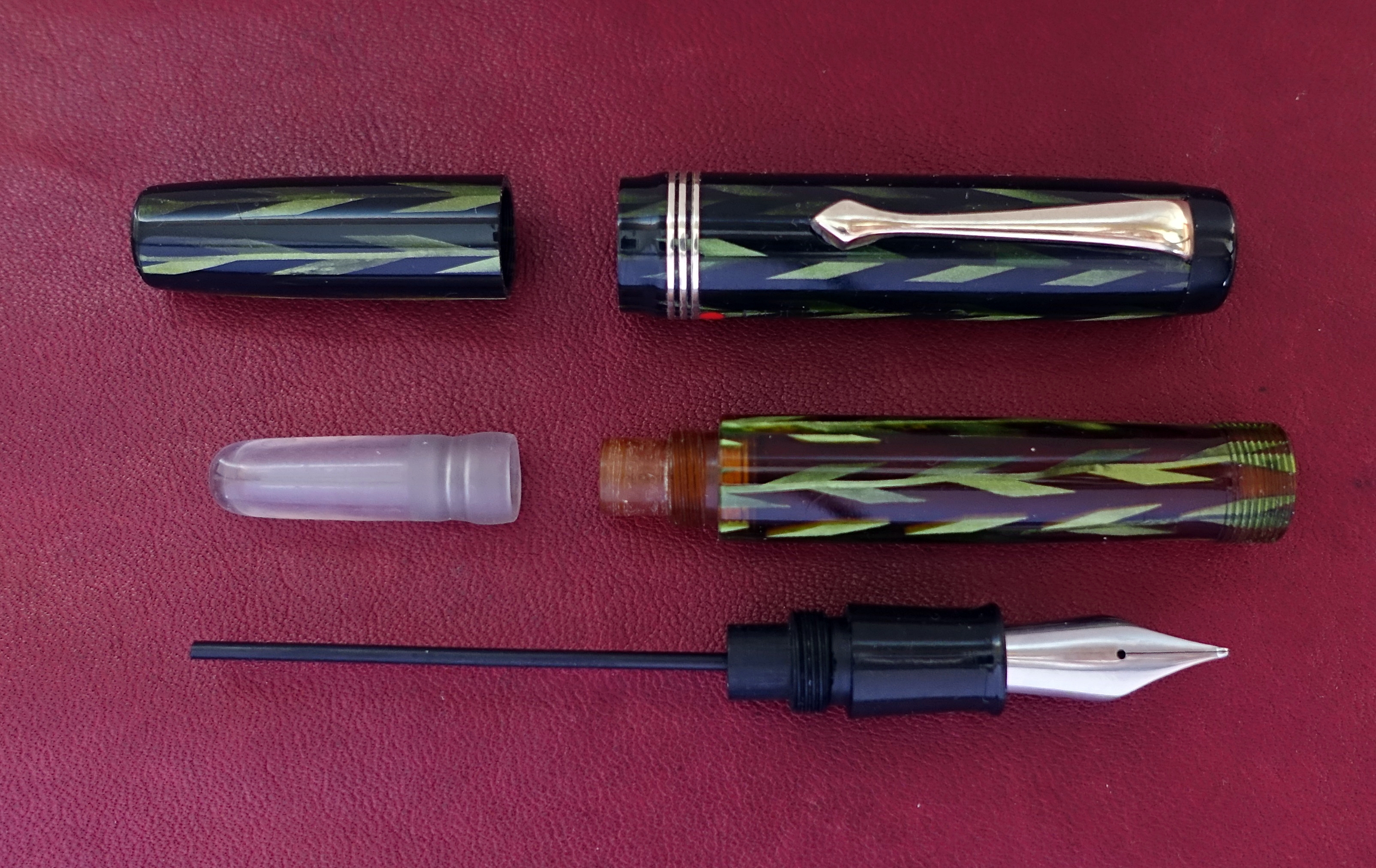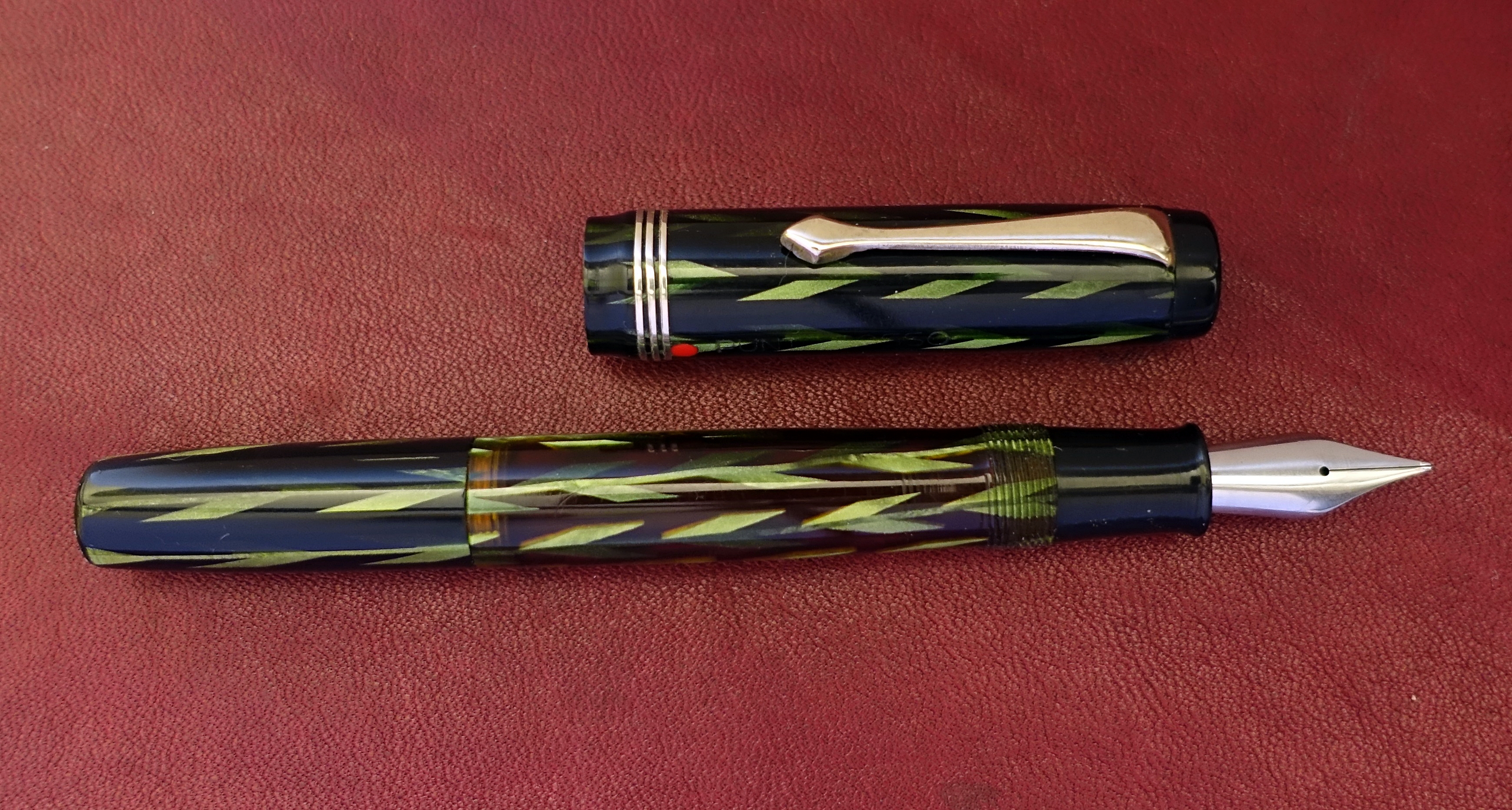 Il pennino che montava è un Freccia D'oro N.6, danneggiato e corroso, è stato sostituito momentaneamente da un pennino Cinese levigato il giusto necessario per cancellare il marchio, funziona bene, e per ora, Fà ch'et n'abi. (accontentati)