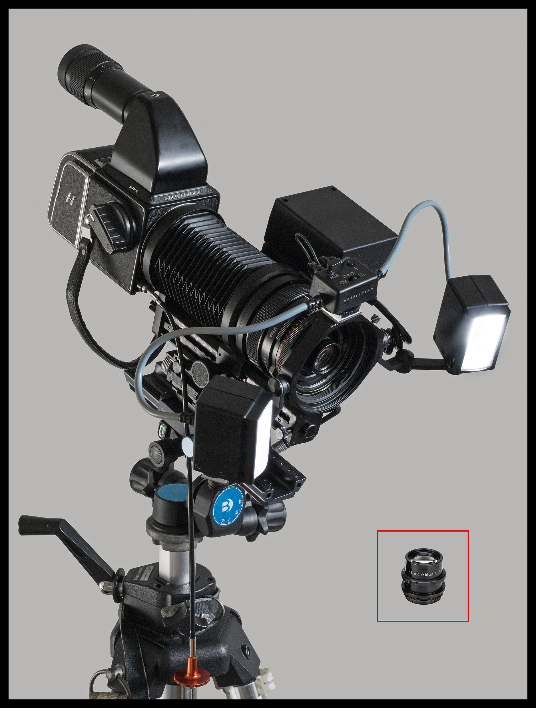 La fotocamera é montata su un soffietto di estensione, sul quale é collocato un otturatore originario della Hasselblad, adattato per accogliere un altro "piccolo dinosauro", un obiettivo Leitz Milar da 100mm, anch'esso disegnato (negli anni Cinquanta) per la macro- e micro-fotografia (lo si puó vedere nel riquadro rosso). L'illuminazione é fornita da un flash macro di Hasselblad, che non usavo da tempo. Permette di avvicinare molto al soggetto i due lampeggiatori, che nella realtà ho coperto con plastica bianca traslucida perché emettessero una luce piú diffusa.