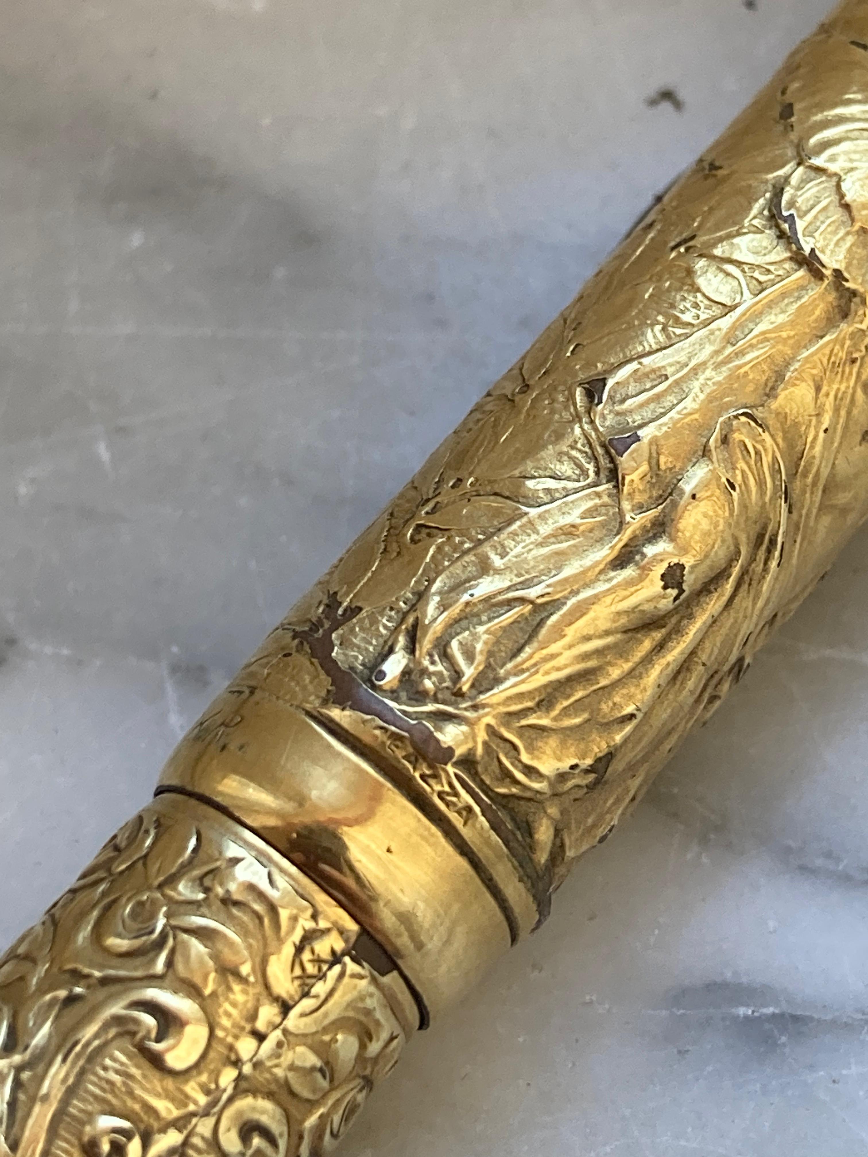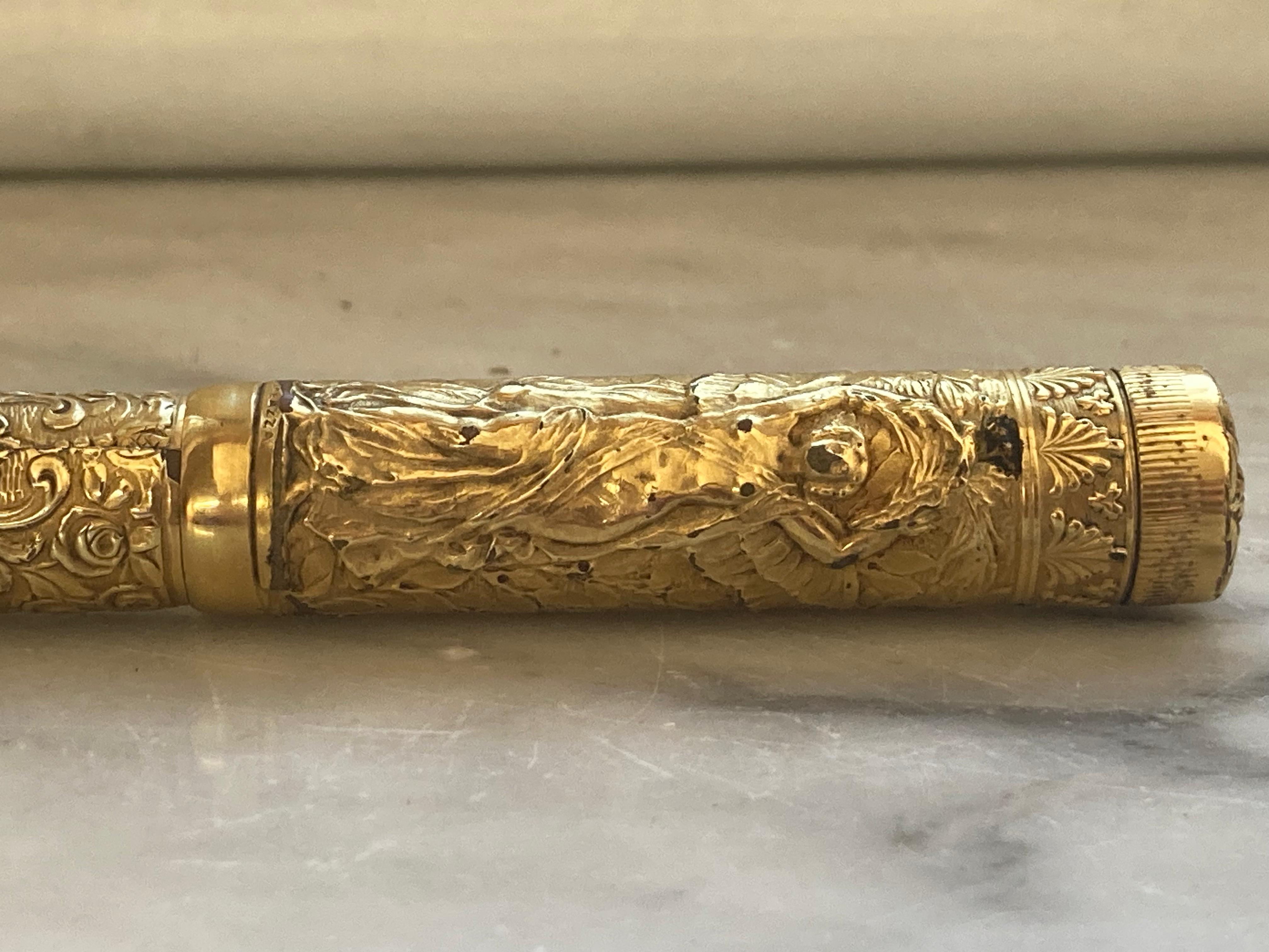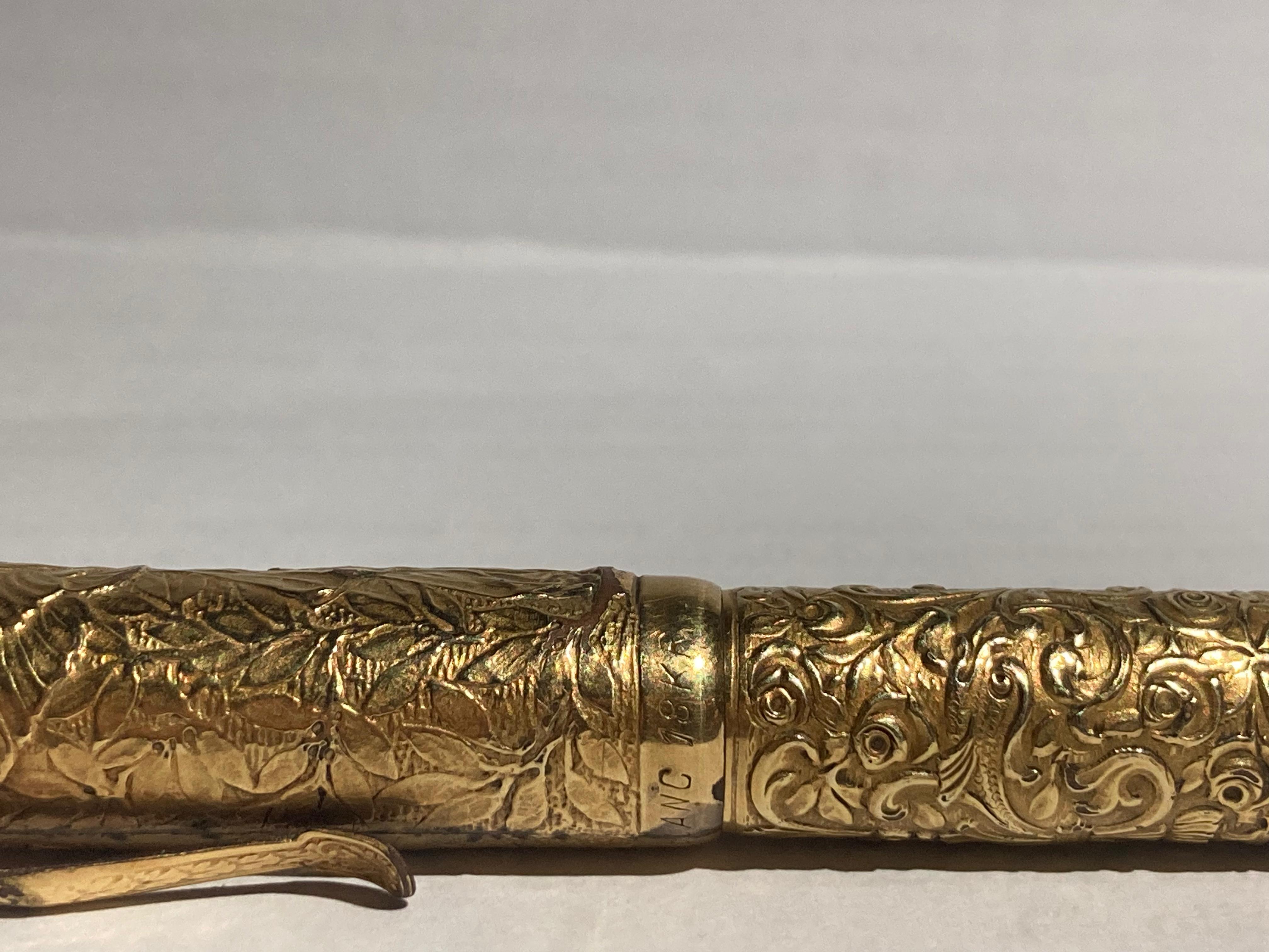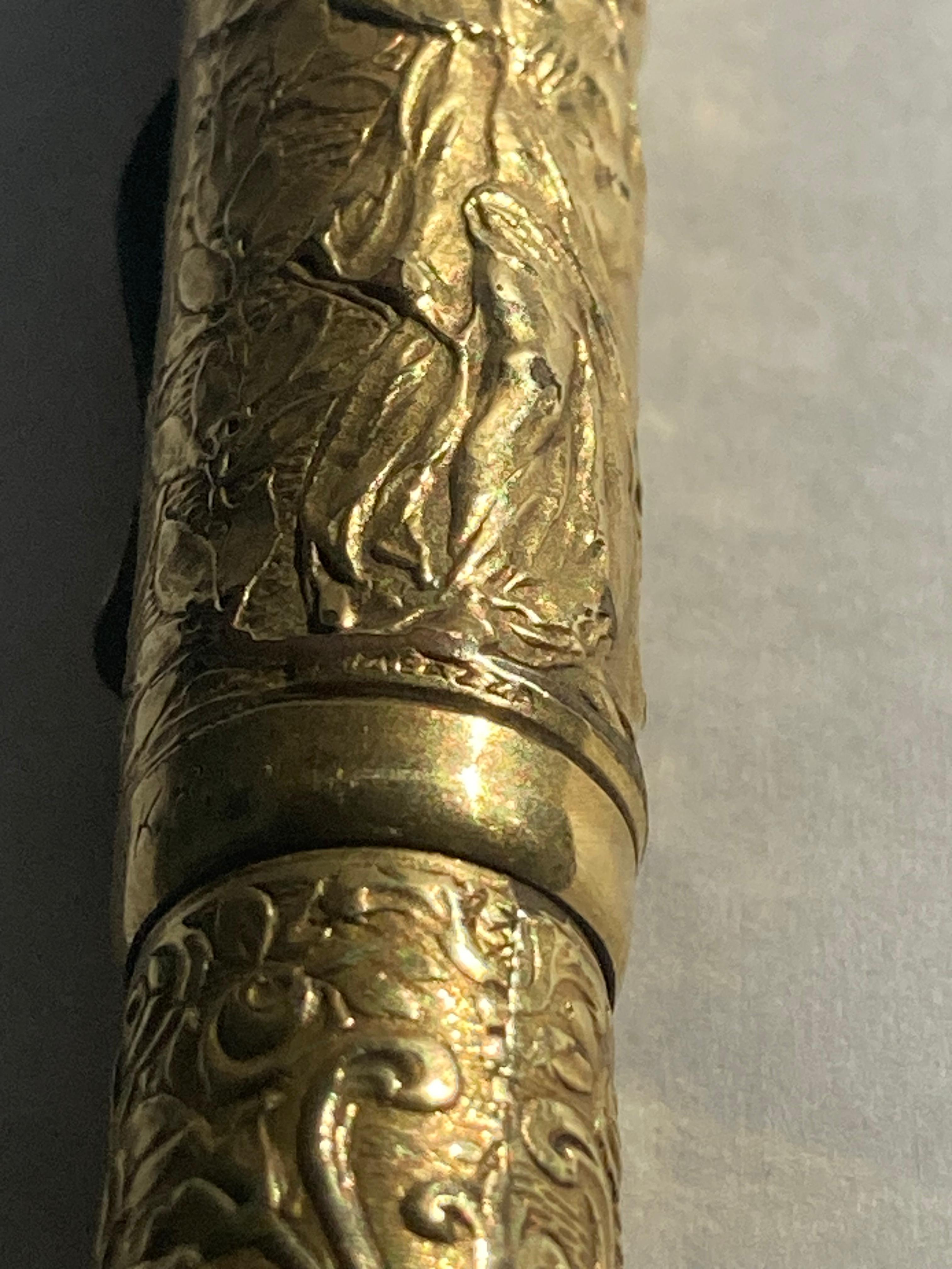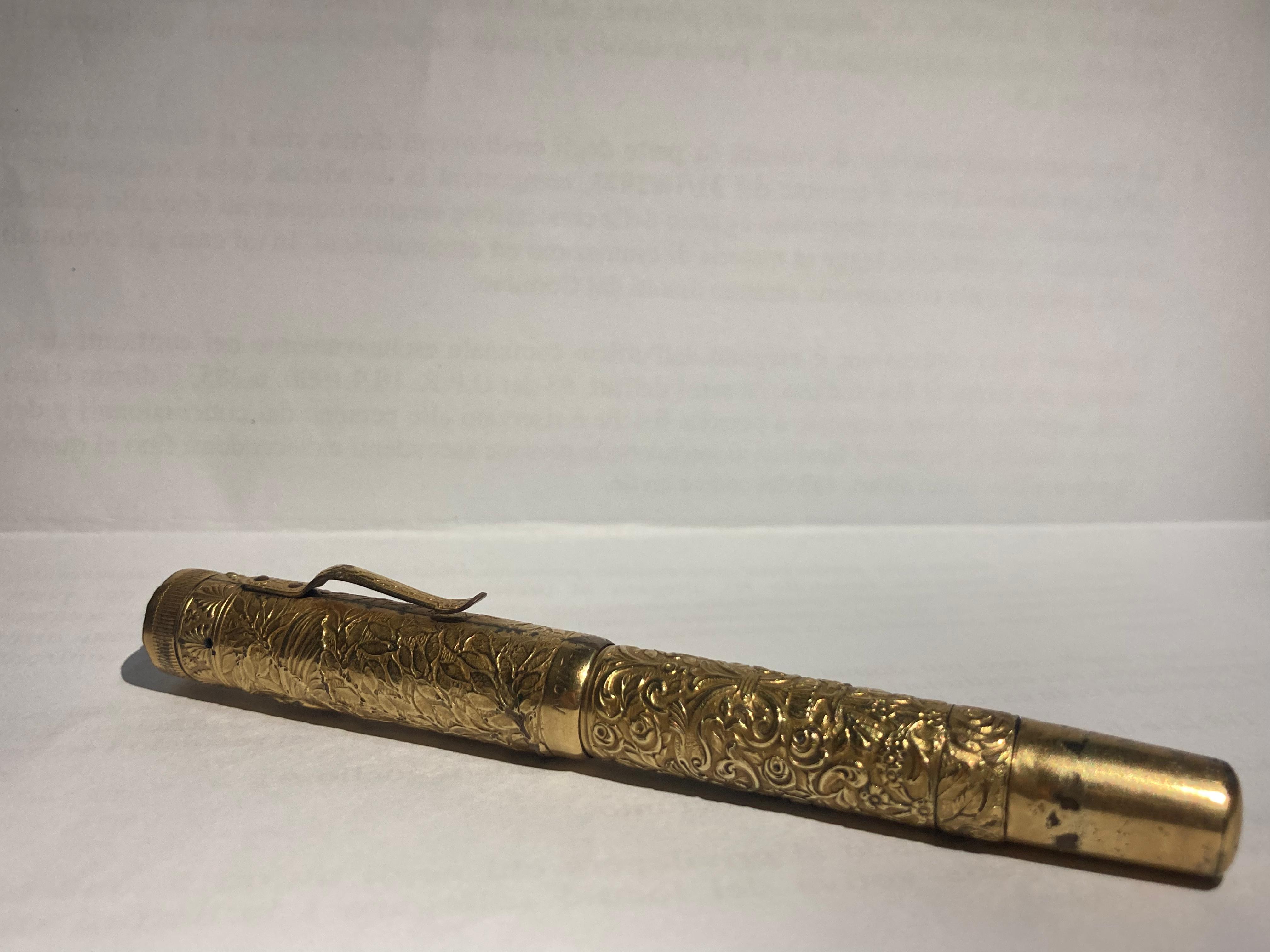 purtroppo darti informazioni storiche precise sulla tua penna, o meglio più precise di quelle che hai già, è molto difficile, i dati storici di quel periodo sono estremamente scarsi. Il modello è una classica rientrante No.2, rivestita appunto in maniera magistrale. Ne trovi diverse rappresentate in questo catalogo che ho scansionato anni fa prima partisse per la sua destinazione finale: