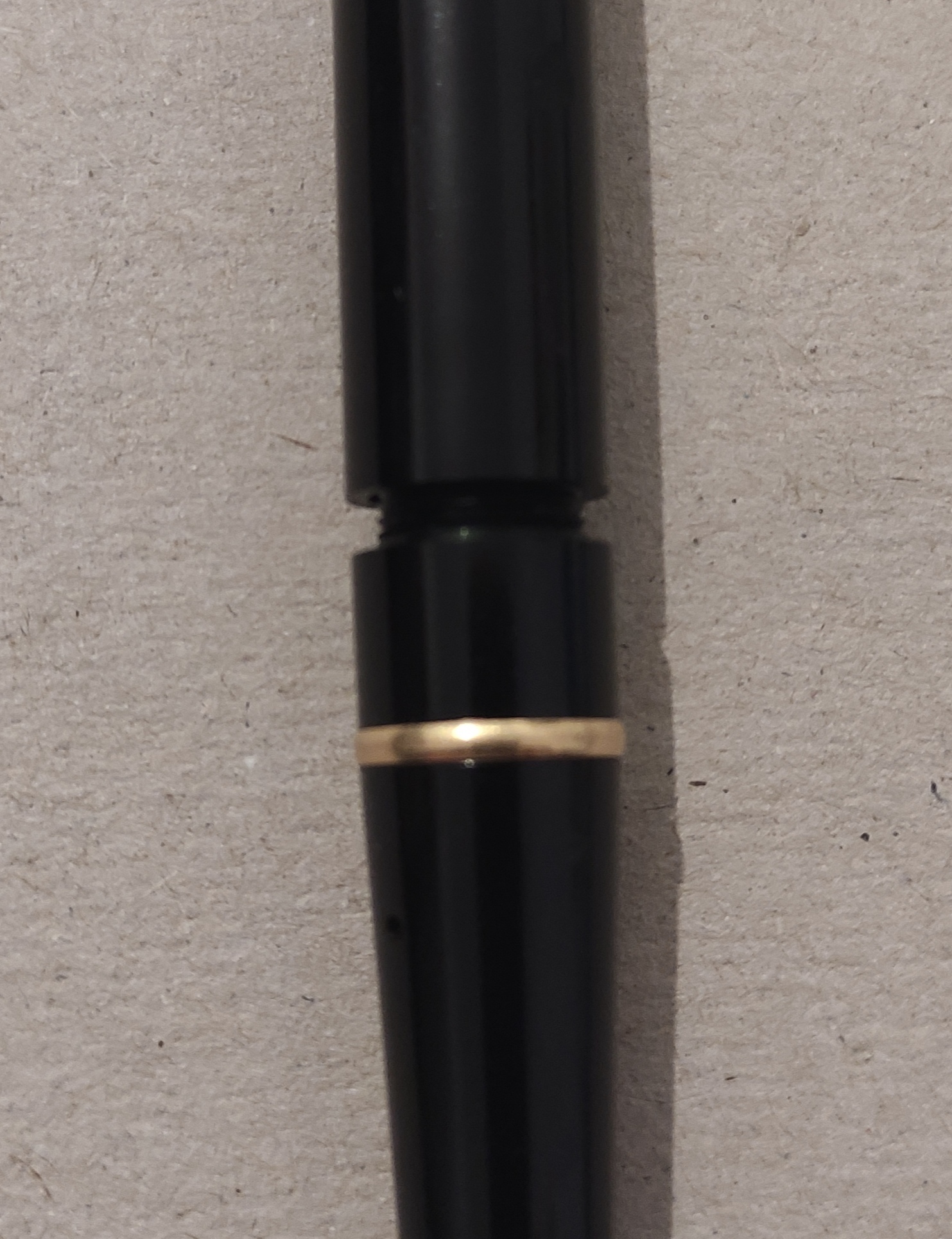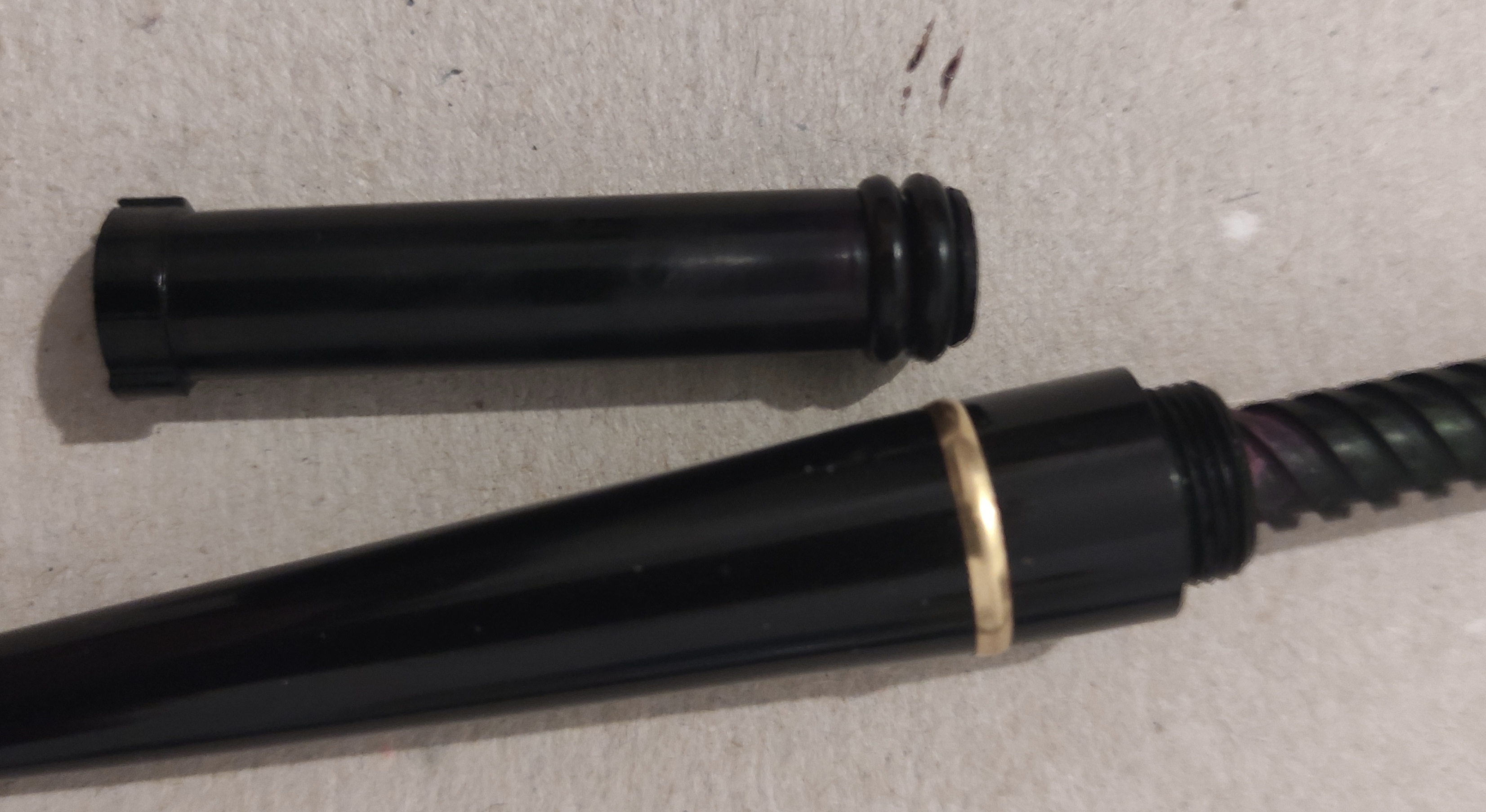 No, purtroppo un cm. sotto l'anello (che nella mia versione è piatto, ossia a filo col fusto) non devo segni di giunture. Ci sono invece due forellini sul codale, che sicuramente ospitano una spinetta che lo trattiene. Unico segno di giuntura lo trovo sotto la finestra di ispezione per l'inchiostro, a 7/8 mm dal puntale.