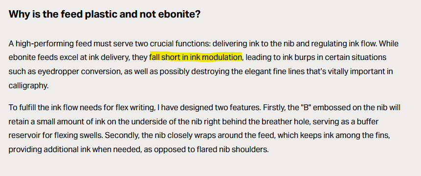 Allego qua una foto della sezione FAQ del produttore di penne bluedew che motiva la sua scelta di usare plastica invece di ebanite, a suo dire parrebbe che la scelta di usare plastica sia pratica dato che lui favorisce una ottimale regolazione del flusso che pare sia garantita dalla plastica. La sua opinione però è contraddetta dalle persone che hanno usato la penna e sostengono che la plastica non sia stata la scelta ottimale.