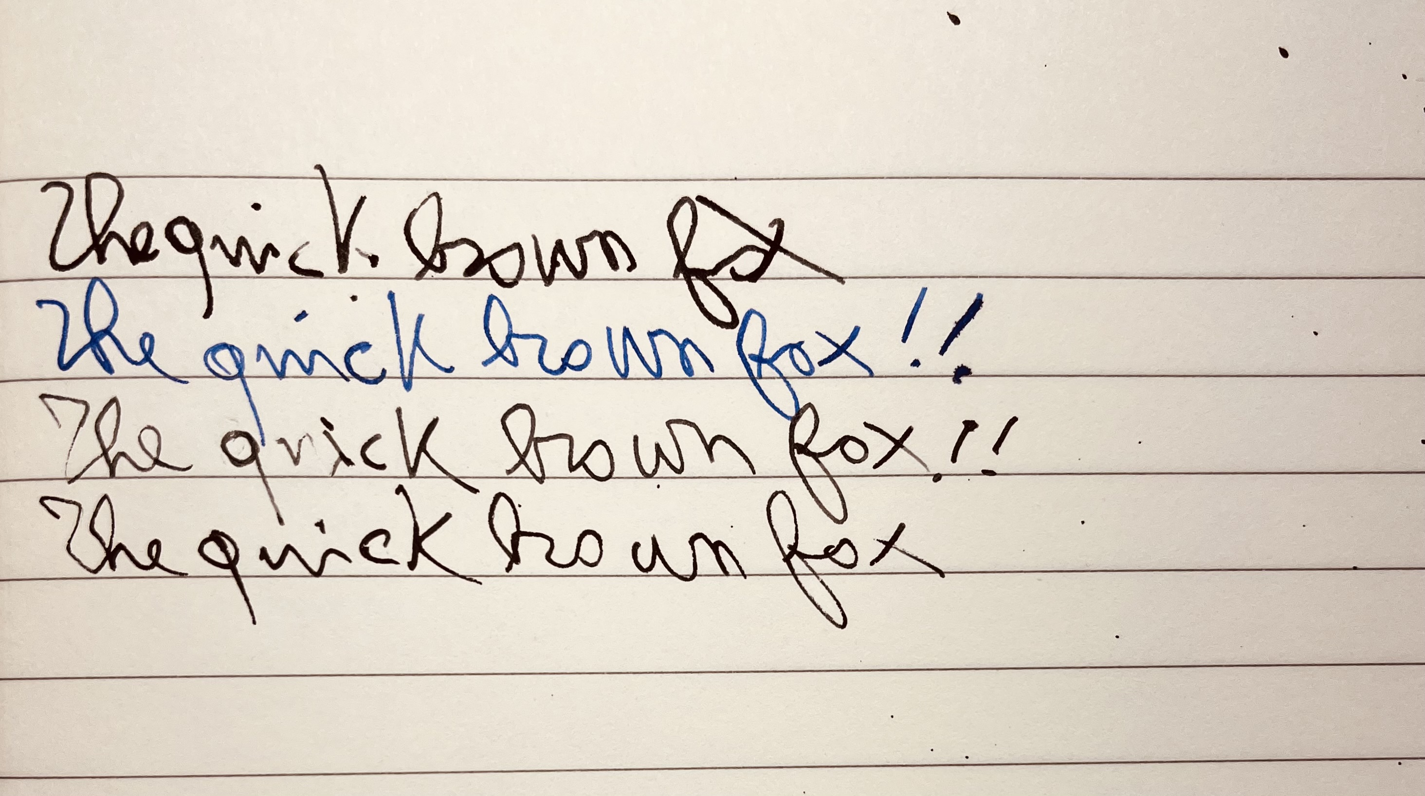 I pennini provati scivolano bene e le parole asciugano abbastanza in fretta, io comunque essendo mancino uso sempre la carta assorbente.