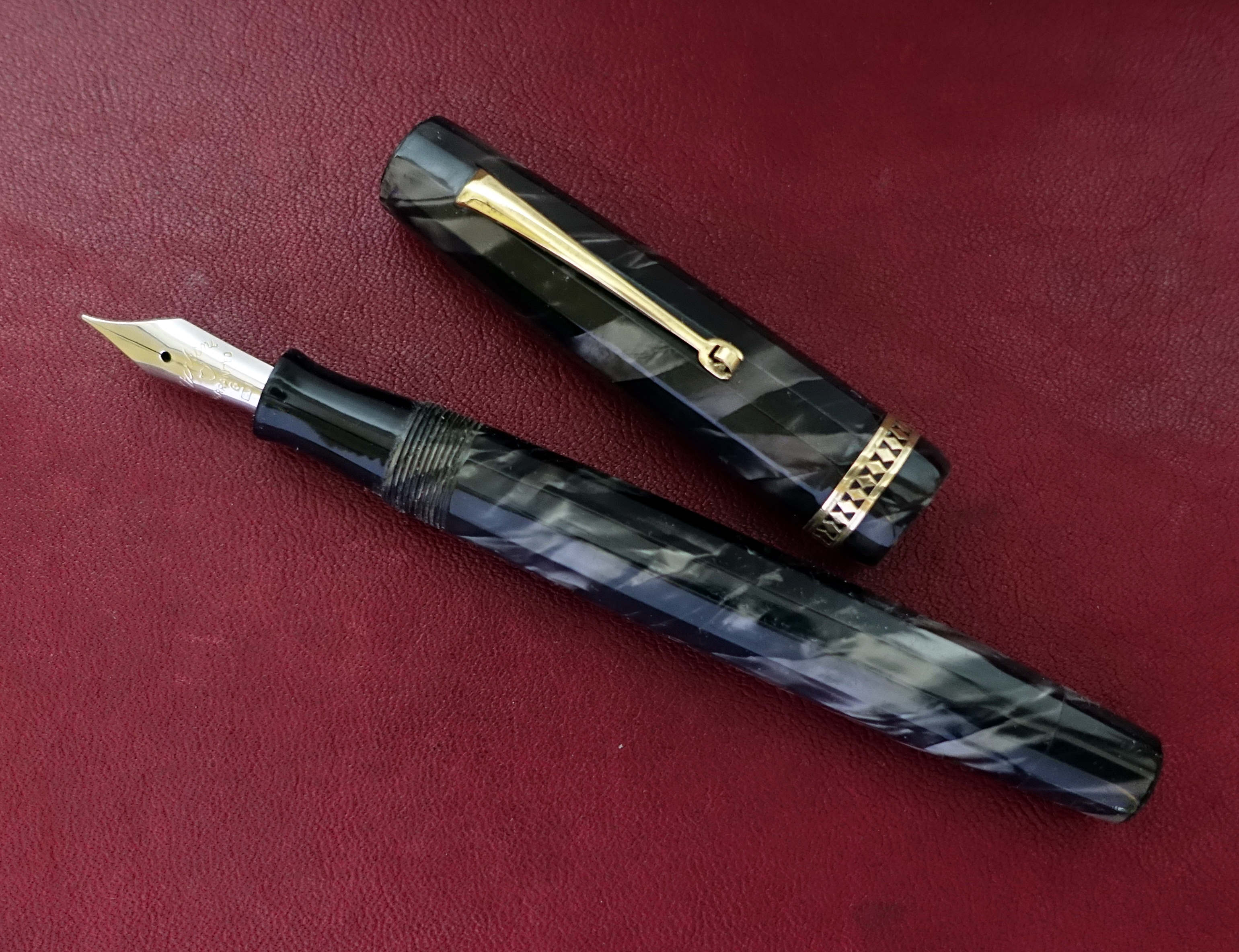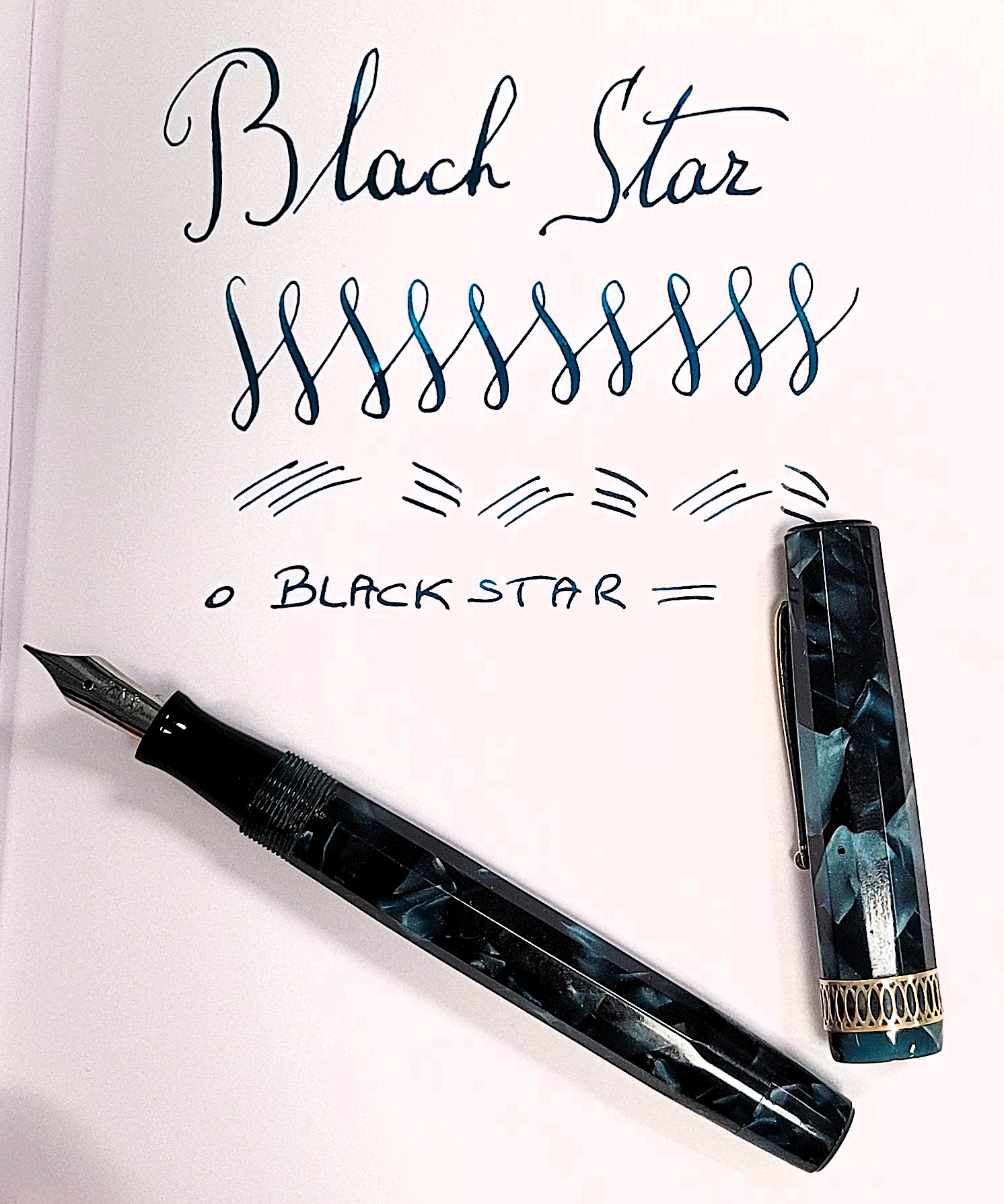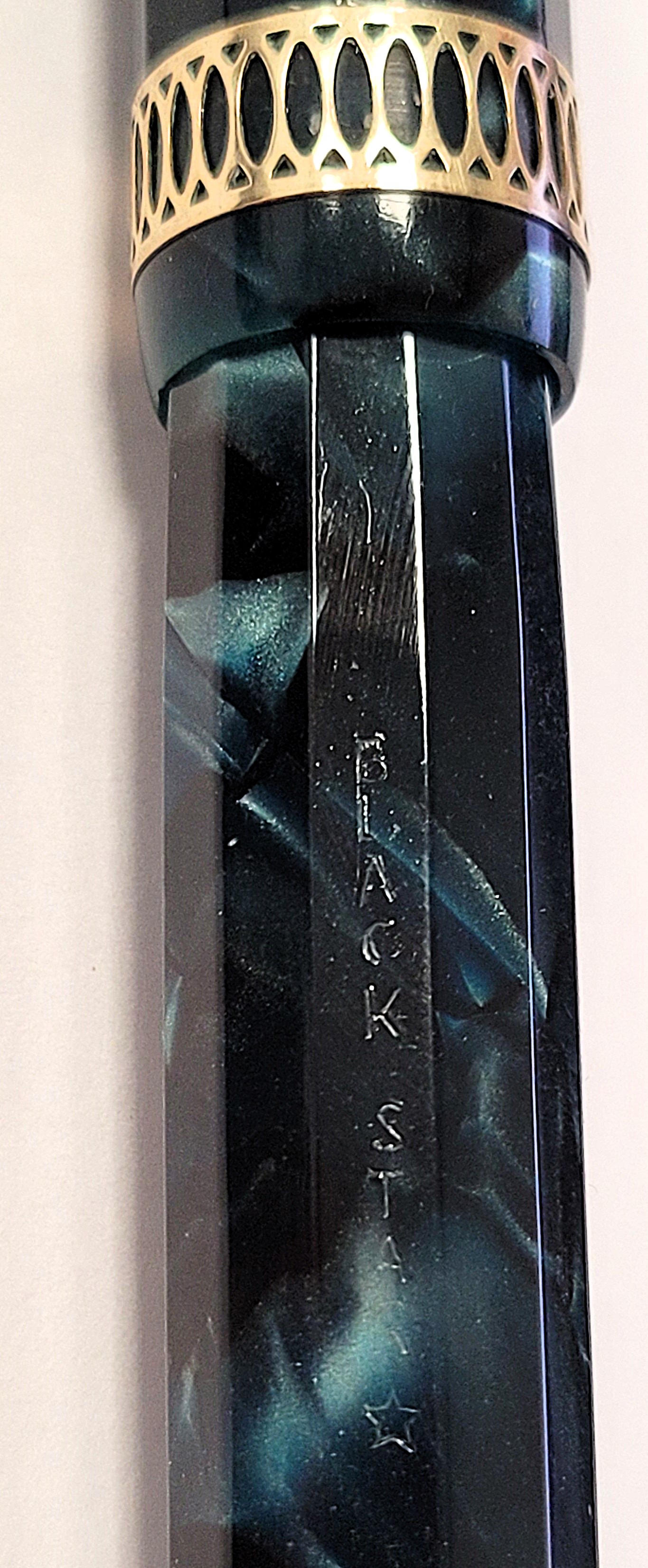 vi presento la mia ultima acquisizione, una stilografica di un marchio poco conosciuto: Blach Star Ma come riportato nel titolo è Blach o Black? Con la H o con la K? Ardua sentenza. La cosa strana di questa penna è che sul fusto vi sia incisa la scritta “BLACK STAR” seguita da una stella mentre sul pennino è riportato BLACH STAR, forse a quei tempi avevano un po’ le idee confuse? Dubito siano due marche distinte e che il pennino sia stato sostituito per “assonanza” o pensando fossero della stessa marca. BLACH STAR è stato sicuramente un produttore “minore” italiano di penne stilografiche di fascia medio bassa che, forse, in qualche sporadico caso si concedeva qualche velleità realizzando modelli più curati. Questo in particolare potrebbe essere datato intorno agli anni ’30 tenendo in considerazione la forma “flat-top”, il sistema di caricamento a pulsante e l’alimentatore bombato liscio. Penna di taglia Senior è lunga 14 cm chiusa e 12 cm senza cappuccio è in celluloide sfaccettata dodecagonale ricavata da fogli sovrapposti molto bella, marmorizzata azzurro/blu scuro con le due estremità, cappuccio e tappino che nasconde il pulsante di carica, che terminano a sezione circolare chiuse da due tappini sottili in ebanite nera. Molto elegante la veretta del cappuccio di forma circolare, non dodecagonale, e di generose dimensioni realizzata con un motivo ellittico in stile art-decò sicuramente copiato da altri modelli dell’epoca. La clip invece è liscia a ruzzolina.